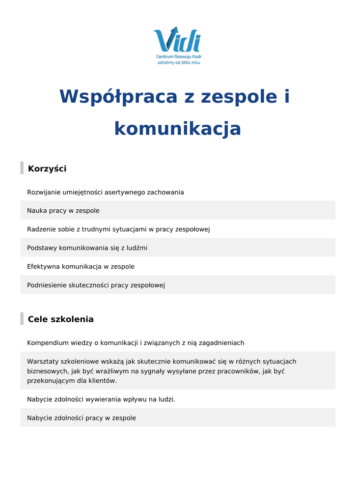Współpraca z zespole i komunikacja Korzyści Rozwijanie umiejętności asertywnego zachowania Nauka pracy w zespole Radzenie sobie z trudnymi sytuacjami w pracy zespołowej Podstawy komunikowania się z ludźmi Efektywna komunikacja w zespole Podniesienie skuteczności pracy zespołowej Cele szkolenia Kompendium wiedzy o komunikacji i związanych z nią zagadnieniach Warsztaty szkoleniowe wskażą jak skutecznie komunikować się w różnych sytuacjach biznesowych, jak być wrażliwym na sygnały wysyłane przez pracowników, jak być przekonującym dla klientów. Nabycie zdolności wywierania wpływu na ludzi. Nabycie zdolności pracy w zespole Program Zespół Cechy efektywnego zespołu. Na czym polega praca zespołowa Pozytywne i negatywne aspekty istnienia zespołu Analiza słabych i mocnych stron zespołu; co możemy ulepszyć? Osobowość a rola w zespole Istota i znaczenie pracy zespołowej Praca zespołowa jako kluczowy element sukcesu Wpływ pracy zespołowej na efektywność organizacji Role pojawiające się w grupie i ich znaczenie dla pracy zespołu Komunikacja w zespole Zasady procesu komunikacji Dobre i złe nawyki komunikacyjne Najczęściej popełniane błędy podczas komunikacji Komunikacja werbalna – jakim jesteś słuchaczem (aktywne słuchanie) Świadomy i nieświadomy poziom komunikacji Techniki wywierania wpływu Podstawy komunikowania się z ludźmi Komunikowanie się, interakcja, komunikat, przepływ informacji - podstawowe pojęcia Techniki radzenia sobie z trudnymi społecznie zachowaniami partnerów Gotowość do dialogu - utrzymanie kontaktu ( skrzynka kontaktowa) Bariery komunikacyjne 7 zasad kształtowania wypowiedzi Typy i style komunikatów Automatyczne posługiwanie się nawykami językowymi Stosowanie profesjonalnego, ale zrozumiałego języka Znaczenie nazw własnych w komunikowaniu Wyszczególnienia, podkreślenia, zaznaczenia - zasadność stosowania Konstruowanie komunikatu w sytuacjach stresogennych i kryzysowych Budowanie skutecznej argumentacji motywującej Partnerów do oczekiwanego działania, prawa i techniki perswazji Techniki radzenia sobie z trudnymi społecznie zachowaniami partnerów Bariery komunikacyjne jako jedne z głównych źródeł stresu Motywy postępowania, mechanizmy obronne, biologiczne podstawy psychologii konfliktu Asertywność w zespole Rozwijanie umiejętności asertywnego zachowania się w różnych sytuacjach społecznych Co ja mogę dać zespołowi, a co zespół może dać mi? - korzyści płynące z pracy zespołowej Metody angażowania innych w pracę zespołową Budowanie własnej motywacji do pracy w zespole Otwartości na zmiany- w otwartości na zmiany tkwi siła Omówienie przyczyn oporu i sposobów jego przezwyciężania - modyfikacje zachowań Poznanie emocji, jakie towarzyszą zmianom Przygotowanie się do pracy i działania - reagowanie na zmiany Poznanie zasad relacji międzyludzkich z uwzględnieniem relacji pracowniczych Techniki radzenia sobie z trudnymi społecznie zachowaniami partnerów Radzenie sobie z trudnymi sytuacjami w pracy zespołowej Konflikt - przeciwstawne poglądy drogą do kreowania nowych rozwiązań Natura emocji i ich znaczenia w relacjach międzyludzkich Jak się zgłosić Aby skorzystać z warsztatu i doskonalić swoje umiejętności proszę o przesłanie wypełnionego formularza zgłoszeniowego na adres e-mail [email protected] lub pod nr faxu 32 757 00 36 lub 32 470 11 75 bądź zadzwoń do nas 32 470 11 75.