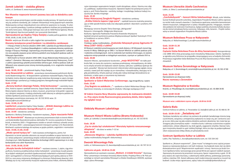 Zamek Lubelski – siedziba główna Lublin, ul. Zamkowa 9, www.muzeumlubelskie.pl Noc Muzeów rozpocznie koncert jazzowy Jazz.Lub na dziedzińcu zam‐ kowym Jazz.Lub to grupa prezentująca szeroko pojętą muzykę jazzową. W repertuarze poja‐ wią się zarówno standardy, jak i ciekawe interpretacje mniej popularnych utworów. Wykonawców cechuje indywidualność oraz odmienne spojrzenie na muzykę. To właś‐ nie te czynniki powodują, iż podczas jednego spotkania możliwe jest przedstawienie tak wielu barw jazzu. Stała grupa tworząca Jazz.Lub to: Rafał Rasoul (gitara), Maciej Tosiek (gitara), Kaja Kurczuk (wokal) i Jan Leszczyński (kontrabas) Oprowadzanie po Kaplicy Trójcy Świętej o każdej pełnej godzinie: 18.00, 19.00, 20.00, 21.00, 22.00, 23.00 Baszta: wejścia po 30 osób w cyklu ciągłym bez oprowadzania Dioramy tematyczne przed Zamkiem i na dziedzińcu zamkowym – II Korpus Polski na froncie włoskim 1944–1945. Lubelska Grupa Rekonstrukcji Hi‐ storycznej „Front” i Fundacja Niepodległości z Lublina wystawią dioramę szpitala po‐ lowego II Korpusu Polskiego. Zaprezentują umundurowanie, wyposażenie i uzbroje‐ nie oraz pojazdy używane przez żołnierzy polskich oraz brytyjskich podczas walk na Półwyspie Apenińskim – Wehrmacht na froncie włoskim 1943–1945. Grupa Rekonstrukcji Historycznej „Gre‐ nadiere” z Zamościa i Warszawy oraz Lubelska Grupa Rekonstrukcji Historycznej „Front” z Lublina zaprezentują sylwetki przeciwników żołnierzy gen. Andersa podczas walk we Włoszech oraz używane przez stronę niemiecką pojazdy, m.in. oryginalne motocykle BWM R75 Godz. 18.00, 20.00 – przedsionek Kaplicy Trójcy Świętej Jerzy Nowosielski w Lublinie – prezentacja niezrealizowanej polichromii dla Ko‐ ścioła Akademickiego KUL. W bezpośrednim sąsiedztwie malowideł Kaplicy Trójcy Świę‐ tej będzie można obejrzeć współczesną wizję malarstwa ikonowego w ujęciu Jerzego Nowosielskiego i porównać ją z tradycją programu ikonograficznego malowideł Kaplicy cyjne stanowiące wyposażenie świątyń, maski obrzędowe, ubiory i tkaniny oraz zdję‐ cia, publikacje, wydawnictwa muzyczne. Opowieść będzie też poświęcona pracy mi‐ syjnej o. prof. Piotra Nawrota – werbisty, teologa i muzykologa, badacza tradycji mu‐ zycznej tzw. baroku misyjnego Godz. 19.30 Pokaz Historycznej Żonglerki Flagami – dziedziniec zamkowy „Krótka historia żupana i jego pana” – spektakl taneczno‐teatralny prezentu‐ jący w lekki sposób historię mody oraz obyczajów polskich i dworskich z przełomu XVI i XVII w. Występują: tancerze Zespołu Tańca Dawnego „Belriguardo” Reżyseria i choreografia: Małgorzata Wojcieszuk Kos umy: Agnieszka Pawłowska Pracownia Krawiecko‐Artystyczna Spektakl otrzymał wyróżnienie podczas Międzynarodowych Spotkań Teatralnych FITUC w Casablance w czerwcu 2014 r. Godz. 20.00 Prelekcja i pokaz mul medialny „Znalezisko fałszywych groszy Zygmunta III Wazy (1587–1632) z Lublina” W Muzeum Lubelskim przechowywany jest skarb złożony z 20 fałszywych monet Zyg‐ munta III Wazy. Odkryto go w 1981 r. na Starym Mieście w Lublinie podczas prac i nadzorów archeologicznych. Jest to znalezisko tym bardziej interesujące, że zawiera wyłącznie emisje powstałe w nielegalnym warsztacie, czynnym w I połowie XVII w. Godz. 20.00 Sławomir Marzec, oprowadzanie kuratorskie. „moje WSZYSTKO” nie tylko pod‐ kreśla fakt, że mamy do czynienia z wystawą przekrojową, retrospektywną, ale także to że artysta od wielu lat większość swoich wystaw, cykli prac i publikacji opatruje sło‐ wem „wszystko”. Wyraża tym konieczność rekonstrukcji całościującego oglądu rzeczy‐ wistości, nawet jeśli dziś wydaje się on niemożliwy i niewyobrażalny, skazujący na lo‐ gikę paradoksalną. Artysta pojmuje sztukę jako rodzaj istotnego doświadczenia wi‐ dzialności, a także sporu o rozumienie tej istotności Godz. 18.00, 20.00, 22.00 Spotkanie w Galerii Malarstwa Cerkiewnego, ciąg etnograficzny, I piętro Muzeum Literackie Józefa Czechowicza Lublin, ul. Złota 3, [email protected] Godz. 21.00 „Czechokołysanki” – koncert Mirka Sokołowskiego. Muzyk, autor tekstów, laureat fes wali piosenki autorskiej, stypendysta Prezydenta Miasta Lublina zaprasza na recital mało znanych utworów J. Czechowicza opatrzony autorskim komentarzem słowno‐muzycznym, wzbogaconym o cytaty z klasyków gatunku. Intrygujące, nowator‐ skie podejście do twórczości Czechowicza, będące podróżą od prostej ballady akustycz‐ nej do niemal estradowej formy scenicznej. Kołysząco, miło, barwnie… Projekt realizo‐ wany w ramach stypendium Prezydenta Miasta Lublina Muzeum Bolesława Prusa w Nałęczowie Nałęczów, al. Małachowskiego 2, [email protected] Godz. 18.00–21.30 Godz. 20.00 Czytanie listów Bolesława Prusa do Aliny Sacewiczowej. Korespondencja z lat 1898–1911 (listy przeczytają znani mieszkańcy Nałęczowa i okolic). Spotkanie w ogrodzie przy Ochronce (w przypadku niesprzyjającej aury w budynku Ochronki). Prezentacja oryginałów listów Bolesława Prusa do Alicji Sacewiczowej w Pałacu Mała‐ chowskich Muzeum Stefana Żeromskiego w Nałęczowie Nałęczów, ul. S. Żeromskiego 8, [email protected], tel.: 81 501 47 80 Godz. 18.00–23.00 Oprowadzanie po ekspozycji stałej Nocne rozmowy o Żeromskim Godz. 17.00 Godz. 22.00 „Barwny kos um dawnego Polaka. Strój kontuszowy” – warsztaty muze‐ „Trzy Boginie na autobusie...” – spotkanie w Galerii Malarstwa Obcego. Kim są Muzeum Regionalne w Kraśniku alne, historia żupana i spektakl taneczny. Zajęcia będą miały charakter warsztatowy. Można będzie obejrzeć tkaniny ze zbioru muzeum, przymierzyć strój polski i zapoznać się z dziejami związanej z tradycją szlachecką szabli obecnej w uzbrojeniu polskim od wieków Spotkanie przeznaczone jest dla rodzin Wymagana wcześniejsza rezerwacja, tel.: 81 53