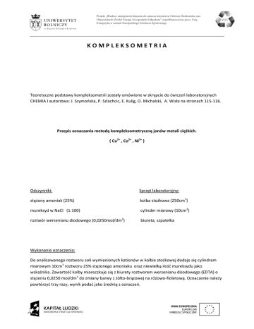 Projekt „Wiedza i umiejętności kluczem do sukcesu inżynierów Ochrony Środowiska oraz Odnawialnych Źródeł Energii i Gospodarki Odpadami” współfinansowany przez Unię Europejską w ramach Europejskiego Funduszu Społecznego KOMPLEKSOMETRIA Teoretyczne podstawy kompleksometrii zostały omówione w skrypcie do ćwiczeń laboratoryjnych CHEMIA I autorstwa: J. Szymońska, P. Szlachcic, E. Kulig, O. Michalski, A. Wisła na stronach 115-116. Przepis oznaczania metodą kompleksometryczną jonów metali ciężkich. ( Cu2+ , Co2+ , Ni2+ ) Odczynniki: Sprzęt laboratoryjny: stężony amoniak (25%) kolba stożkowa (250cm3) mureksyd w NaCl (1:100) cylinder miarowy (10cm3) roztwór wersenianu diodowego (0,0250mol/dm3) biureta, szpatelka Wykonanie oznaczenia: Do analizowanego roztworu soli wymienionych kationów w kolbie stożkowej dodaje się cylindrem miarowym 10cm3 roztworu 25% stężonego amoniaku oraz niewielką ilość mureksydu jako wskaźnika. Zawartość kolby miareczkuje się z biurety roztworem wersenianu disodowego (EDTA) o stężeniu 0,0250 mol/dm3 do zmiany barwy z żółto-brązowej na różowo-fioletową. Oznaczenie należy powtórzyć trzy razy, wynik podać jako średnią z oznaczeń. Projekt „Wiedza i umiejętności kluczem do sukcesu inżynierów Ochrony Środowiska oraz Odnawialnych Źródeł Energii i Gospodarki Odpadami” współfinansowany przez Unię Europejską w ramach Europejskiego Funduszu Społecznego Równania reakcji: M2+ + Na2H2Y (EDTA) → MH2Y + 2 Na+ HMu → H+ + Mu− M2+ + Mu− + H2O → MMu + H3O+ różowo-fioletowa żółto-brązowa MMu + Na2H2Y + NH4+ → MH2Y + Mu− + NH3 + 2 Na+ żółto-brązowa różowo-fioletowa Uwaga: Barwa początkowa i końcowa mogą nieznacznie odbiegać intensywnością Obliczenia: Stosunek molowy M2+ : EDTA = 1:1. Oblicz zawartość (w gramach) oznaczanego jonu w próbce.