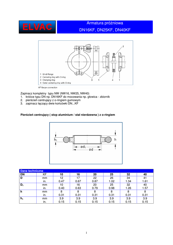Armatura próżniowa DN16KF, DN25KF, DN40KF Zapinacz kompletny typu NW (NW16, NW25, NW40) 1. króćce typu DN np. DN16KF do mocowania np. głowica - zbiornik 2. pierścień centrujący z o-ringiem gumowym 3. zapinacz łączący dwie końcówki DN...KF Pierścień centrujący ( stop aluminium / stal nierdzewna ) z o-ringiem Dane techniczne DN KF D mm in. D1 mm in. h mm in. h1 mm in. 10 12 0.47 10 0.40 8 0.31 3.9 0.15 16 17 0.67 16 0.63 8 0.31 3.9 0.15 20 22 0.87 20 0.79 8 0.31 3.9 0.15 1 25 26 1.02 25 0.98 8 0.31 3.9 0.15 32 34 1.34 32 1.26 8 0.31 3.9 0.15 40 41 1.61 40 1.57 8 0.31 3.9 0.15 Pierścień centrujący (stal nierdzewna / stop aluminium) z filtrem (fosforo-brąz) i o-ringiem Dane techniczne DN d d1 H h1 KF mm in. mm in. mm in. mm in. 10 12 0.47 8 0.31 8 0.31 3.9 0.15 16 17 0.67 14 0.55 8 0.31 3.9 0.15 25 26 1.02 23 0.91 8 0.31 3.9 0.15 Zapinacz DN…KF (stop aluminium) Dane techniczne DN A B C KF mm in. mm in. mm in. 10/16 45 1.77 72 2.40 16 0.63 2 20/25 55 2.17 90 2.83 16 0.63 32/40 70 2.76 123 3.54 18 0.71 Króciec DN…KF (stal nierdzewna) Dane techniczne DN d1 d2 L KF mm In. mm In. mm In. 10 16 0.63 12 0.47 25 0.98 16 20 0.79 16 0.63 25 1.18 25 30 1.18 26 1.02 30 1.18 40 45 1.77 41 1.61 30 1.18 Zaślepka DN…KF ( stop aluminium / stal nierdzewna ) Dane techniczne DN d h KF mm in. mm in. 10 30 1.18 5 0.20 16 30 1.18 5 0.20 3 25 40 1.57 5 0.20 40 55 2.17 5 0.20 Kolanko DN..KF (stal nierdzewna / stop aluminium ) Dane techniczne DN A d1 Przewodność KF mm in. mm in. l/s 16 40 1.57 16 0.63 6.5 15 0.59 - 25 50 1.97 25 0.98 18.9 - 40 65 2.56 39 40.5 1.34 1.59 56.5 - Trójnik DN…KF (stop aluminium / stal nierdzewna) Dane techniczne DN a b d1 (stop aluminium) d1 (stal nierdzewna) przewodność KF mm in. mm in. mm in. mm in. l/s 16 40 1.57 80 3.15 16 0.63 16 0.63 6.5 25 50 1.97 100 3.94 25 0.98 25 0.98 - 4 18.9 40 65 2.56 130 5.12 39 1.54 40.5 1.59 - 56.5 - Czwórnik DN…KF (stop aluminium / stal nierdzewna) Dane techniczne DN a przewodność KF mm in. l/s 16 40 1.57 6.5 25 50 1.97 - 18.9 40 65 2.56 - 56.5 Reduktor DN…KF (stop aluminium / stal nierdzewna) Dane techniczne DN/DN1 KF l mm in. 25/16 40 1.57 40/16 40 1.57 40/25 40 1.57 ELVAC Jan Muzyczuk, 76-020 BOBOLICE, ul. Reja 9/3 tel. / fax 94 31 87 669, kom. 504 088 515, www.elvac.com.pl, e-mail: [email protected] 5 -