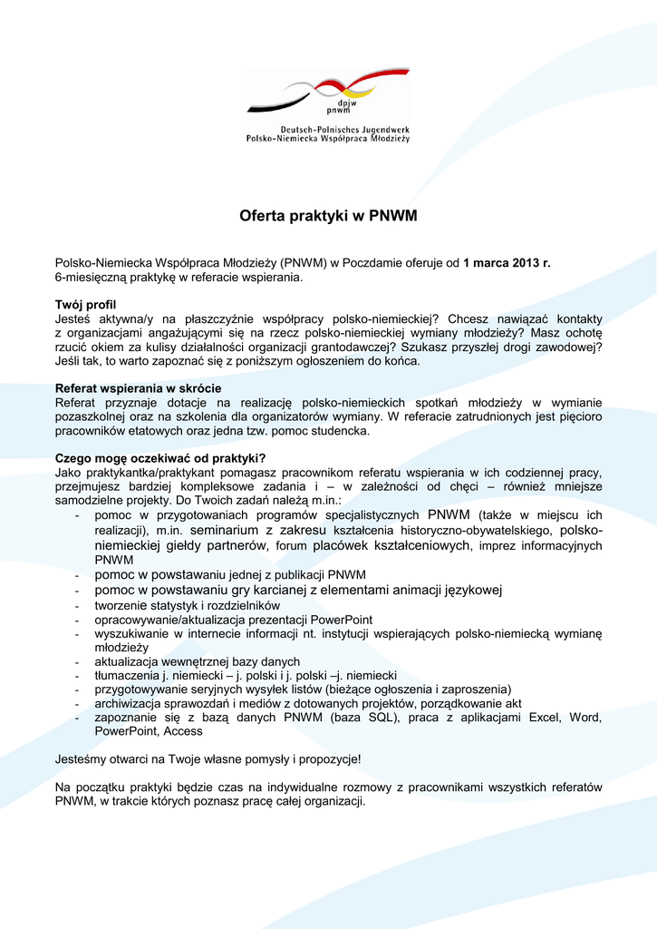Oferta praktyki w PNWM Polsko-Niemiecka Współpraca Młodzieży (PNWM) w Poczdamie oferuje od 1 marca 2013 r. 6-miesięczną praktykę w referacie wspierania. Twój profil Jesteś aktywna/y na płaszczyźnie współpracy polsko-niemieckiej? Chcesz nawiązać kontakty z organizacjami angażującymi się na rzecz polsko-niemieckiej wymiany młodzieży? Masz ochotę rzucić okiem za kulisy działalności organizacji grantodawczej? Szukasz przyszłej drogi zawodowej? Jeśli tak, to warto zapoznać się z poniższym ogłoszeniem do końca. Referat wspierania w skrócie Referat przyznaje dotacje na realizację polsko-niemieckich spotkań młodzieży w wymianie pozaszkolnej oraz na szkolenia dla organizatorów wymiany. W referacie zatrudnionych jest pięcioro pracowników etatowych oraz jedna tzw. pomoc studencka. Czego mogę oczekiwać od praktyki? Jako praktykantka/praktykant pomagasz pracownikom referatu wspierania w ich codziennej pracy, przejmujesz bardziej kompleksowe zadania i – w zależności od chęci – również mniejsze samodzielne projekty. Do Twoich zadań należą m.in.: - pomoc w przygotowaniach programów specjalistycznych PNWM (także w miejscu ich realizacji), m.in. seminarium z zakresu kształcenia historyczno-obywatelskiego, polskoniemieckiej giełdy partnerów, forum placówek kształceniowych, imprez informacyjnych PNWM - pomoc w powstawaniu jednej z publikacji PNWM - pomoc w powstawaniu gry karcianej z elementami animacji językowej - tworzenie statystyk i rozdzielników - opracowywanie/aktualizacja prezentacji PowerPoint - wyszukiwanie w internecie informacji nt. instytucji wspierających polsko-niemiecką wymianę młodzieży - aktualizacja wewnętrznej bazy danych - tłumaczenia j. niemiecki – j. polski i j. polski –j. niemiecki - przygotowywanie seryjnych wysyłek listów (bieżące ogłoszenia i zaproszenia) - archiwizacja sprawozdań i mediów z dotowanych projektów, porządkowanie akt - zapoznanie się z bazą danych PNWM (baza SQL), praca z aplikacjami Excel, Word, PowerPoint, Access Jesteśmy otwarci na Twoje własne pomysły i propozycje! Na początku praktyki będzie czas na indywidualne rozmowy z pracownikami wszystkich referatów PNWM, w trakcie których poznasz pracę całej organizacji. Czas 1 marca – 31 sierpnia 2013 40 godz./ tydzień Co oferujemy? własne miejsce pracy wynagrodzenie: 400,- EUR netto miesięcznie możliwość zakwaterowania w mieszkaniu służbowym PNWM ubezpieczenie zdrowotne zwrot kosztów podróży na rozmowę kwalifikacyjną (maks. koszty przejazdu pociągiem – 2. kl.) Czego oczekujemy? dobrej znajomości obu języków (j. niemiecki i j. polski) doświadczenia w pracy z młodzieżą lub w międzynarodowej wymianie młodzieży znajomości historii stosunków polsko-niemieckich i wiedzy o kulturze obu krajów dobrej znajomości programów komputerowych (MS-Office 2007) elastyczności, zaangażowania i pozytywnej energii! Ważna uwaga na zakończenie Praktyka nie jest skierowana do osób, które chciałyby ją odbyć w ramach obowiązkowych praktyk uniwersyteckich. Podanie Prosimy o wypełnienie podania do dnia 14.12.2012 w wersji online oraz załączenie do niego pisma motywacyjnego, CV, ewentualnie kopii istotnych certyfikatów/dokumentów. Kontakt Dorota Bastos Deutsch-Polnisches Jugendwerk Friedhofsgasse 2 14473 Potsdam E-Mail: [email protected] Tel. +49/331/2847931