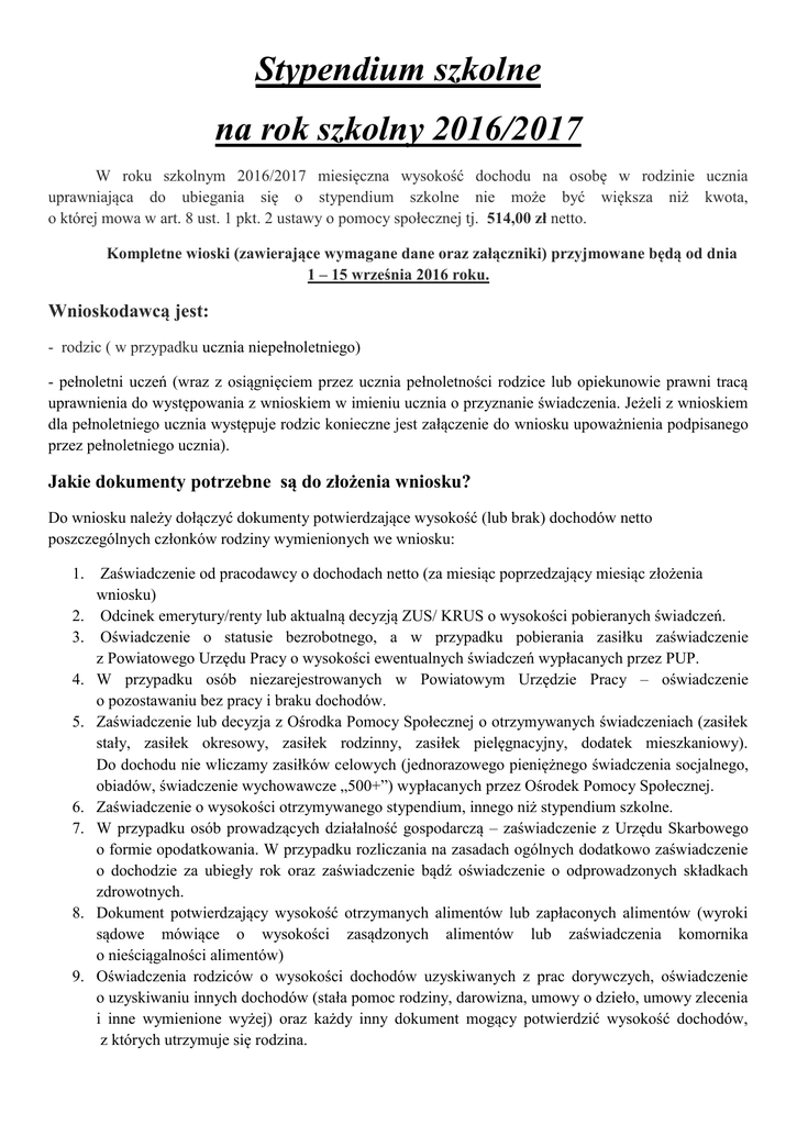 Stypendium szkolne na rok szkolny 2016/2017 W roku szkolnym 2016/2017 miesięczna wysokość dochodu na osobę w rodzinie ucznia uprawniająca do ubiegania się o stypendium szkolne nie może być większa niż kwota, o której mowa w art. 8 ust. 1 pkt. 2 ustawy o pomocy społecznej tj. 514,00 zł netto. Kompletne wioski (zawierające wymagane dane oraz załączniki) przyjmowane będą od dnia 1 – 15 września 2016 roku. Wnioskodawcą jest: - rodzic ( w przypadku ucznia niepełnoletniego) - pełnoletni uczeń (wraz z osiągnięciem przez ucznia pełnoletności rodzice lub opiekunowie prawni tracą uprawnienia do występowania z wnioskiem w imieniu ucznia o przyznanie świadczenia. Jeżeli z wnioskiem dla pełnoletniego ucznia występuje rodzic konieczne jest załączenie do wniosku upoważnienia podpisanego przez pełnoletniego ucznia). Jakie dokumenty potrzebne są do złożenia wniosku? Do wniosku należy dołączyć dokumenty potwierdzające wysokość (lub brak) dochodów netto poszczególnych członków rodziny wymienionych we wniosku: 1. 2. 3. 4. 5. 6. 7. 8. 9. Zaświadczenie od pracodawcy o dochodach netto (za miesiąc poprzedzający miesiąc złożenia wniosku) Odcinek emerytury/renty lub aktualną decyzją ZUS/ KRUS o wysokości pobieranych świadczeń. Oświadczenie o statusie bezrobotnego, a w przypadku pobierania zasiłku zaświadczenie z Powiatowego Urzędu Pracy o wysokości ewentualnych świadczeń wypłacanych przez PUP. W przypadku osób niezarejestrowanych w Powiatowym Urzędzie Pracy – oświadczenie o pozostawaniu bez pracy i braku dochodów. Zaświadczenie lub decyzja z Ośrodka Pomocy Społecznej o otrzymywanych świadczeniach (zasiłek stały, zasiłek okresowy, zasiłek rodzinny, zasiłek pielęgnacyjny, dodatek mieszkaniowy). Do dochodu nie wliczamy zasiłków celowych (jednorazowego pieniężnego świadczenia socjalnego, obiadów, świadczenie wychowawcze „500+”) wypłacanych przez Ośrodek Pomocy Społecznej. Zaświadczenie o wysokości otrzymywanego stypendium, innego niż stypendium szkolne. W przypadku osób prowadzących działalność gospodarczą – zaświadczenie z Urzędu Skarbowego o formie opodatkowania. W przypadku rozliczania na zasadach ogólnych dodatkowo zaświadczenie o dochodzie za ubiegły rok oraz zaświadczenie bądź oświadczenie o odprowadzonych składkach zdrowotnych. Dokument potwierdzający wysokość otrzymanych alimentów lub zapłaconych alimentów (wyroki sądowe mówiące o wysokości zasądzonych alimentów lub zaświadczenia komornika o nieściągalności alimentów) Oświadczenia rodziców o wysokości dochodów uzyskiwanych z prac dorywczych, oświadczenie o uzyskiwaniu innych dochodów (stała pomoc rodziny, darowizna, umowy o dzieło, umowy zlecenia i inne wymienione wyżej) oraz każdy inny dokument mogący potwierdzić wysokość dochodów, z których utrzymuje się rodzina. Realizacja stypendium Wnioskodawca otrzymujący stypendium szkolne dokumentuje wykorzystane stypendium na cele edukacyjne poprzez przedstawienie dokumentów potwierdzających wydatki. Refundacji kosztów poniesionych przez ucznia na cele edukacyjne dokonuje się na podstawie następujących dokumentów opiewających na całość przyznanej kwoty stypendium: faktura VAT, rachunek imienny. Powyższe dokumenty powinny m.in. zawierać: nazwę wystawcy, datę wystawienia/sprzedaży, imię i nazwisko nabywcy (wnioskodawcy), pełną nazwę przedmiotu podlegającego refundacji (artykuły szkolne, sportowe) podpis osoby upoważnionej do wystawienia dokumentu. Na co można przeznaczyć stypendium szkolne? Przykładowy katalog wydatków poniesionych na cele edukacyjne podlegające całkowitej lub częściowej refundacji w ramach stypendium szkolnego: - Udział w zajęciach edukacyjnych, w tym wyrównawczych, wykraczających poza zajęcia realizowane w szkole w ramach planu nauczania, - Udział w zajęciach edukacyjnych realizowanych poza szkołą - Zakup podręczników, słowników, encyklopedii, atlasów, tablic matematycznych, fizycznych, chemicznych, geograficznych itp., - Tornister lub plecak szkolny, - Zakup obuwia sportowego i stroju na zajęcia wychowania fizycznego - Zakup artykułów szkolnych (piórnik, zeszyty, bloki, papier kolorowy, papier kancelaryjny, papier milimetrowy, flamastry, nożyczki, przybory geometryczne, kredki, farby, pastele, długopisy, pióra, plastelina itp., - Drukarka, papier, tusz do drukarki, - Komputer, oprogramowanie systemowe, nośniki danych, W przypadku poniesienia wydatków o podobnym przeznaczeniu jak wymienione wyżej w toku rozpatrywania wniosku o przyznanie stypendium szkolnego dokonuje się indywidualnej oceny danego przypadku, celem ustalenia, czy wydatek jest poniesiony na cele edukacyjne. Obuwie i odzież mogą stanowić pomoc o charakterze edukacyjnym jedynie w sytuacji, gdy wiążą się w sposób oczywisty i bezpośredni z procesem edukacji ucznia (np. strój na lekcje wychowania fizycznego) lub z jego zainteresowaniami i rozwojem jego zdolności (np. kimono dla ucznia trenującego karate). Natomiast zakup codziennej odzieży lub obuwia, umożliwiającego uczniowi uczęszczanie do szkoły (kurtka, buty) należy do zakresu pomocy społecznej i nie może być finansowany w ramach stypendium szkolnego.