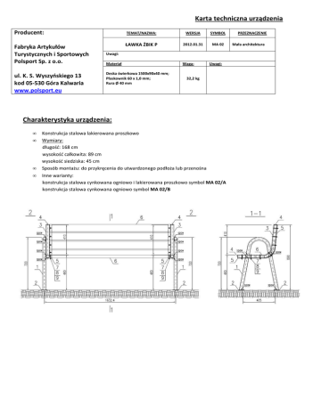 Karta techniczna urządzenia Producent: TEMAT/NAZWA: WERSJA SYMBOL Fabryka Artykułów Turystycznych i Sportowych Polsport Sp. z o.o. ŁAWKA ŻBIK P 2012.01.31 MA 02 ul. K. S. Wyszyńskiego 13 kod 05-530 Góra Kalwaria www.polsport.eu Uwagi: Materiał Deska świerkowa 1500x90x40 mm; Płaskownik 60 x 1,0 mm; Rura Ø 40 mm Waga: Uwagi: 32,2 kg Charakterystyka urządzenia: • • • • Konstrukcja stalowa lakierowana proszkowo Wymiary: długość: 168 cm wysokość całkowita: 89 cm wysokość siedziska: 45 cm Sposób montażu: do przykręcenia do utwardzonego podłoża lub przenośna Inne warianty: konstrukcja stalowa cynkowana ogniowo i lakierowana proszkowo symbol MA 02/A konstrukcja stalowa cynkowana ogniowo symbol MA 02/B PRZEZNACZENIE Mała architektura