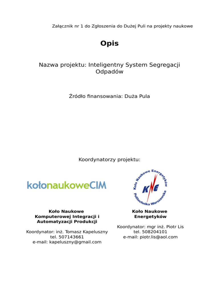 Załącznik nr 1 do Zgłoszenia do Dużej Puli na projekty naukowe Opis Nazwa projektu: Inteligentny System Segregacji Odpadów Źródło finansowania: Duża Pula Koordynatorzy projektu: Koło Naukowe Komputerowej Integracji i Automatyzacji Produkcji Koordynator: inż. Tomasz Kapeluszny tel. 507143661 e-mail: [email protected] Koło Naukowe Energetyków Koordynator: mgr inż. Piotr Lis tel. 508204101 e-mail: [email protected] 1 Wstęp Odbiór i utylizacja odpadów komunalnych stanowi duży problem wielu polskich miast. Unia Europejska nakłada na kraje członkowskie coraz bardziej restrykcyjne normy dotyczące gospodarki odpadami. Duży nacisk kładziony jest na segregację i recycling. W ostatnich latach udział śmieci segregowanych wynosił w Polsce jedynie 13% podczas gdy średnia Unii Europejskiej była na poziomie 27%. Jednym z przejawów wprowadzania nowej polityki było uchwalenie tzw. ustawy śmieciowej. Na podstawie obserwacji można przypuszczać, że przepisy będą zmierzać w kierunku całkowitej segregacji i recyclingu odpadów. 2 Koncepcja Projekt ISSO polega na opracowaniu, budowie i wdrożeniu inteligentnego systemu segregacji odpadów w DS „Mikrus”. Instalacja systemu oraz wykorzystanie istniejącego zsypu na śmieci umożliwi mieszkańcom łatwe i wygodne segregowanie odpadów bez rezygnacji z dotychczasowych nawyków. System składał się będzie z czterech podstawowych podsystemów rozwiązujących cztery główne problemy tradycyjnych zsypów na śmieci: Sorter + panele operatorskie, System dezynfekcji, System wentylacji, System przeciwpożarowy. Działanie poszczególnych podsystemów szczegółowo oraz schemat całego systemu przedstawiono w następnych podrozdziałach. 2.1 Sorter + panele operatorskie Podstawowym elementem systemu jest sorter umożliwiający segregację odpadów z wykorzystaniem istniejącego zsypu na śmieci. Drugim niezbędnym elementem systemu są panele operatorskie. Służą one do obsługi systemu przez mieszkańców. Każda kieszeń zsypowa na piętrze posiada oddzielny panel operatorski. System działa następująco: mieszkaniec wybiera rodzaj odpadów (np. szkło), które chce wyrzucić na panelu operatorskim przez naciśnięcie odpowiednio opisanego przycisku odpowiadającemu danemu rodzajowi odpadów Na podstawie wyboru system odblokowuje kieszeń zsypową a sorter znajdujący się w pomieszczeniu zsypowym kieruje worek ze śmieciami do odpowiedniego kontenera. W tym czasie kieszenie na pozostałych piętrach są chwilowo zablokowane. Panel wyposażony będzie dodatkowo w wyświetlacz informujący o aktualnym statusie systemu oraz statystykach segregacji odpadów. Wstępne pomiary przeprowadzone w DS „Mikrus” pokazały że pomieszczenie zsypowe jest wystarczająco duże na instalację sortera dzielącego odpady na 5 frakcji: Odpady zmieszane Szkło Plastik Metale Papier Pomieszczenia zsypowe na piętrach również umożliwiają bezproblemową instalację systemu. Stworzony przez nas system w żaden sposób nie ingeruje w strukturę istniejącego zsypu i w razie potrzeby lub awarii może zostać w każdej chwili wyłączony nie wykluczając zsypu z normalnego użytkowania. Rysunek 1 Schemat inteligentnego systemu segregacji odpadów 2.2 System przeciwpożarowy System przeciwpożarowy składa się z klapy przeciwpożarowej F oraz czujnika dymu. Jeżeli czujnik wykryje dym w pomieszczeniu zsypowym klapa F zamyka się blokując drogę dymu do kanału zsypowego. Jednocześnie blokowane są wszystkie kieszenie zsypowe na piętrach. Uruchamia się alarm informujący o zagrożeniu. 2.3 System dezynfekcji System dezynfekcji składa się ze zbiornika środka dezynfekującego, elektrozaworu, pompy oraz zestawu dysz umieszczonych wzdłuż kanału zsypowego. Cyklicznie dysze rozpylają środek dezynfekujący w kanale zsypowym który zabija insekty, bakterie i grzyby. Jedyną wymaganą czynnością serwisową jest okresowe uzupełnianie środka dezynfekującego w zbiorniku. Gdy zacznie się on kończyć system powiadomi o tym automatycznie. 2.4 System wentylacji System wentylacji składa się z wentylatora umieszczonego w górnej części zsypy. Ma on na celu utrzymywanie w kanale niewielkiego podciśnienia które uniemożliwi wydostawanie się odoru z kanału zsypowego na piętrach. 3 Beneficjenci 3.1 Studenci Bezpośrednimi beneficjentami projektu będą mieszkańcy DS „Mikrus”. Instalacja systemu segregacji odpadów da ok. 400 mieszkańcom wybór: segregować czy nie. Mamy nadzieję, że łatwość używania systemu zachęci do segregacji odpadów większość mieszkańców. Ma w tym także pomóc kampania informacyjno-edukacyjna zaplanowana podczas fazy wdrożeniowej systemu. Kolejną grupą beneficjentów projektu będą członkowie kół naukowych odpowiedzialnych za realizację projektu. Będą oni mieli możliwość sprawdzenia się w roli inżyniera oraz wykorzystania zdobytej na uczelni wiedzy w praktyce. 3.2 Administracja Deklaracja przez mieszkańców segregacji odpadów przyczyni się do obniżenia kosztów ich wywozu. Jeżeli wszyscy mieszkańcy zaczną segregować śmieci przewidywane oszczędności z tego wynikające szacuje się na ok. 800-1000 zł miesięcznie. Planujemy wykorzystać te kwoty do zakupu do DS. „Mikrus” sprzętu ogólnego użytku np. wyposażenia siłowni. 3.3 Uczelnia Innowacyjne, proekologiczne projekty studentów są bardzo medialnym tematem. Instalacja tego typu systemu w akademiku będzie stanowiła dużą promocję dla Politechniki Warszawskiej. 3.4 Środowisko Segregacja odpadów przyczyni się także do ochrony środowiska naturalnego zmniejszenia zużycia energii potrzebną na segregację zmieszanych odpadów. Łatwiej będzie także przetwarzać wstępnie przesegregowane odpady. 4 Ocena wykonalności projektu Wykonanie projektu będzie przedsięwzięciem bardzo złożonym ze względu na łączenie wiedzy z zakresu budowy maszyn oraz automatyki. Pracować będą przy tym zespoły z dwóch r