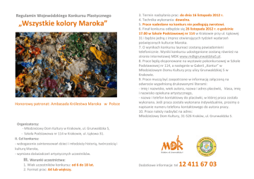 Regulamin Wojewódzkiego Konkursu Plastycznego „Wszystkie kolory Maroka” Honorowy patronat: Ambasada Królestwa Maroka w Polsce 3. Termin nadsyłania prac: do dnia 16 listopada 2012 r. 4. Technika wykonania: dowolna. 5. Prace nadesłane na konkurs nie podlegają zwrotowi. 6. Finał konkursu odbędzie się 26 listopada 2012 r. o godzinie 17.00 w Szkole Podstawowej nr 114 w Krakowie przy ul. Łąkowej 31 i będzie jedną z imprez otwierających tydzień wydarzeń poświęconych kulturze Maroka. 7. O wynikach konkursu laureaci zostaną powiadomieni telefonicznie. Wyniki konkursu udostępnione zostaną również na stronie internetowej MDK www.mdkgrunwaldzka5.pl. 8. Prace będą eksponowane na wystawie pokonkursowej w Szkole Podstawowej nr 114, a następnie w Galerii „Kontur” w Młodzieżowym Domu Kultury przy ulicy Grunwaldzkiej 5 w Krakowie. 9. Prace muszą być zaopatrzone w informację załączoną na odwrocie wypełnioną drukowanymi literami: - imię i nazwisko, wiek autora, nazwa i adres placówki, klasa, imię i nazwisko opiekuna artystycznego, - nazwa i telefon kontaktowy do placówki, w której praca została wykonana. Jeśli praca została wykonana indywidualnie, prosimy o napisanie numeru telefonu kontaktowego do autora pracy. 10. Prace należy nadsyłać na adres: Młodzieżowy Dom Kultury, 31-526 Kraków, ul. Grunwaldzka 5. Organizatorzy: - Młodzieżowy Dom Kultury w Krakowie, ul. Grunwaldzka 5, - Szkoła Podstawowa nr 114 w Krakowie, ul. Łąkowa 31. II. Cel konkursu: - wzbogacenie zainteresowań dzieci i młodzieży historią, twórczością i kulturą Maroka, - wymiana doświadczeń artystycznych uczestników. III. Warunki uczestnictwa: 1. Wiek uczestników konkursu: od 6 do 18 lat. 2. Format prac: A4 lub większy. Dodatkowe informacje: tel 12 411 67 03