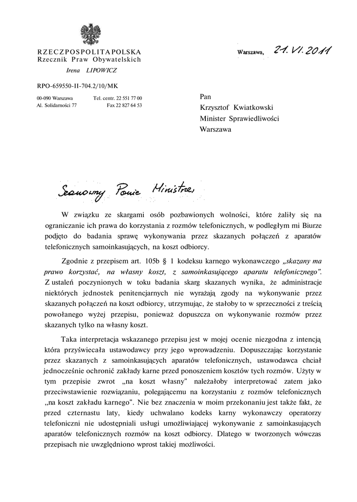 R Z E C Z P O S P O L I T A POLSKA Rzecznik P r a w Obywatelskich Irena LIPOWICZ RPO-659550-II-704.2/10/MK 00-090 Warszawa Al. Solidarności 77 Tel. centr. 22 551 77 00 Fax 22 827 64 53 Pan Krzysztof Kwiatkowski Minister Sprawiedliwości Warszawa W związku ze skargami osób pozbawionych wolności, które żaliły się na ograniczanie ich prawa do korzystania z rozmów telefonicznych, w podległym mi Biurze podjęto do badania sprawę wykonywania przez skazanych połączeń z aparatów telefonicznych samoinkasujących, na koszt odbiorcy. Zgodnie z przepisem art. 105b § 1 kodeksu karnego wykonawczego „skazany ma prawo korzystać, na własny koszt, z samoinkasującego aparatu telefonicznego". Z ustaleń poczynionych w toku badania skarg skazanych wynika, że administracje niektórych jednostek penitencjarnych nie wyrażają zgody na wykonywanie przez skazanych połączeń na koszt odbiorcy, utrzymując, że stałoby to w sprzeczności z treścią powołanego wyżej przepisu, ponieważ dopuszcza on wykonywanie rozmów przez skazanych tylko na własny koszt. Taka interpretacja wskazanego przepisu jest w mojej ocenie niezgodna z intencją która przyświecała ustawodawcy przy jego wprowadzeniu. Dopuszczając korzystanie przez skazanych z samoinkasujących aparatów telefonicznych, ustawodawca chciał jednocześnie ochronić zakłady karne przed ponoszeniem kosztów tych rozmów. Użyty w tym przepisie zwrot „na koszt własny" należałoby interpretować zatem jako przeciwstawienie rozwiązaniu, polegającemu na korzystaniu z rozmów telefonicznych ,,na koszt zakładu karnego". Nie bez znaczenia w moim przekonaniu jest także fakt, że przed czternastu laty, kiedy uchwalano kodeks karny wykonawczy operatorzy telefoniczni nie udostępniali usługi umożliwiającej wykonywanie z samoinkasujących aparatów telefonicznych rozmów na koszt odbiorcy. Dlatego w tworzonych wówczas przepisach nie uwzględniono wprost takiej możliwości. 2 Wskazać należy ponadto, że zdecydowana większość skazanych nie jest zatrudniona odpłatnie podczas odbywania kary pozbawienia wolności, ani nie posiada innych źródeł własnego dochodu. Karty telefoniczne, dzięki którym mogą korzystać z aparatów telefonicznych są im zakupywane przez rodziny, albo też od rodzin pochodzą środki finansowe na ich zakup. Należy zatem mieć świadomość, że w praktyce także w sytuacji, gdy skazany prowadzi rozmowy korzystając z karty telefonicznej, w istocie to najbliżsi ponoszą koszty tych rozmów. Skoro rodzina może przekazać skazanemu kartę lub środki na jej zakup, racjonalnym wydaje się dopuszczenie możliwości finansowania tych rozmów również w innej, dogodnej dla wszystkich zainteresowanych stron, formie, poprzez wyrażenie zgody na przyjęcie rozmowy na koszt odbiorcy. Przepisy kodeksu karnego wykonawczego kładą bardzo duży nacisk na podtrzymywanie kontaktów skazanych ze światem zewnętrznym. Wynika to z przyjętego przez ustawodawcę poglądu, iż resocjalizacji nie można prowadzić w oderwaniu od środowiska znajdującego się poza murami więzienia, w tym w szczególności środowiska rodzinnego. Wyraz temu dano dyrektywą art. 67 § 3 k.k.w., która nakazuje uwzględniać w oddziaływaniach na skazanych podtrzymywanie jego kontaktów z rodziną i światem zewnętrznym. Działania zmierzające do ograniczenia tego rodzaju kontaktów wydają się zatem sprzeczne z podstawowym celem wykonywania kary pozbawienia wolności, jakim jest readaptacja skazanego. Taką argumentację przedstawiliśmy Dyrektorowi Generalnemu Służby Więziennej w piśmie z dnia 18 kwietnia br. Niestety, w udzielonej odpowiedzi Dyrektor Generalny powiadomił, iż nie podziela stanowiska Rzecznika w tej sprawie. Uznał, że z brzmienia przepisu art. 105b § 1 k.k.w. jednoznacznie wynika, iż ustawodawca przewidział możliwość skorzystania przez skazanego z samoinkasującego aparatu telefonicznego tylko na własny koszt. Przyjęcie wykładni prowadzącej do przyznania skazanemu uprawnienia do korzystania z aparatu telefonicznego samoinkasującego na koszt odbiorcy byłoby zatem, w opinii Dyrektora Generalnego, nadużyciem prawa. Niezależnie od powyższego Dyrektor Generalny wyraził stanowisko, iż uprawnienie do korzystania z rozmów telefonicznych przez osadzonych jest jedną z form podtrzymywania kontaktów ze światem zewnętrznym, a w szczególności utrzymywania przez osadzonych więzi z rodziną i innymi osobami bliskimi, i z tego względu realizacja tego prawa powinna odbywać się bez dodatkowych ograniczeń. W związku z tym uznał, że wskazane byłoby rozważenie zmiany brzmienia przepisu art. 105b § 1 k.k.w. w taki sposób, aby skazany uzyskał prawo do korzystania z samoinkasującego aparatu telefonicznego również na koszt odbiorcy. W mojej ocenie nowelizacja ustawy w tym zakresie nie jest niezbędna. Ponieważ przedmiotowy przepis dotyczy uprawnień skazanego, możliwe jest interpretowanie go w sposób rozszerzający, na korzyść skazanego, zwłaszcza, że przemawiają za tym względy 3 celowościowe, społeczne, ekonomiczne, brak jest zaś przesłanek negatywnych. W szczególności nie stoją temu na przeszkodzie względy ochronne. Jednakże mając na uwadze pogląd wyrażony przez Dyrektora Generalnego Służby Więziennej, stosownie do art. 16 ust. 2 pkt 1 ustawy z dnia 15 lipca 1987 r. o Rzeczniku Praw Obywatelskich (Dz. U. z 2001 r. Nr 14, poz. 147 ze zm.) zwracam się do Pana Ministra z uprzejmą prośbą o zajęcie stanowiska w przedstawionej kwestii i rozważenie potrzeby podjęcia inicjatywy ustawodawczej w celu zmiany przedmiotowej regulacji w taki sposób, aby skazany uzyskał możliwość korzystania z samoinkasującego aparatu telefonicznego również na koszt odbiorcy.