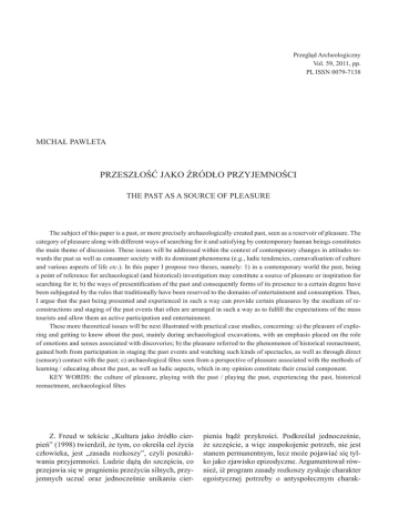 1 przeszłość jako źródło przyjemności Przegląd Archeologiczny Vol. 59, 2011, pp. PL ISSN 0079-7138 Michał Pawleta Przeszłość jako źródło przyjemności The past as a source of pleasure The subject of this paper is a past, or more precisely archaeologically created past, seen as a reservoir of pleasure. The category of pleasure along with different ways of searching for it and satisfying by contemporary human beings constitutes the main theme of discussion. These issues will be addressed within the context of contemporary changes in attitudes towards the past as well as consumer society with its dominant phenomena (e.g., ludic tendencies, carnavalisation of culture and various aspects of life etc.). In this paper I propose two theses, namely: 1) in a contemporary world the past, being a point of reference for archaeological (and historical) investigation may constitute a source of pleasure or inspiration for searching for it; b) the ways of presentification of the past and consequently forms of its presence to a certain degree have been subjugated by the rules that traditionally have been reserved to the domains of entertainment and consumption. Thus, I argue that the past being presented and experienced in such a way can provide certain pleasures by the medium of reconstructions and staging of the past events that often are arranged in such a way as to fulfill the expectations of the mass tourists and allow them an active participation and entertainment. These more theoretical issues will be next illustrated with practical case studies, concerning: a) the pleasure of exploring and getting to know about the past, mainly during archaeological excavations, with an emphasis placed on the role of emotions and senses associated with discoveries; b) the pleasure referred to the phenomenon of historical reenactment, gained both from participation in staging the past events and watching such kinds of spectacles, as well as through direct (sensory) contact with the past; c) archaeological fêtes seen from a perspective of pleasure associated with the methods of learning / educating about the past, as well as ludic aspects, which in my opinion constitute their crucial component. KEY WORDS: the culture of pleasure, playing with the past / playing the past, experiencing the past, historical reenactment, archaeological fêtes Z. Freud w tekście „Kultura jako źródło cierpień” (1998) twierdził, że tym, co określa cel życia człowieka, jest „zasada rozkoszy”, czyli poszukiwania przyjemności. Ludzie dążą do szczęścia, co przejawia się w pragnieniu przeżycia silnych, przyjemnych uczuć oraz jednocześnie unikaniu cier- pienia bądź przykrości. Podkreślał jednocześnie, że szczęście, a więc zaspokojenie potrzeb, nie jest stanem permanentnym, lecz może pojawiać się tylko jako zjawisko epizodyczne. Argumentował również, iż program zasady rozkoszy zyskuje charakter egoistycznej potrzeby o antyspołecznym charak- 2 michał pawleta terze. Dla Z. Freuda modernizm stanowił epokę, w której zasada przyjemności została zdominowana przez zasadę rzeczywistości, w efekcie czego ludzie zrezygnowali z części swej wolności i szczęścia, uzyskując w zamian określony stopień bezpieczeństwa. Stłumienie przez kulturę naturalnych ludzkich popędów i instynktów prowadziło jednak do powstawania traum, powodując wzrost dolegliwości psychicznych i neurotycznych (Bauman 1998, 274). Czasom ponowoczesnym natomiast, jak wskazuje Z. Bauman w książce „Ponowoczesność jako źródło cierpień”, przyświeca naczelna „zasada przyjemności”. Pisze on mianowicie: „ludzie ponowocześni stracili dozę swego bezpieczeństwa w zamian za przyrost szansy czy nadziei szczęśliwości. Zgryzoty typowo nowoczesne wynikały z takiego bezpieczeństwa, z jakim dawało się tylko pogodzić zakres wolności zbyt szczupły na to, by pozwolić na życie podporządkowane dążeniu do szczęścia. Zgryzoty iście ponowoczesne wypływają z pogoni za przyjemnością na tyle nieskrępowanej, że nie da się jej pogodzić z minimum bezpieczeństwa, jakiej wolna jednostka skłonna jest pożądać” (Bauman 2000, 9). Celem niniejszego artykułu jest obrona tezy, iż we współczesnych czasach przeszłość, stanowiąca przedmiot badań i odniesień archeologii (i historii), stanowić może źródło przyjemności bądź inspirację do jej poszukiwań, przy czym nie chodzi zazwyczaj o konkretne wydarzenia z przeszłości, ale jedynie o ogólne nawiązania do niej. Mam na myśli głównie tę formę przeszłości, którą W. Burszta (2011, 21-22) określił mianem „absolutnie odległej przeszłości”, czyli abstrakcyjnego bytu, do którego przybliżają nas głównie rekonstrukcje archeologiczne, której obecności możemy doświadczać przykładowo w ekspozycjach muzealnych lub nagromadzonej wiedzy specjalistycznej. Owa absolutnie odległa przeszłość (przeszłość pradziejowa) nie ma nic wspólnego z doświadczeniami współczesnego człowieka, gdyż tego świata już nie ma i nigdy nie będzie. Jak wskazuje jednak Autor, motyw przeszłości jako „totalnego innego” zaadaptowała kultura popularna, na gruncie której przywracana jest ona ponownie do życia (np. „celtyckość”, „słowiańskość” itd.). Kreuje się więc mityczne realia, do których można metaforycznie i metonimicznie przylegać emocjonalnie, powołując mity radzące sobie z odległością czasową, np. w ramach „nowoplemion” (zob. Maffesoli 2008). Druga teza niniejszego szkicu brzmi, iż we współczesnym świecie przeszłość, a ściślej sposo- by jej uobecniania, zakres funkcjonowania i konsekwencją czego same formy jej obecności w określonym zakresie poddane zostały logice i regułom, jakie do tej pory rządziły rozrywką oraz konsumpcją (zob. Krajewski 2003, 211). Polega to m.in. na tym, że w przypadku różnorakich inicjatyw i przedsięwzięć na plan pierwszy wysuwa się 
