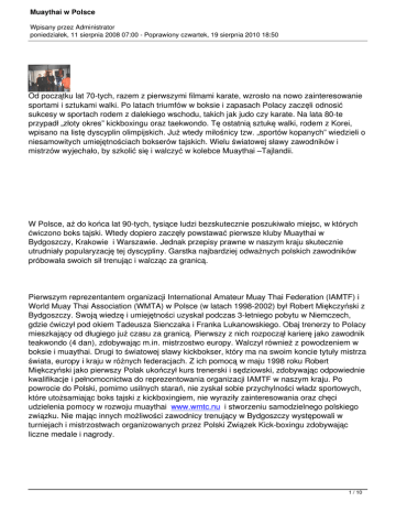 Muaythai w Polsce Wpisany przez Administrator poniedziałek, 11 sierpnia 2008 07:00 - Poprawiony czwartek, 19 sierpnia 2010 18:50 Od początku lat 70-tych, razem z pierwszymi filmami karate, wzrosło na nowo zainteresowanie sportami i sztukami walki. Po latach triumfów w boksie i zapasach Polacy zaczęli odnosić sukcesy w sportach rodem z dalekiego wschodu, takich jak judo czy karate. Na lata 80-te przypadł „złoty okres” kickboxingu oraz taekwondo. Tę ostatnią sztukę walki, rodem z Korei, wpisano na listę dyscyplin olimpijskich. Już wtedy miłośnicy tzw. „sportów kopanych” wiedzieli o niesamowitych umiejętnościach bokserów tajskich. Wielu światowej sławy zawodników i mistrzów wyjechało, by szkolić się i walczyć w kolebce Muaythai –Tajlandii. W Polsce, aż do końca lat 90-tych, tysiące ludzi bezskutecznie poszukiwało miejsc, w których ćwiczono boks tajski. Wtedy dopiero zaczęły powstawać pierwsze kluby Muaythai w Bydgoszczy, Krakowie i Warszawie. Jednak przepisy prawne w naszym kraju skutecznie utrudniały popularyzację tej dyscypliny. Garstka najbardziej odważnych polskich zawodników próbowała swoich sił trenując i walcząc za granicą. Pierwszym reprezentantem organizacji International Amateur Muay Thai Federation (IAMTF) i World Muay Thai Association (WMTA) w Polsce (w latach 1998-2002) był Robert Miękczyński z Bydgoszczy. Swoją wiedzę i umiejętności uzyskał podczas 3-letniego pobytu w Niemczech, gdzie ćwiczył pod okiem Tadeusza Sienczaka i Franka Lukanowskiego. Obaj trenerzy to Polacy mieszkający od długiego już czasu za granicą. Pierwszy z nich rozpoczął karierę jako zawodnik teakwondo (4 dan), zdobywając m.in. mistrzostwo europy. Walczył również z powodzeniem w boksie i muaythai. Drugi to światowej sławy kickbokser, który ma na swoim koncie tytuły mistrza świata, europy i kraju w różnych federacjach. Z ich pomocą w maju 1998 roku Robert Miękczyński jako pierwszy Polak ukończył kurs trenerski i sędziowski, zdobywając odpowiednie kwalifikacje i pełnomocnictwa do reprezentowania organizacji IAMTF w naszym kraju. Po powrocie do Polski, pomimo usilnych starań, nie zyskał sobie przychylności władz sportowych, które utożsamiając boks tajski z kickboxingiem, nie wyraziły zainteresowania oraz chęci udzielenia pomocy w rozwoju muaythai www.wmtc.nu i stworzeniu samodzielnego polskiego związku. Nie mając innych możliwości zawodnicy trenujący w Bydgoszczy występowali w turniejach i mistrzostwach organizowanych przez Polski Związek Kick-boxingu zdobywając liczne medale i nagrody. 1 / 10 Muaythai w Polsce Wpisany przez Administrator poniedziałek, 11 sierpnia 2008 07:00 - Poprawiony czwartek, 19 sierpnia 2010 18:50 Dopieroi World powołane staraniach organizacji: (EMF) w do kwietniu i International spełnieniu życia Muaythai Polskie 2001 rygorystycznych Council Federation roku Zrzeszenie z inicjatywy (WMC). of Muay Muaythai kryteriów (www.muaythai.com.pl) Piotra ThaiOchniowskiego Amateur zostało (PZMT)wpisane (IFMA), z siedzibą i Rafała na Europen w listę Krakowie. Szlachty członków Muaythai Po zostało światowych długich Federation Rok 2002 W lipcu 2002 roku Rafał Szlachta i Piotr Ochniowski udali się do stolicy Tajlandii – Bangkoku, gdzie trenowali pod nadzorem najlepszych tajskich trenerów, w tym mistrza pułkownika Amanta Poksrisruka (szefa wyszkolenia armii tajskiej). Już wtedy, podczas Pucharu Świata w Bangkoku, mieli możliwość na własne oczy przekonać się o potędze i umiejętnościach zawodników muaythai. W kolejną podróż, w październiku 2002 roku, na Mistrzostwa Europy w Lille we Francji Rafał Szlachta udał się wspólnie z Rafałem Simonidesem. Francja to centrum europejskiego muaythai czyli Europen Muaythai Federation (EMF) z Jacques Mairesse na czele. To właśnie ci ludzie stali się mentorami dalszych działań Polaków. Rok 2003 W marcu 2003 roku Rafał Szlachta przebywał w Tajlandii na kolejnym szkoleniu u mistrza Amanta Poksrisruka. W dniu 15 czerwca 2003 roku PZMT zorganizowało w Krakowie I Puchar Polski Muaythai Amatorów, pod honorowym patronatem Ambasady Tajlandii. Postawiono w ten sposób pierwszy krok w kierunku połączenia wszystkich klubów i miłośników muaythai w jedną, silną organizację oraz szerszego rozpropagowania boksu tajskiego w naszym kraju. W czerwcu 2003 roku, podczas zgrupowania w Chotowej doszło do spotkania Rafała Szlachty, Roberta Miękczyńskiego, Witolda Michalskiego Maćka Skupińskiego i kilku innych trenerów, podczas którego osiągnięto porozumienie w kwestii wspólnego rozwoju muaythai w Polsce, bez podziału na konkurujące ze sobą organizacje IAMTF i IFMA. W ten sposób wyprzedzono zamysł zarządów światowych obu federacji, które oficjalnie połączyły się w listopadzie tego samego roku. Dnia 07 sierpnia 2003r. w Warszawie, w Ambasadzie Królestwa Tajlandii odbyło się spotkanie przedstawicieli trzech najważniejszych instytucji zajmujących się promowaniem Muaythai w Polsce: Ambasady Królestwa Tajlandii, Ministerstwa Edukacji Narodowej i Sportu oraz 2 / 10 Muaythai w Polsce Wpisany przez Administrator poniedziałek, 11 sierpnia 2008 07:00 - Poprawiony czwartek, 19 sierpnia 2010 18:50 Polskiego Zrzeszenia Muaythai. We wrześniu 2003 roku Rafał Szlachta wspólnie z Rafałem Simonidesem z Krakowa, Maćkiem Skupińskim z Warszawy i Filipem Rządkiem z Kalisza udali się na Mistrzostwa Świata Muaythai do Almaty, w Kazachstanie. Stamtąd przywieźli dwa medale: Maciek Skupiński (w wadze do 67 kg) stanął na najwyższym stopniu podium, otrzymując tytuł Mistrza Świata Amatorskiego Muaythai, a Rafał Simonides (w wadze do 57 kg) zdobył III miejsce i brązowy medal. Te osiągnięcia zaowocowały nagrodami w kraju od władz sportowych i rozgłosem w mediach. Maciek Skupiński otrzymał zaszczytne wyróżnienie od Polskiej Konfederacji Sportu dla najlepszego zawodnika sportów walki 2003 roku. Od tego 