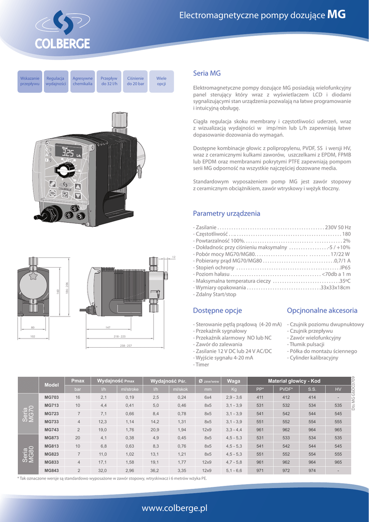 Electromagnetyczne pompy dozujące MG Wskazanie przepływu Regulacja wydajności Agresywne chemikalia Przepływ do 32 l/h Ciśnienie do 20 bar Seria MG Wiele opcji Elektromagnetyczne pompy dozujące MG posiadają wielofunkcyjny panel sterujący który wraz z wyświetlaczem LCD i diodami sygnalizującymi stan urządzenia pozwalają na łatwe programowanie i intuicyjną obsługę. Ciągła regulacja skoku membrany i częstotliwości uderzeń, wraz z wizualizacją wydajności w imp/min lub L/h zapewniają łatwe dopasowanie dozowania do wymagań. Dostępne kombinacje głowic z polipropylenu, PVDF, SS i wersji HV, wraz z ceramicznymi kulkami zaworów, uszczelkami z EPDM, FPMB lub EPDM oraz membranami pokrytymi PTFE zapewniają pompom serii MG odporność na wszystkie najczęściej dozowane media. Standardowym wyposażeniem pomp MG jest zawór stopowy z ceramicznym obciążnikiem, zawór wtryskowy i wężyk tłoczny. Parametry urządzenia - Zasilanie . . . . . . . . . . . . . . . . . . . . . . . . . . . . . . . . . . . . . . . . . . . . . . 230V 50 Hz - Częstotliwość . . .. . . . . . . . . . . . . . . . . . . . . . . . . . . . . . . . . . . . . . . . . . . . . . 180 - Powtarzalność 100%. . . . . . . . . . . . . . . . . . . . . . . . . . . . . . . . . . . . . . . . . . 2% - Dokładnośc przy ciśnieniu maksymalny . . . . . . . . . . . . . . . . .-5 / +10% - Pobór mocy MG70/MG80. . . . . . . . . . . . . . . . . . . . . . . . . . . . . . . . 17/22 W - Pobierany prąd MG70/MG80 . . . . . . . . . . . . . . . . . . . . . . . . . . . . . . .0,7/1 A - Stopień ochrony . . . . . . . . . . . . . . . . . . . . . . . . . . . . . . . . . . . . . . . . . . . . .IP65 - Poziom hałasu . . . . . . . . . . . . . . . . . . . . . . . . . . . . . . . . . . . . . . . <70db a 1 m - Maksymalna temperatura cieczy . . . . . . . . . . . . . . . . . . . . . . . . . . . . .35ºC - Wymiary opakowania . . . . . . . . . . . . . . . . . . . . . . . . . . . . . . . .33x33x18cm - Zdalny Start/stop 80 147 102 218 - 223 238 - 257 Seria MG80 Seria MG70 Model Pmax Wydajność Pmax Wydajność Pśr. ml/skok Dostępne opcje Opcjnonalne akcesoria - Sterowanie pętlą prądową (4-20 mA) - Przekaźnik sygnałowy - Przekaźnik alarmowy NO lub NC - Zawór do zalewania - Zasilanie 12 V DC lub 24 V AC/DC - Wyjście sygnału 4-20 mA - Timer - Czujnik poziomu dwupnuktowy - Czujnik przepływu - Zawór wielofunkcyjny - Tłumik pulsacji - Półka do montażu ściennego - Cylinder kalibracyjny Materiał głowicy - Kod Ø zew/wew Waga mm Kg PP* PVDF* S.S. HV 6x4 2,9 - 3,6 411 412 414 - bar l/h ml/stroke l/h MG703 16 2,1 0,19 2,5 MG713 10 4,4 0,41 5,0 0,46 8x5 3,1 - 3,9 531 532 534 535 MG723 7 7,1 0,66 8,4 0,78 8x5 3,1 - 3,9 541 542 544 545 0,24 MG733 4 12,3 1,14 14,2 1,31 8x5 3,1 - 3,9 551 552 554 555 MG743 2 19,0 1,76 20,9 1,94 12x9 3,3 - 4,4 961 962 964 965 MG873 20 4,1 0,38 4,9 0,45 8x5 4,5 - 5,3 531 533 534 535 MG813 10 6,8 0,63 8,3 0,76 8x5 4,5 - 5,3 541 542 544 545 MG823 7 11,0 1,02 13,1 1,21 8x5 4,5 - 5,3 551 552 554 555 MG833 4 17,1 1,58 19,1 1,77 12x9 4,7 - 5,8 961 962 964 965 MG843 2 32,0 2,96 36,2 3,35 12x9 5,1 - 6,6 971 972 974 - * Tak oznaczone wersje są standardowo wyposażone w zawór stopowy, wtryskiwacz i 6 metrów wżyka PE. www.colberge.pl Dts MG GbDC0709 186 - 206 160 12