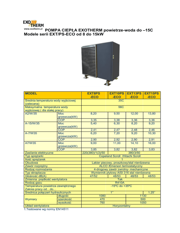 POMPA CIEPŁA EXOTHERM powietrze-woda do –15C Modele serii EXT/PS-ECO od 8 do 15kW MODEL Średnia temperatura wody wyjściowej (zalecana) Maksymalna temperatura wody wyjściowej ( dla stałej pracy) A2/W/35 Moc grzewcza(kW) COP A-15/W/35 Moc grzewcza(kW) COP A-7/W35 Moc grzewcza(kW) COP A7/W35 Moc grzewcza(kW) COP Zasilanie elektryczne Typ sprężarki Ilość sprężarek Obudowa Zawór rozprężny Rodzaj rozmrażania Typ skraplacza Głośność dB(A) Zmienna prędkość wentylatora Rodzaj gazu Temperatura powietrza zewnętrznego Zakres pracy od…do… Średnica połączeń hydraulicznych długość Wymiary szerokość wysokość Układ wentylatora 1.Testowane wg normy EN14511 EXT8PS -ECO EXT10PS EXT13PS EXT15PS -ECO -ECO -ECO 35C 56C 8,20 9,50 12,00 13,80 3,35 5,40 3,38 6,30 3,36 8,20 3,36 9,20 2,41 6,20 2,47 7,20 2,48 9,20 2,46 10,30 2,90 9,00 2,92 11,00 2,90 14,10 2,91 16,00 3,85 3,82 3,82 3,83 220(380)/1(3)/50 380/3/50 Copeland Scroll /Hitachi Scroll 1 Lakier piecowy, proszkowy/stal nierdzewna ALCO /Emerson termostatyczny 4-drogowy zawór zwrotny- mechaniczne Wymiennik płytowy AISI 316 stal nierdzewna 47/52 48/53 48/53 48/53 Tak R410A -15ºC do +35ºC 1’’ 1080 470 760 1.25’’ 1130 500 1050 Horyzontalny