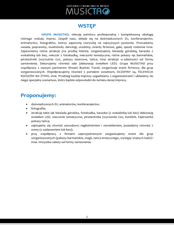 WSTĘP GRUPA MUSICTAO, oferuję państwu profesjonalną i kompleksową obsługę różnego rodzaju imprez. Zespół nasz, składa się na doświadczonych DJ, konferansjerów, animatorów, fotografów, którzy zapewnią rozrywkę na najwyższym poziomie. Prowadzimy wesela, poprawiny, studniówki, dancingi, urodziny, eventy firmowe, gale, zjazdy rodzinne inne. Zapewniamy różne atrakcje (na prośbę klienta, zorganizujemy biesiadę góralską, karaoke z wokalistką lub bez, wieczór z fotobudką, wieczorki tematyczne, różne pokazy np. barmańskie, pirotechniki (wyrzutnie Co2, pokazy laserowe, tańca, inne atrakcje w zależności od formy zamówienia. Dekorujemy również sale (dekorację światłem LED). Grupa MUSICTAO przy współpracy z naszym partnerem IDream Busines Travel, zorganizuje event firmowy, dla grup zorganizowanych. Współpracujemy również z portalem weselnym, OCZEPINY 24, TELEWIZJA RZESZÓW NA ŻYWO, inne. Przebieg każdej imprezy uzgadniamy z organizatorami i układamy do niego specjalny scenariusz, który będzie odpowiedni do tematu danej imprezy. Proponujemy: doświadczonych DJ, animatorów, konferansjerów; fotografie; atrakcję takie jak biesiada góralska, fotobudka, karaoke (z wokalistkę lub bez) dekorację światłem LED, wieczorki tematyczne, pirotechnika (wyrzutnie Co2, konfetti, Fajerwerki) pokazy tańca; zajmujemy się również zawodowo nagłośnieniem i oświetleniem, posiadamy również 2 sceny (z zadaszeniem lub bez); przy współpracy z firmami zaprzyjaźnionymi zorganizujemy event dla grup zorganizowanych (pokazy barmańskie, magii, tańca erotycznego, występy znanych ludzi) i inne. Wszystko zależy od formy zamówienia. 1 OFERTA Wesela Szanowni Państwo, doskonale zdajemy sobie sprawę z tego, że wesele jest to szczególny dzień, który pozostaje w pamięci na całe życie. To wyjątkowy moment dla każdej Młodej Pary, która chce się dzielić szczęściem ze swoimi bliskimi. Grając na weselach zawsze staramy się dopasować repertuar muzyczny do oczekiwań gości. Wiemy, że odpowiednio zestawiona muzyka i dobra atmosfera to podstawa dobrej zabawy, dlatego zawsze pytamy o oczekiwania skierowane w kierunku naszej grupy (Staramy się także sprostać wszystkim nawet najbardziej wymagającym oczekiwaniom). Nasza rola nie ogranicza się jednak tylko do grania. Podczas prowadzenia wesela zawsze wchodzimy w interakcję z jego uczestnikami poprzez prowadzenie zabaw, a wśród nich tej najważniejszej jaką są oczepiny! Prezentuję wybrane utwory z mojego bardzo bogatego repertuaru: Piosenki na pierwszy taniec - polska klasyka: Grzegorz Tomczak “Niebieska piosenka” Seweryn Krajewski „Wielka miłość” Lady Pank „Zawsze tam gdzie Ty” Farba „Chcę tu zostać” Czerwone Gitary „Słowo jedyne Ty” Eleni „Tylko w Twoich dłoniach” Zbigniew Wodecki „Oczarowanie” Anna Jantar „Moje jedyne marzenie” (znane też jako „Przetańczyć z Tobą chcę całą noc”) Kancelarya „Zabiorę Cię właśnie tam” (ostatnio bardzo spopularyzowana przez serial „39 i pół” i wykonanie Tomasza Karolaka) Krzysztof Krawczyk „Bo jesteś Ty” Kayah i Kiljański „Prócz Ciebie nic” 2 Piosenki na pierwszy taniec - propozycje polskie: Joanna Zagdańska „Rękawiczki” Universe „W perły zmienić deszcz” Sumptuastic „Kołyskanka” Borysewicz i Kukiz „Jeśli tylko chcesz” Kindla „Z kimś takim jak Ty” Krzysztof Krawczyk „Tylko Ty, tylko ja” Krzysztof Krawczyk „Preludium weselne” Olga Szomańska i Przemysław Branny „Niech mówią, że to nie jest miłość” Skaldowie „Wszystko mi mówi, że mnie ktoś pokochał” Justyna i Piotr „Ty i ja” (na melodię „Ci sara” Al Bano i Romina Power) Varius Manx „Dziękuję” Pectus „To co chciałbym Ci dać'' Beata Bartelik „Sen na pogodne dni” Natalia Kukulska „Zakochani” Natalia Kukulska i Piasek „Jesteś blisko mnie” Stachursky „Z każdym Twym oddechem” Ziyo „Magiczne słowa” Sławek Uniatowski „Kocham Cię” Karolina Kozak „Razem zestarzejmy się” Katarzyna Skrzynecka i Robert Janowski „Ten którego kocham” Piosenki na pierwszy taniec - zagraniczna klasyka: Leonard Cohen „Dance me to the end of love” Elton John “Can you feel the love tonight” Wet Wet Wet “Love is all around” Frank Sinatra “Strangers in the night” Metallica “Nothing else matters” Bill Medley & Jennifer Wernes “(I’ve had) The time of my life” (piosenka z filmu “Dirty Dancing”) Piosenki na pierwszy taniec - propozycje zagraniczne: Barbra Streisand “Woman in love” Bryan Adams & Barbra Streisand “I Finally Found” Bryan Adams “Everything I do (I do it for you)” Bryan Adams “Heaven” Andrea Bocelli & Laura Pausini “Vivo Per Lei” Glenn Medeiros “Nothing’s gonna change my love for you” Jennifer Rush “The power of love” Rod Stewart “When I need you” Rod Stewart “Have I told you lately (that I love you)” 3 Richard Marx “Right here waiting” Foreigner “I want to know what love is” Whitney Houston “I will always love you” Whitney Houston “I have nothing” Michael Bolton “When a man loves a woman” Celine Dion “I love you” Celine Dion “Because you loved me” Bon Jovi “Always” Bon Jovi “Thank you for loving me” Peter Cetera “Forever tonight” All 4 One “I swear” Savage Garden “Truly madly deeply” Scorpions “You and I” Bee Gees “How deep is your love” Goo Goo Dolls “Iris” Shania Twain “You’re still the one” W ramach podziękowań mogą zostać wykonane następujące piosenki dla rodziców. Urszula Sipińska – Cudownych rodziców mam Jack – Dziękuje rodzicom Bernadeta Kowalska – Kochani Moi Rodzice Cliver – Podziękowania dla rodziców Anna Jantar – Radość najpiękniejszych lat Bayer full – Walc dla rodziców Jacek Kierok – Miłość Rodzicielska Preludium – To dzięki Wam Kumpliki – Rodzice Janusz Zylka – Dla Mamy i Taty Dw