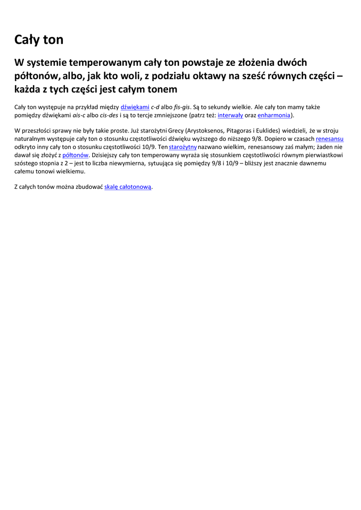 Cały ton W systemie temperowanym cały ton powstaje ze złożenia dwóch półtonów, albo, jak kto woli, z podziału oktawy na sześć równych części – każda z tych części jest całym tonem Cały ton występuje na przykład między dźwiękami c-d albo fis-gis. Są to sekundy wielkie. Ale cały ton mamy także pomiędzy dźwiękami ais-c albo cis-des i są to tercje zmniejszone (patrz też: interwały oraz enharmonia). W przeszłości sprawy nie były takie proste. Już starożytni Grecy (Arystoksenos, Pitagoras i Euklides) wiedzieli, że w stroju naturalnym występuje cały ton o stosunku częstotliwości dźwięku wyższego do niższego 9/8. Dopiero w czasach renesansu odkryto inny cały ton o stosunku częstotliwości 10/9. Ten starożytny nazwano wielkim, renesansowy zaś małym; żaden nie dawał się złożyć z półtonów. Dzisiejszy cały ton temperowany wyraża się stosunkiem częstotliwości równym pierwiastkowi szóstego stopnia z 2 – jest to liczba niewymierna, sytuująca się pomiędzy 9/8 i 10/9 – bliższy jest znacznie dawnemu całemu tonowi wielkiemu. Z całych tonów można zbudować skalę całotonową.