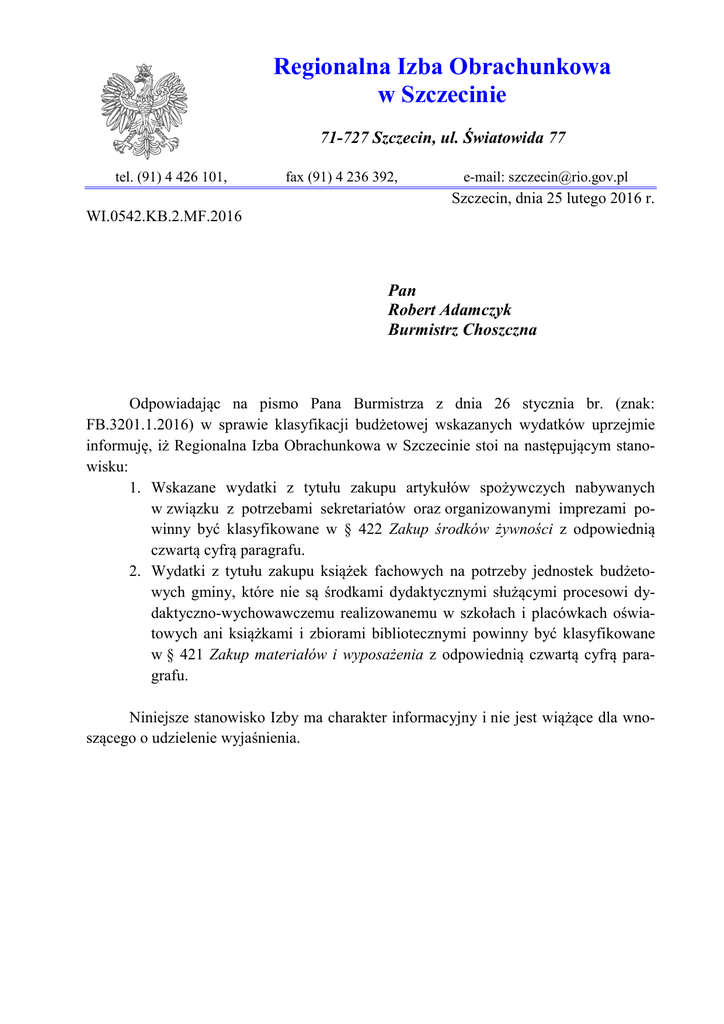 Regionalna Izba Obrachunkowa w Szczecinie 71-727 Szczecin, ul. Światowida 77 tel. (91) 4 426 101, fax (91) 4 236 392, e-mail: [email protected] Szczecin, dnia 25 lutego 2016 r. WI.0542.KB.2.MF.2016 Pan Robert Adamczyk Burmistrz Choszczna Odpowiadając na pismo Pana Burmistrza z dnia 26 stycznia br. (znak: FB.3201.1.2016) w sprawie klasyfikacji budżetowej wskazanych wydatków uprzejmie informuję, iż Regionalna Izba Obrachunkowa w Szczecinie stoi na następującym stanowisku: 1. Wskazane wydatki z tytułu zakupu artykułów spożywczych nabywanych w związku z potrzebami sekretariatów oraz organizowanymi imprezami powinny być klasyfikowane w § 422 Zakup środków żywności z odpowiednią czwartą cyfrą paragrafu. 2. Wydatki z tytułu zakupu książek fachowych na potrzeby jednostek budżetowych gminy, które nie są środkami dydaktycznymi służącymi procesowi dydaktyczno-wychowawczemu realizowanemu w szkołach i placówkach oświatowych ani książkami i zbiorami bibliotecznymi powinny być klasyfikowane w § 421 Zakup materiałów i wyposażenia z odpowiednią czwartą cyfrą paragrafu. Niniejsze stanowisko Izby ma charakter informacyjny i nie jest wiążące dla wnoszącego o udzielenie wyjaśnienia.