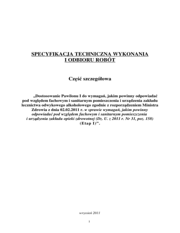 SPECYFIKACJA TECHNICZNA WYKONANIA I ODBIORU ROBÓT Część szczegółowa ,,Dostosowanie Pawilonu I do wymagań, jakim powinny odpowiadać pod względem fachowym i sanitarnym pomieszczenia i urządzenia zakładu lecznictwa odwykowego alkoholowego zgodnie z rozporządzeniem Ministra Zdrowia z dnia 02.02.2011 r. w sprawie wymagań, jakim powinny odpowiadać pod względem fachowym i sanitarnym pomieszczenia i urządzenia zakładu opieki zdrowotnej (Dz. U. z 2011 r. Nr 31, poz. 158) (Etap I)”. wrzesień 2011 1 1. Zakres robót objętych specyfikacją 1.1. Utworzenie węzła sanitarnego męskiego - urządzenia wraz z montażem. 1.2. Utworzenie węzła sanitarnego damskiego i dla osób niepełnosprawnych – urządzenia wraz z montażem. 1.3. Utworzenie węzła sanitarnego dla personelu – urządzenia wraz z montażem. 1.4. Przebudowa instalacji wodociągowej: 1.4.1. Wykonanie nowych podejść; 1.4.2. Wymiana istniejącej instalacji zimnej wody; 1.4.3. Wymiana istniejącej instalacji ciepłej wody. 1.5. Przebudowa instalacji kanalizacyjnej: 1.5.1. Wykonanie nowych podejść; 1.5.2. Wymiana istniejącej instalacji fi 50 mm; 1.5.3. Wymiana istniejącej instalacji fi 110 mm. 1.6. Roboty budowlane: 1.6.1. Wymiana stolarki okiennej i drzwiowej; 1.6.2. Wymiana gresów i glazury wraz z podkładkami i izolacjami; 1.6.3. Utworzenie ścianek działowych oraz systemowych; 1.6.4. Utworzenie wejścia z drzwiami; 1.6.5. Prace malarskie; 1.6.6. Udrożnienie i modernizacja wentylacji; 1.6.7. Wymiana istniejącego i wykonanie nowego oświetlenia. 2. Część opisowa robót objętych specyfikacją UWAGA! Przed przystąpieniem do prac należy zabezpieczyć istniejące posadzki oraz inne powierzchnie i urządzenia w miejscach prowadzonych prac przed uszkodzeniami mechanicznymi, za pomocą kartonów lub/i folii budowlanej gr 2,0 mm. Wykonawca na własny koszt usunie uszkodzenia powstałe wskutek niezabezpieczenia powierzchni i prowadzonych prac!!! 1) Utworzenie węzła sanitarnego męskiego, damskiego i dla osób niepełnosprawnych oraz węzła sanitarnego dla personelu – urządzenia wraz z montażem - biały montaż: • Montaż i rozmieszczenie urządzeń wykonać zapewniając właściwy dostęp do urządzeń i armatury oraz zgodnie z wymogami DTR tych urządzeń; • Materiały i urządzenia stosowane do wykonania instalacji muszą posiadać atest;. • Wykonać uchwyty montażowe armatury. Szczegółowe informacje dotyczące technologii wykonania i montażu,oraz sposób rozmieszczenia urządzeń zawarto w części rysunkowej opracowania. 2 2) Przebudowa instalacji wodnej: • do mocowania rur wykonać uchwyty przesuwne z tworzyw sztucznych; • wszystkie przejścia przewodów przez przegrody budowlane (ściany, stropy) wykonać w tulejach ochronnych PCV o długości co najmniej o 1 cm większych od grubości ścian, umożliwiających swobodne przemieszczenie przewodu w ścianie lub stropie; • przestrzeń między tuleją a przewodem wypełnić kitem elastycznym lub plastycznym; • w obszarze tulei nie może być wykonane żadne połączenie na przewodzie; • w przypadku stosowania uchwytów stalowych, pomiędzy obejmą stalową a przewodem należy umieścić na całym obwodzie przekładkę ochronną z gumy lub taśmy z miękkiego PCV; • niedopuszczalne jest mocowanie przewodów za pomocą haków stalowych. Szczegółowe informacje dotyczące technologii wykonania i montażu,oraz sposób rozmieszczenia urządzeń zawarto w części rysunkowej opracowania. 3) Przebudowa instalacji kanalizacyjnej: • do mocowania rur wykonać uchwyty przesuwne z tworzyw sztucznych; • wszystkie przejścia przewodów przez przegrody budowlane (ściany, stropy) wykonać w tulejach ochronnych PCV o długości co najmniej o 1 cm większych od grubości ścian, umożliwiających swobodne przemieszczenie przewodu w ścianie lub stropie; • przestrzeń między tuleją a przewodem wypełnić kitem elastycznym lub plastycznym, przejście przez strefy pożarowe zabezpieczyć ogniowo; • w obszarze tulei nie może być wykonane żadne połączenie na przewodzie; • w przypadku stosowania uchwytów stalowych, pomiędzy obejmą stalową a przewodem należy umieścić na całym obwodzie przekładkę ochronną z gumy lub taśmy z miękkiego PCV; • niedopuszczalne jest mocowanie przewodów za pomocą haków stalowych. Szczegółowe informacje dotyczące technologii wykonania i montażu,oraz sposób rozmieszczenia urządzeń zawarto w części rysunkowej opracowania. 3 4) Roboty budowlane: a) wymiana starych okien drewnianych na stolarkę z PCV o następujących parametrach: • profile pięciokomorowe wykonane z wysokoudarowego PVC w kolorze białym o szer. nie mniejszej niż 70 mm; • • • • • • • • • • • • • • okna zgodne z załączonym zestawieniem stolarki okiennej, w którym przedstawiono ich architektoniczny wystrój i podział; okucia obwiedniowe z mikro wentylacją w skrzydłach RU, posiadające zaczep antywyważeniowy, blokada błędnego położenia klamki; trwałe uszczelki systemowe; od wewnątrz zamontować szybę bezpieczną”6” - klejoną, z zewnątrz zamontować zwykłą szybę okienną; wartości współczynnika przenikania ciepła w środkowej części szyby zespolonej Ug=1,0 W/m2K; kwatery uchylne lub rozwieralne wg zestawienia okien; okna muszą posiadać zabezpieczenie przed możliwością otworzenia przez pacjentów (np. klamki luzem, a w ramiakach zaślepki demontowalne, klamka konduktorska lub inne rozwiązanie); okna w wersji rozszczelnionej (szczelnej infiltracyjnej) współczynnik infiltracji powietrza a=0,5-1,0 m3/(m*h*daPa2/3); okna wyposażyć należy bezwzględnie w nawietrzaki systemowe – nie dopuszcza się nawietrzaków higroskopijnych; ilość nawietrzaków dopasować do normowych wartości wymiany powietrza w zależności od funkcji pomieszczenia, w którym dane okno jest przewidziane; parapet wewnętrzny wykonać z konglomeratu gr. 3 cm; parapet zewnętrzny – po