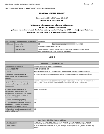 Strona 1 z 5 Identyfikator wydruku: RP/248734/12/20170119184217 CENTRALNA INFORMACJA KRAJOWEGO REJESTRU SĄDOWEGO KRAJOWY REJESTR SĄDOWY Stan na dzień 19.01.2017 godz. 18:42:17 Numer KRS: 0000248734 Informacja odpowiadająca odpisowi aktualnemu Z REJESTRU PRZEDSIĘBIORCÓW pobrana na podstawie art. 4 ust. 4aa ustawy z dnia 20 sierpnia 1997 r. o Krajowym Rejestrze Sądowym (Dz. U. z 2007 r. Nr 168, poz.1186, z późn. zm.) Data rejestracji w Krajowym Rejestrze Sądowym 16.01.2006 Ostatni wpis Numer wpisu 12 Sygnatura akt PO.VIII NS-REJ.KRS/11567/16/335 Oznaczenie sądu SĄD REJONOWY POZNAŃ - NOWE MIASTO I WILDA W POZNANIU, VIII WYDZIAŁ GOSPODARCZY KRAJOWEGO REJESTRU SĄDOWEGO Data dokonania wpisu 06.06.2016 Dział 1 Rubryka 1 - Dane podmiotu 1.Oznaczenie formy prawnej ODDZIAŁ ZAGRANICZNEGO PRZEDSIĘBIORCY 2.Numer REGON/NIP REGON: 300220471, NIP: --- 3.Nazwa MY TEAM POLSKA SPÓŁKA Z OGRANICZONĄ ODPOWIEDZIALNOŚCIĄ ODDZIAŁ W POLSCE 4.Nazwa lub firma przedsiębiorcy zagranicznego oraz oznaczenie formy prawnej MY TEAM POLSKA SOCIEDAD LIMITADA (SPÓŁKA Z OGRANICZONĄ ODPOWIEDZIALNOŚCIĄ) 5.Nazwa rejestru, numer w rejestrze, określenie ogranu prowadzącego rejestr i przechowującego akta przedsiębiorcy zagranicznego REJESTR HANDLOWY WALENCJI I PROWINCJI, TOM 8256, KSIĘGA 5547, DZIAŁ 74 STRONA NR V107119, WPIS 1 PROWADZONY PRZEZ REJESTR HANDLOWY WALENCJI I PROWINCJI 6.Prawo państwa właściwego dla przedsiębiorcy zagranicznego, jeśli przedsiębiorca nie podlega prawu jednego z państw członkowskich UE lub EFTA stron umowy o EOG PRAWO HISZPAŃSKIE 7.Dane o wcześniejszej rejestracji ------ 8.Czy przedsiębiorca prowadzi działalność gospodarczą z innymi podmiotami na podstawie umowy spółki cywilnej? NIE 9.Czy podmiot posiada status organizacji pożytku publicznego? NIE Rubryka 2 - Siedziba i adres oddziału 1.Siedziba oddziału kraj POLSKA, woj. WIELKOPOLSKIE, powiat M. POZNAŃ, gmina M. POZNAŃ, miejsc. POZNAŃ 2.Adres oddziału ul. FLORIANA STABLEWSKIEGO, nr 47, lok. 4, miejsc. POZNAŃ, kod 60-213, poczta POZNAŃ, kraj POLSKA Strona 2 z 5 Identyfikator wydruku: RP/248734/12/20170119184217 3.Siedziba i adres zakładu głównego przedsiębiorcy zagranicznego kraj HISZPANIA, woj. PROWINCJA WALENCJA, powiat ---, gmina ---, miejsc. WALENCJA ul. CALLE TRANSITS, nr 2-3, lok. ---, kod 46002, poczta WALENCJA 4.Adres poczty elektronicznej ------ 5.Adres strony internetowej ------ Dział 2 Rubryka 1 - Organ uprawniony do reprezentowania zagranicznego przedsiębiorcy 1.Nazwa organu uprawnionego do reprezentowania podmiotu ZARZĄDZAJĄCY 2.Sposób reprezentacji zagranicznego przedsiębiorcy REPREZENTACJA JEDNOOSOBOWA Podrubryka 1 Dane osób wchodzących w skład organu 1 1.Nazwisko / Nazwa lub firma MONTALVA JORNET 2.Imiona ENRIQUE 3.Funkcja w organie reprezentującym JEDYNY ZARZĄDZAJĄCY Rubryka 2 - Organ nadzoru Brak wpisów Rubryka 3 - Prokurenci Brak wpisów Rubryka 4 - Osoby reprezentujące zagranicznego przedsiębiorcę w oddziale 1 1.Nazwisko WOLARSKA SOBOCIŃSKA 2.Imiona AGATA HANNA 3.Numer PESEL 74021204024 Dział 3 Rubryka 1 - Przedmiot działalności 1.Przedmiot przeważającej działalności przedsiębiorcy 1 --- 2.Przedmiot pozostałej działalności przedsiębiorcy 1 74, 1, , PUBLIC RELATIONS ORAZ DORADZTWO DOTYCZĄCE WSZELKIEGO RODZAJU EKSPORTU I IMPORTU 2 45, 2, , BUDOWA DLA SIEBIE LUB OSÓB TRZECICH WSZELKIEGO RODZAJU NIERUCHOMOŚCI MIEJSKICH I WIEJSKICH 3 70, 1, , KUPNO, SPRZEDAŻ DLA SIEBIE LUB OSÓB TRZECICH WSZELKIEGO RODZAJU NIERUCHOMOŚCI MIEJSKICH I WIEJSKICH 4 70, 2, , WYNAJEM NIEFINANSOWY DLA SIEBIE LUB OSÓB TRZECICH WSZELKIEGO RODZAJU Strona 3 z 5 Identyfikator wydruku: RP/248734/12/20170119184217 NIERUCHOMOŚCI MIEJSKICH I WIEJSKICH 5 70, 3, , PROMOWANIE DLA SIEBIE LUB OSÓB TRZECICH WSZELKIEGO RODZAJU NIERUCHOMOŚCI MIEJSKICH I WIEJSKICH Rubryka 2 - Wzmianki o złożonych dokumentach Rodzaj dokumentu Nr kolejny w polu Data złożenia Za okres od do 1.Wzmianka o złożeniu rocznego sprawozdania finansowego 1 29.06.2007 01.01.2006 R. - 31.12.2006 R. 2 13.08.2008 2007 R. 3 03.07.2009 OD 01 STYCZNIA 2008 R. DO 31 GRUDNIA 2008 R. 4 30.06.2010 01.01.2009R. - 31.12.2009R. 5 01.07.2011 OD 01 STYCZNIA 2010 DO 31 GRUDNIA 2010 ROKU 6 31.05.2012 01.01.2011 R. - 31.12.2011 R. ***** 01.01.2006 R. - 31.12.2006 R. ***** 2007 R. ***** OD 01 STYCZNIA 2008 R. DO 31 GRUDNIA 2008 R. 3.Wzmianka o złożeniu uchwały 1 lub postanowienia o 2 zatwierdzeniu sprawozdania 3 finansowego Rubryka 3 Brak wpisów Rubryka 4 - Przedmiot działalności statutowej organizacji pożytku publicznego Brak wpisów Rubryka 5 - Informacja o dniu kończącym rok obrotowy Brak wpisów Dział 4 Rubryka 1 - Zaległości 1 2 1.Charakter zaległości PODATKOWA 2.Oznaczenie organu wystawiającego tytuł wykonawczy, data wszczęcia egzekucji i numer tytułu wykonawczego NACZELNIK PIERWSZEGO WIELKOPOLSKIEGO URZĘDU SKARBOWEGO W POZNANIU, 30.10.2014, SM 5/1532/14 3.Wysokość zaległości 9 055,00 ZŁ 4.Informacja o zakończeniu egzekucji ---, --- 1.Charakter zaległości PODATKOWA 2.Oznaczenie organu wystawiającego tytuł wykonawczy, data wszczęcia NACZELNIK PIERWSZEGO WIELKOPOLSKIEGO URZĘDU SKARBOWEGO W POZNANIU, 29.10.2014, SM 5/1608/14 Strona 4 z 5 Identyfikator wydruku: RP/248734/12/20170119184217 egzekucji i numer tytułu wykonawczego 3 4 5 3.Wysokość zaległości 3 973,00 ZŁ 4.Informacja o zakończeniu egzekucji ---, --- 1.Charakter zaległości NA RZECZ ZUS 2.Oznaczenie organu wystawiającego tytuł wykonawczy, data wszczęcia egzekucji i numer tytułu wykonawczego DYREKTOR I ODDZIAŁU ZAKŁADU UBEZPIECZEŃ SPOŁECZNYCH W POZNANIU, 21.11.2014, TW1290014005604 3.Wysokość zaległości 7 436,60 ZŁ 4.Informacja o zakończeniu egzekucji ---, --- 1.Charakter zaległości NA RZECZ ZUS 2.Oznaczenie organu wystawiającego tytuł wykonawczy, data wszczęcia egzekucji i numer tytułu wykonawczego DYREKTOR I ODDZIAŁU ZAKŁADU UBEZPIECZEŃ SPOŁECZNYCH W POZNANIU, 21.11.2014, TW1290014005605 3.Wysoko