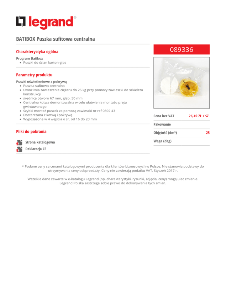 BATIBOX Puszka sufitowa centralna Charakterystyka ogólna 089336 Program Batibox Puszki do ścian karton-gips Parametry produktu Puszki oświetleniowe z pokrywą Puszka sufitowa centralna Umożliwia zawieszenie ciężaru do 25 kg przy pomocy zawieszki do szkieletu konstrukcji średnica otworu 67 mm, głęb. 50 mm Centralna kotwa demontowalna w celu ułatwienia montażu pręta gwintowanego Szybki montaż puszek za pomocą zawieszki nr ref 0892 43 Dostarczana z kotwą i pokrywą Wyposażona w 4 wejścia o śr. od 16 do 20 mm Cena bez VAT 26,49 ZŁ / SZ. Pakowanie Pliki do pobrania Strona katalogowa Objętość (dm³) Waga (dag) Deklaracja CE * Podane ceny są cenami katalogowymi producenta dla klientów biznesowych w Polsce. Nie stanowią podstawy do utrzymywania ceny odsprzedaży. Ceny nie zawierają podatku VAT. Styczeń 2017 r. Wszelkie dane zawarte w e-katalogu Legrand (np. charakterystyki, rysunki, zdjęcia, ceny) mogą ulec zmianie. Legrand Polska zastrzega sobie prawo do dokonywania tych zmian. 25