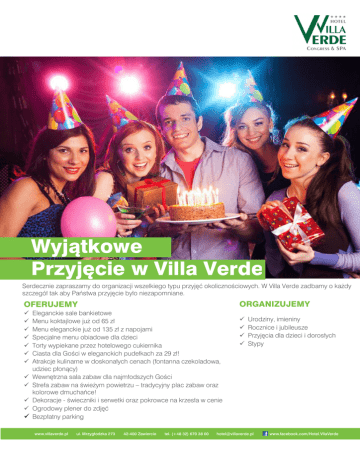 Wyjątkowe Przyjęcie w Villa Verde Serdecznie zapraszamy do organizacji wszelkiego typu przyjęć okolicznościowych. W Villa Verde zadbamy o każdy szczegół tak aby Państwa przyjęcie było niezapomniane. ORGANIZUJEMY OFERUJEMY Eleganckie sale bankietowe Menu koktajlowe już od 65 zł Menu eleganckie już od 135 zł z napojami Specjalne menu obiadowe dla dzieci Torty wypiekane przez hotelowego cukiernika Ciasta dla Gości w eleganckich pudełkach za 29 zł! Atrakcje kulinarne w doskonałych cenach (fontanna czekoladowa, udziec płonący) Wewnętrzna sala zabaw dla najmłodszych Gości Strefa zabaw na świeżym powietrzu – tradycyjny plac zabaw oraz kolorowe dmuchańce! Dekoracje - świeczniki i serwetki oraz pokrowce na krzesła w cenie Ogrodowy plener do zdjęć Bezpłatny parking www.villaverde.pl ul. Mrzygłodzka 273 42-400 Zawiercie tel. (+48 32) 670 38 00 Urodziny, imieniny Rocznice i jubileusze Przyjęcia dla dzieci i dorosłych Stypy [email protected] www.facebook.com/Hotel.VllaVerde PROPOZYCJA I PROPOZYCJA II 135 PLN /osoba 145 PLN /osoba ZUPA Bulion drobiowo-wołowy z cielęcymi pulpecikami i julienne warzywnym ZUPA Zupa z prawdziwków z domowymi łazankami i creme fraiche PATERY MIĘS PATERY DAŃ GŁOWNYCH Tradycyjna rolada śląska Fileciki z kurczaka nadziewane serem gorgonzola Pieczeń ze schabu nadziewana grzybami leśnymi Pieczeń z szynki z miodem i goździkami Devolaile z masłem i kolendrą Zraz wołowy po staropolsku Dorsz pieczony z sosem Veloute DODATKI Kluski śląskie Ziemniaki młode glazurowane masłem i koperkiem Ryż z warzywami Surówka z marchwi z mandarynkami Kapusta czerwona z jabłkami i wędzonką Warzywa z grilla - marynowane w oliwie Sosy: pieczeniowy, sos z prawdziwków DODATKI DESER Ziemniaki młode w glazurze z masła i świeżego koperku Ryż jaśminowy Kluski śląskie Surówka z marchewki i pomarańczy Sałatka z ogórka i czerwonej cebuli Buraczki zasmażane Młoda kapusta zasmażana z kminkiem i koprem Puszyste Tiramisu na sosie cappuccino z gałką lodów waniliowych DESER Mini torcik czekoladowy z truskawkami i pianką miętową BUFET SŁODKI Patery owoców sezonowych Wybór ciastek koktajlowych i ciast naszego wypieku BUFET SŁODKI Patery owoców sezonowych Wybór ciastek koktajlowych i ciast naszego wypieku ZIMNA PŁYTA Kolorowa galantyna z drobiu Schab nadziewany suszonymi śliwkami podawany w plastrach na zimno Jajka faszerowane pikantnymi pastami Deski serów pleśniowych i twardych podawane z winogronami i gruszkami nadziewanym żurawiną Śledzie marynowane w korzennych przyprawach Wybór pieczonych mięs marynowanych w ziołach Sałatka hawajska z pieczonym indykiem i ananasem Pikantna sałatka meksykańska z czerwoną fasolą Pikle i świeże warzywa Wybór świeżego pieczywa GORĄCA KOLACJA Delikatna potrawka z cielęciny z kurkami w śmietanie NAPOJE Woda mineralna niegazowana bez ograniczeń Soki owocowe 100%, napoje gazowane firmy PEPSI 1L/osoba ZIMNA PŁYTA Peklowana pieczeń wieprzowa z marynowanymi buraczkami i fetą Faszerowany mostek jagnięcy świeżymi ziołami i szynką parmeńską Galantyna z kurczak z pistacjami Wybór sosów i dresingów: sos jogurtowo-czosnkowy, salsa Rosso, tzatziki, chutney cukiniowo-melonowy Deska serów z winogronami i wołoskimi orzechami Jajka faszerowane łososiem wędzonym na gorąco Tatar z marynowanego śledzia z jabłkiem i bazyliowym Pesto Sałatka z pomidorów z włoskim salami Sałatka z fasolki szparagowej z pieczonymi polędwiczkami i grzankami ziołowymi Wybór świeżego pieczywa i masełek smakowych GORĄCA KOLACJA Żurek staropolski z jajkiem zapiekany w chlebowej misie NAPOJE Woda mineralna niegazowana bez ograniczeń Soki owocowe 100%, napoje gazowane firmy PEPSI 1L/osoba www.villaverde.pl ul. Mrzygłodzka 273 42-400 Zawiercie tel. (+48 32) 670 38 00 [email protected] www.facebook.com/Hotel.VillaVerde PROPOZYCJA III PROPOZYCJA IV 155 PLN /osoba 150 PLN /osoba ZUPA Tradycyjny rosół z kury z makaronem i kluskami drobiowymi PRZYSTAWKA Tatar z łososia z avokado i pietruszkowym pesto PATERY DAŃ GŁOWNYCH Kieszonka drobiowa faszerowana pieczarkami i mozzarellą w panierce parmezanowej Rolada schabowa z brokułami i mozzarellą Grillowany łosoś z młoda porą i kaparami Sztufada wołowa nadziewana młodą marchwią i wędzonym boczkiem DANIE GŁÓWNE SERWOWANE Polędwiczka w chrupiącej ziołowej panierce z grillowanym serem halloumi, serwowana z risotto szpinakowoczosnkowym, bukiet sałat i świeżych warzyw z sosem vinaigrett DESER Nugat czekoladowy z lodami pralinowymi DODATKI Ziemniaki młode pieczone z tymiankiem Ryż szafranowy Kluski śląskie Młoda kapusta zasmażana Warzywa gotowane z masłem ziołowym Surówka z marchwi i pomarańczy ZIMNA PŁYTA Sałatka z grillowanych warzyw z serem feta Sałatka cesarska Sałatka włoska z tuńczykiem i jajkami przepiórczymi Pasztet z kaczki z glazurowanymi figami Roladki z pstrąga zawijane w plastrach cukinii Galaretka z kurczaka Koktajl z krewetek na bukiecie sałat Polędwiczka wieprzowa faszerowana leśnymi grzybami Sushi Wybór świeżego pieczywa i masełek smakowych DESER Strudel jabłkowy z sosem waniliowym i lodami czekoladowymi BUFET SŁODKI Patery owoców sezonowych Wybór ciastek koktajlowych i ciast naszego wypieku ZIMNA PŁYTA Wybór mięs pieczonych z piklami i trzema sosami (tatarski, tysiąca wysp, czosnkowym) Pasztet staropolski z grzybami i sosem cumberland Rolada z kurczaka nadziewana pistacjami Rożki z pieczonego schabu na musie chrzanowym Mini galaretki drobiowe z jajkiem i zielonym groszkiem Roladki z szynki na tradycyjnej sałatce jarzynowej Sola na flanie szpinakowym zapiekanym z serem cheddar Śledzie po kaszubsku z marynowaną cebulką Deska serów z marynowaną gruszką i orzechami Sałatka z grillowanego kurczaka z kukurydzą, ananasem i dresingiem cesarskim Sałatka Szopska z marynowanym owczym serem i dresingiem balsamicznym Wybór świeżego pieczywa i masełek smakowych BUFET SŁODKI Panna C