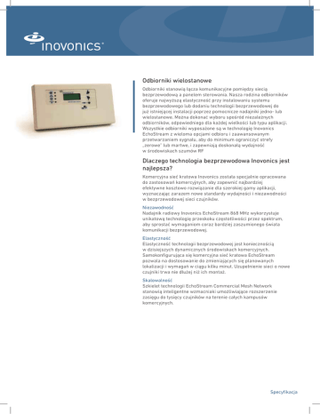 Odbiorniki wielostanowe Odbiorniki stanowią łącza komunikacyjne pomiędzy siecią bezprzewodową a panelem sterowania. Nasza rodzina odbiorników oferuje najwyższą elastyczność przy instalowaniu systemu bezprzewodowego lub dodaniu technologii bezprzewodowej do już istniejącej instalacji poprzez pomocnicze nadajniki jedno- lub wielostanowe. Można dokonać wyboru spośród niezależnych odbiorników, odpowiedniego dla każdej wielkości lub typu aplikacji. Wszystkie odbiorniki wyposażone są w technologię Inovonics EchoStream z wieloma opcjami odbioru i zaawansowanym przetwarzaniem sygnału, aby do minimum ograniczyć strefy „zerowe” lub martwe, i zapewniają doskonałą wydajność w środowiskach szumów RF Dlaczego technologia bezprzewodowa Inovonics jest najlepsza? Komercyjna sieć kratowa Inovonics została specjalnie opracowana do zastosowań komercyjnych, aby zapewnić najbardziej efektywne kosztowo rozwiązanie dla szerokiej gamy aplikacji, wyznaczając zarazem nowe standardy wydajności i niezawodności w bezprzewodowej sieci czujników. Niezawodność Nadajnik radiowy Inovonics EchoStream 868 MHz wykorzystuje unikatową technologię przeskoku częstotliwości przez spektrum, aby sprostać wymaganiom coraz bardziej zaszumionego świata komunikacji bezprzewodowej. Elastyczność Elastyczność technologii bezprzewodowej jest koniecznością w dzisiejszych dynamicznych środowiskach komercyjnych. Samokonfigurująca się komercyjna sieć kratowa EchoStream pozwala na dostosowanie do zmieniających się planowanych lokalizacji i wymagań w ciągu kilku minut. Uzupełnienie sieci o nowe czujniki trwa nie dłużej niż ich montaż. Skalowalność Szkielet technologii EchoStream Commercial Mesh Network stanowią inteligentne wzmacniaki umożliwiające rozszerzenie zasięgu do tysięcy czujników na terenie całych kampusów komercyjnych. Specyfikacja Do czego potrzebny jest nadajnik radiowy EchoStream? Aby zapewnić niezawodność! Częstotliwości radiowe stają się coraz bardziej zatłoczone, w miarę jak świat wchodzi w technologię bezprzewodową. Inovonics EchoStream wykorzystuje unikatową technologię rozpraszania widma, aby zmaksymalizować zasięg i niezawodność. Praktycznie wszystkie konkurencyjne systemy bezprzewodowe wysyłają informacje w jednym kanale o bardzo wąskim paśmie. Jakakolwiek ingerencja w paśmie może spowodować nieodebranie sygnałów. Konkurencyjne produkty wąskopasmowe Technologia Inovonics EchoStream opiera się na wysyłaniu całkowicie powtarzalnych wiadomości w wielu różnych kanałach w całym zatwierdzonym paśmie, tworząc najbardziej niezawodny z dostępnych systemów bezprzewodowych. Bezprzewodowe wieloczęstotliwościowe produkty Inovonics EchoStream Funkcje odbiornika niezależnego • Zgodność z klasą ETSI 1 oraz europejską normą EN50131-1, klasa bezpieczeństwa 2. • Obsługuje nadajniki jedno- i wielostanowe. • Tryb testowy systemu pozwala autoryzowanym użytkownikom na przeprowadzanie testów wszystkich nadajników zaprogramowanych w systemie. • Poziomy dostępu chronione hasłem dla użytkownika końcowego, użytkownika autoryzowanego i autoryzowanego instalatora. • Wykrywanie zatorów monitoruje wszystkie kanały RF pod kątem zakłóceń. • Obsługa konfiguracji normalnie rozwarty (N/O) lub normalnie zwarty (N/C). • Styk resetowania umożliwiający zdalne resetowanie odbiornika. • Styk sabotażowy umożliwiający zdalne monitorowanie sabotażu. Kompatybilne nadajniki wielostanowe • EE1210W – nadajnik drzwi/okna z kontaktronem. • EE1212 – uniwersalny nadajnik z podwójnym wejściem. • EE1215W – nadajnik drzwi/okna z naściennym stykiem sabotażowym i kontaktronem. • EE1216 – nadajnik z podwójnym wejściem z naściennym stykiem sabotażowym. • EE1236D – nadajnik do zawieszania, trójstanowy, z klipsem z podwójnym przyciskiem. • EE1238D – nadajnik do zawieszania, dwustanowy, z klipsem z podwójnym przyciskiem. • EE1941 – jednokierunkowy moduł RF z podwójnym wejściem. Dodatkowe dane techniczne odbiornika Odbiornik Częstotliwość Wymiary EE4216M Zasilanie Maks. prąd Liczba nadajników Wyjścia bezpotencjałowe Wyj. przekaźnik 868 MHz 165 × 89 × 25 mm 10–14 V DC 400 mA 16 9 - EE4216MR 868 MHz 165 × 89 × 25 mm 10–14 V DC 400 mA 16 - 6 EE4232M 165 × 89 × 25 mm 10–14 V DC 400 mA 32 12 - 222 × 178 × 38 mm 10–14 V DC 600 mA 32 - 12 868 MHz EE4232MR 868 MHz EE4216M, EE4216MR, EE4232M zgodne z EN50131, klasa bezpieczeństwa 2; EN50130 klasa środowiskowa II. Odwiedź stronę www.inovonics.com, na której znajdują się informacje o przepisach dotyczących zgodności. • Środowisko robocze: od 0°C do 60°C, wilgotność względna do 90% (bez kondensatów). • Zakres i wykonanie dowolnego urządzenia bezprzewodowego zależą od konstrukcji i środowiska, w którym funkcjonuje. • Ciągłe doskonalenie naszych produktów może się wiązać ze zmianą specyfikacji bez powiadomienia.ia. Telefon: 1 303 939 93 36 • Faks: 1 303 939 89 77 • E-mail: [email protected] RoHS www.inovonics.com 0224.11-DSE0005 © 2011 Inovonics