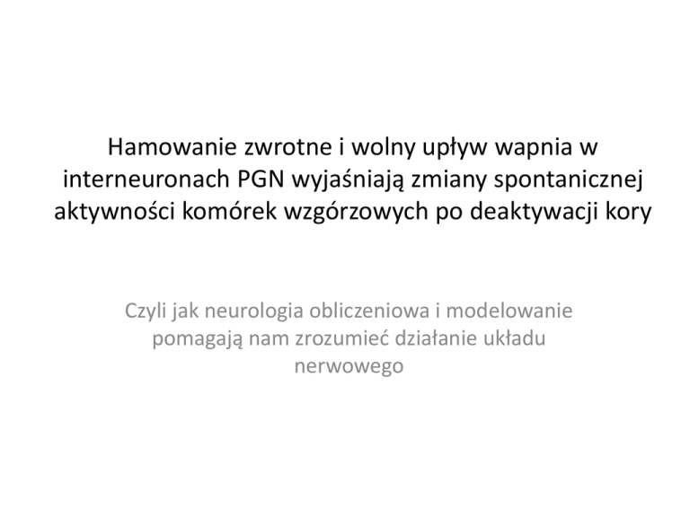 Hamowanie zwrotne i wolny upływ wapnia w interneuronach PGN wyjaśniają zmiany spontanicznej aktywności komórek wzgórzowych po deaktywacji kory Czyli jak neurologia obliczeniowa i modelowanie pomagają nam zrozumieć działanie układu nerwowego Wyniki doświadczenia nad wpływem kory na podkorowe ośrodki drogi wzrokowej (Waleszczyk et al. 2005) • Wpływ kory na aktywność ośrodków podkorowych - ciała kolankowatego bocznego (LGN) i ciała okołokolankowatego (PGN) - badano poprzez okresowe wyłączanie kory wzrokowej za pomocą chłodzenia u kota. Kobieta kot, droga wzrokowa (Wikipedia, zmodyfikowane) Wyniki doświadczenia nad wpływem kory na podkorowe ośrodki drogi wzrokowej (Waleszczyk et al. 2005) • Wpływ kory na aktywność ośrodków podkorowych - ciała kolankowatego bocznego (LGN) i ciała okołokolankowatego (PGN) - badano poprzez okresowe wyłączanie kory wzrokowej za pomocą chłodzenia u kota. • W wyniku deaktywacji kory wzrokowej zaobserwowano: – Spadek średniej aktywności w komórkach LGN – Wzrost średniej aktywności w komórkach PGN Kobieta kot, droga wzrokowa (Wikipedia, zmodyfikowane) Trudność w interpretacji wyników • Opierając się na najpełniejszym i najbardziej prawdopodobnym modelu połączeń wzgórza trudno o prostą interpretację wyników ze względu na wzajemne hamujące połączenia Cx PGN LGN Duże kółka - komórki, małe kółka - synapsy. Linia przerywana – połączenie zwrotne Ret – siatkówka, PGN – ciało okołokolankowate, TCR – kom.przekaźnikowe ciała kolankowatego bocznego (LGN), Int – interneurony LGN, Cx – kora. Int Ret Synapsa pobudzająca Synapsa hamująca Ahlsen et al., 1985 Model • Jednokomórkowa reprezentacja populacji neuronów • Punktowe komórki Hodgkin-Huxley zawierające zidentyfikowane prądy (na podstawie literatury) • 4 częstotliwości wejścia z siatkówki (10, 20, 40 i 83 Hz) • 6 topologii (na podstawie literatury) • Środowisko – Neuron 7.1 Badane topologie Cx LGN PGN Int Ret a. b. c. Cx PGN LGN Int Ret d. e. a. Prosta pętla wzgórzowo-korowa c. model wg. Debay, Destexhe and Bal (2001) e. model wg. Hillenbrand and van Hemmen (2001) f. b. model wg. Wörgötter et al. (1998) d. model wg. Einevoll and Plesser (2002) f. model wg. Ahlsen, Lindström and Lo (1985) Wyniki Firing rate (Hz) • Tylko modele uwzględniające wzajemne hamowanie komórek PGN otrzymujące pobudzenie LGN 30 z kory umożliwiały replikacje 25 wyników doświadczenia 20 15 10 5 Cx 0 Model II Model III Model IV Model V Model VI PGN PGN 20 Int Firing Rate (Hz) LGN 25 Ret Kora aktywna Kora nieaktywna 15 10 5 0 Model II Model III Model IV Model V Model VI Wyniki • Odtworzenie wyników doświadczenia Waleszczyk et al. 2005, było możliwe tylko dla wyższych częstotliwości badanego wejścia z siatkówki 25 Firing rate (Hz) 20 15 10 5 0 10 40 20 Retinal input frequency (Hz) 83 LGN– cortical input present LGN– cortical input eliminated PGN – cortical input present PGN – cortical input eliminated Difference significant for PGN Difference significant for LGN Wyniki • Potencjalny wpływ połączenia kora-PGN na reakcję komórek LGN na depolaryzacje 20 18 PGN LGN Ret Int LGN mean firing rate (Hz) Cx 16 14 12 10 -75 -50 -20 0 +20 +50 +75 Changes of the cortical input weight values [%] Model VI +100 Model VI with elimnated Cx-PGN connection • W wyniku deaktywacji kory wzrokowej zaobserwowano: – Spadek średniej aktywności w komórkach LGN – Wzrost średniej aktywności w komórkach PGN • Czyli: – Zarówno w populacji komórek LGN jak i PGN były komórki, których aktywność: • Wzrosła • Pozostała bez zmian • Lub spadła Wyniki • Zmiana tempa upływu wapnia jako możliwa przyczyna zróżnicowanej odpowiedzi komórek na deaktywację kory Wyniki • Zmiana tempa upływu wapnia jako możliwa przyczyna zróżnicowanej odpowiedzi komórek na deaktywację kory Wyniki • Zmiana tempa upływu wapnia w komórkach PGN jako możliwa przyczyna zróżnicowanej odpowiedzi komórek na deaktywację kory Podsumowanie • Wyników doświadczenia nie można wytłumaczyć prostym spadkiem pobudzenia komórek wzgórza • Odtworzenie wyników doświadczenia wymaga wzajemnego hamowania komórek PGN pobudzanych przez korę • Jednym z kluczowych czynników wpływających na odpowiedź komórek na deaktywację kory może być zależność aktywności komórek PGN od poziomu wapnia