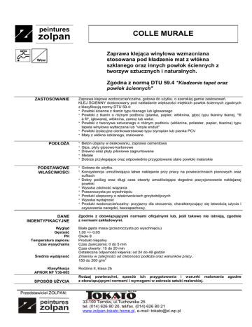 peintures COLLE MURALE zolpan Zaprawa klejąca winylowa wzmacniana stosowana pod kładzenie mat z włókna szklanego oraz innych powłok ściennych z tworzyw sztucznych i naturalnych. Wew Zgodna z normą DTU 59.4 "Kładzenie tapet oraz powłok ściennych" ZASTOSOWANIE PODŁOŻA PODSTAWOWE WŁAŚCIWOŚCI Zaprawa klejowa wodorozcieńczalna, gotowa do użytku, o szerokiej gamie zastosowań. KLEJ ŚCIENNY dostosowany pod nakładanie większości miękkich powłok ściennych zgodnych z klasyfikacją normy DTU 59.4: * Powłoki ścienne z tkanin typu tkanego lub igłowanego * Powłoki z tkanin o różnym podbiciu (pianka, papier, włóknina, gips) typu tkaniny tkanej, "fil à fil", igłowanej, włóknina, zamsz lub welur. * Powłoki z tworzywa sztucznego o różnym podbiciu (włóknina, poliester, papier, tkanina) typu tapeta winylowa wytłaczana lub "vinyle enduit" * Powłoki izolacyjne cienkowarstwowe typu styropian lub pianka PCV * Maty z włókna szklanego, malowane * * * * * Beton ubijany w deskowaniu, zaprawa cementowa Gips, płyty gipsowo-kartonowe Drewno oraz płyty pilśniowe zagruntowane Metale Dobrze przylegające oraz odpowiednio przygotowane stare powłoki malarskie * Gotowa do użytku. * Konsystencja umożliwiająca łatwe naklejanie przy pracy na powierzchniach pionowych oraz sufitach * Dobry poślizg oraz długi czas otwarty umożliwiające dogodne pozycjonowanie naklejanej * * * * * DANE INDENTYFIKACYJNE Wygląd Gęstość PH Temperatura zapłonu Czas wysychania Średnia wydajność Klasyfikacja AFNOR NF Y36-005 SPOSÓB UŻYCIA powłoki Wysoka zdolność wiązania Przezroczysta po wyschnięciu Produkt ulepszony o właściwościach grzybobójczych Wysoka wydajność Produkt wodorozcieńczalny: przyjazny dla otoczenia, charakteryzujący się łatwością użycia i czyszczenia narzędzi, bezzapachowy. Zgodnie z obowiązującymi normami oficjalnymi lub, jeśli takowe nie istnieją, zgodnie z normami zakładowymi. Biała gęsta masa (przezroczysta po wyschnięciu) 1,00 +/- 0,05 Około 8 Produkt niepalny Czas żywiczenia: 0 do 5 min Czas otwarty: 15 do 20 min Ostateczna odporność klejenia: od 24 do 48 godzin Zmienny w zależności od chłonności podłoża oraz warunków pracy.. 2 150 do 200 g/m Rodzina II, klasa 2b Rodzaj powierzchni, sposób ich przygotowania i warunki malowania z obowiązującymi normami i wymogami w zakresie sztuki malarskiej. Przedstawiciel ZOLPAN: 33-100 Tarnów, ul.Tuchowska 25 tel. (014) 626 80 20, tel/fax. (014) 626 80 21 www.zolpan-tokato.home.pl, e-mail: [email protected] zgodne PRZYGOTOWANIE POWIERZCHNI UWAGA NAKŁADANIE SYSTEMU Kłaść na podłożu spójnym, płaskim, czystym o jednolitej barwie. Podłoże powinno być suche, nie narażone na podsiąkanie wody kapilarnej oraz nie nadmiernie chłonne. W zależności od rodzaju oraz stanu podłoża oraz stanu pożądanej warstwy wykończeniowej należy: * Zatrzeć nowe podłoża gipsowe * Zługować/ spłukać stare, brudne lub tłuste powłoki, w przeciwnym razie wyczyścić szczotką/ odpylić. * Zerwać tapety oraz inne powłoki ścienne za pomocą specjalnego środka do zmywania tapet DECOLLE PAPIERS PEINTS * Asenizować podłoża zarażone za pomocą środka FONGIMOUSSE PLUS * Stare powłoki malarskie w dobrym stanie: zługować/ spłukać farby wapienne oraz wodorozcieńczalne, zmatować podłoża emaliowane lub lakierowane za pomocą ługowania zasadowego oraz płukania. * Szpachlowanie szpachlówką olejną /wyrównanie zaprawy, wypełnienie ubytków za pomocą masy szpachlowej CILD lub FILLEX ( możliwość wzmocnienia za pomocą ZBROJENIA Z 045 pęknięć nieustabilizowanych, połączeń przy ościeżnicach, etc,..) * Ochrona fragmentów metalowych za pomocą ZOLMETAL * Gruntowanie podłoży chłonnych, spylających się, heterogenicznych lub o zredukowanej porowatości za pomocą IMPERSSION AVANT COLLAGE * Wykluczyć nieprzepuszczalne zaprawy gruntujące mogące zakłócić proces schnięcia oraz zmniejszyć trwałość powłoki. * Wypełnić ubytki oraz pęknięcia w celu uniknięcia zabrudzeń miejscowych. Poniższe zalecenia nakładania powłok ściennych mają charakter ogólny I powinny być dostosowane do rodzaju przyklejanej powłoki. Proszę zapoznać się z instrukcją producenta. * Pokryć ścianę warstwą KLEJU ŚCIENNEGO na szerokość jednej wstęgi za pomocą wałka z pianki lub wałka z owczej wełny, pacy zębatej lub pędzla. * Klej należy rozprowadzić równomiernie, nakładając grubszą warstwę na obrzeżach (listwy podłogowe, sufity, otwory, etc..) * Niektóre lekkie powłoki mogą wymagać wstępnego nawilżenia podbicia przed nałożeniem na pokrytą klejem ścianę (na przykład fil a fil). * Pozostawić do żywiczenia na czas niezbędny do właściwego przyklejenia powłoki (od 0 do 5 min). Czas żywiczenia zależy od ciężaru powłoki, warunków pracy oraz porowatości podłoża. * Przygotować, a następnie nałożyć wstęgę zgodnie z instrukcją producenta. Przez pierwsze minuty po nałożeniu wstęga może lekko ślizgać się. * Dokleić pacą plastikową, miotłą lub wałkiem specjalnie przeznaczonym do tego celu posuwając się od środka ku brzegom, aby wyeliminować pęcherzyki powietrza. * Uciąć i przyciąć przed całkowitym wyschnięciem (obróbka połączeń zgodnie z instrukcją producenta). * Przed wyschnięciem usunąć mokrą gąbką wypływki oraz odpryski kleju. Mycie narzędzi WODĄ, zanim produkt wyschnie. Warunki pracy Temperatura otoczenia >10% Względna wilgotność powietrza < 65% 5 kg - 20 kg 24 miesięcy w opakowaniu zamkniętym Przechowywać chroniąc przed mrozem i temperaturami powyżej 35°C. Pojemniki po użyciu dokładnie zamknąć. OPAKOWANIE TERMIN WAŻNOŚCI BEZPIECZEŃSTWO I HIGIENA PRACY Produkt wodorozcieńczalny. Nie wylewać resztek do kanalizacji. Zapoznać się z Instrukcją Bezpiecznego Użytkowania. Prowizoryczna Karta Techniczna Data wydania: Lipiec 98 Data zmian: wrzesień 2003 Producent: ZOLPAN S.A. Francja Uwa
