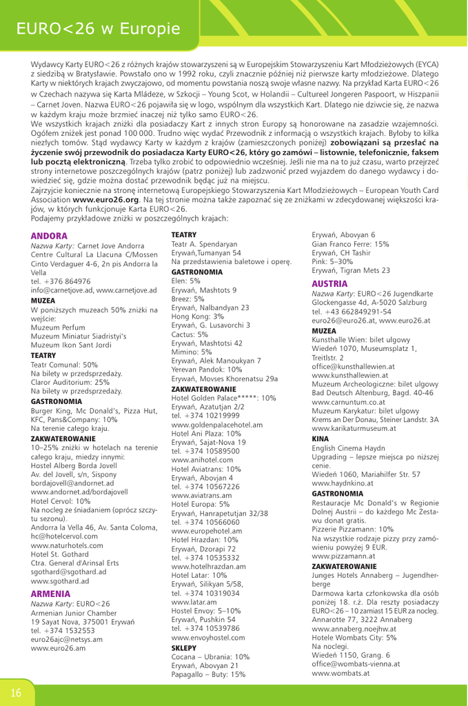 Wydawcy Karty EURO<26 z ró¿nych krajów stowarzyszeni s¹ w Europejskim Stowarzyszeniu Kart M³odzie¿owych (EYCA) z siedzib¹ w Bratys³awie. Powsta³o ono w 1992 roku, czyli znacznie póŸniej ni¿ pierwsze karty m³odzie¿owe. Dlatego Karty w niektórych krajach zwyczajowo, od momentu powstania nosz¹ swoje w³asne nazwy. Na przyk³ad Karta EURO<26 w Czechach nazywa siê Karta Mládeze, w Szkocji – Young Scot, w Holandii – Cultureel Jongeren Paspoort, w Hiszpanii – Carnet Joven. Nazwa EURO<26 pojawi³a siê w logo, wspólnym dla wszystkich Kart. Dlatego nie dziwcie siê, ¿e nazwa w ka¿dym kraju mo¿e brzmieæ inaczej ni¿ tylko samo EURO<26. We wszystkich krajach zni¿ki dla posiadaczy Kart z innych stron Europy s¹ honorowane na zasadzie wzajemnoœci. Ogó³em zni¿ek jest ponad 100 000. Trudno wiêc wydaæ Przewodnik z informacj¹ o wszystkich krajach. By³oby to kilka niez³ych tomów. St¹d wydawcy Karty w ka¿dym z krajów (zamieszczonych poni¿ej) zobowi¹zani s¹ przes³aæ na ¿yczenie swój przewodnik do posiadacza Karty EURO<26, który go zamówi – listownie, telefonicznie, faksem lub poczt¹ elektroniczn¹. Trzeba tylko zrobiæ to odpowiednio wczeœniej. Jeœli nie ma na to ju¿ czasu, warto przejrzeæ strony internetowe poszczególnych krajów (patrz poni¿ej) lub zadzwoniæ przed wyjazdem do danego wydawcy i dowiedzieæ siê, gdzie mo¿na dostaæ przewodnik bêd¹c ju¿ na miejscu. Zajrzyjcie koniecznie na stronê internetow¹ Europejskiego Stowarzyszenia Kart M³odzie¿owych – European Youth Card Association www.euro26.org. Na tej stronie mo¿na tak¿e zapoznaæ siê ze zni¿kami w zdecydowanej wiêkszoœci krajów, w których funkcjonuje Karta EURO<26. Podajemy przyk³adowe zni¿ki w poszczególnych krajach: ANDORA Nazwa Karty: Carnet Jove Andorra Centre Cultural La Llacuna C/Mossen Cinto Verdaguer 4-6, 2n pis Andorra la Vella tel. +376 864976 [email protected], www.carnetjove.ad MUZEA W poni¿szych muzeach 50% zni¿ki na wejœcie: Muzeum Perfum Muzeum Miniatur Siadristyi’s Muzeum Ikon Sant Jordi TEATRY Teatr Comunal: 50% Na bilety w przedsprzeda¿y. Claror Auditorium: 25% Na bilety w przedsprzeda¿y. GASTRONOMIA Burger King, Mc Donald’s, Pizza Hut, KFC, Pans&Company: 10% Na terenie ca³ego kraju. ZAKWATEROWANIE 10–25% zni¿ki w hotelach na terenie ca³ego kraju, miedzy innymi: Hostel Alberg Borda Jovell Av. del Jovell, s/n, Sispony [email protected] www.andornet.ad/bordajovell Hotel Cervol: 10% Na nocleg ze œniadaniem (oprócz szczytu sezonu). Andorra la Vella 46, Av. Santa Coloma, [email protected] www.naturhotels.com Hotel St. Gothard Ctra. General d'Arinsal Erts [email protected] www.sgothard.ad ARMENIA Nazwa Karty: EURO<26 Armenian Junior Chamber 19 Sayat Nova, 375001 Erywañ tel. +374 1532553 [email protected] www.euro26.am 16 TEATRY Teatr A. Spendaryan Erywañ,Tumanyan 54 Na przedstawienia baletowe i operê. GASTRONOMIA Elen: 5% Erywañ, Mashtots 9 Breez: 5% Erywañ, Nalbandyan 23 Hong Kong: 3% Erywañ, G. Lusavorchi 3 Cactus: 5% Erywañ, Mashtotsi 42 Mimino: 5% Erywañ, Alek Manoukyan 7 Yerevan Pandok: 10% Erywañ, Movses Khorenatsu 29a ZAKWATEROWANIE Hotel Golden Palace*****: 10% Erywañ, Azatutjan 2/2 tel. +374 10219999 www.goldenpalacehotel.am Hotel Ani Plaza: 10% Erywañ, Sajat-Nova 19 tel. +374 10589500 www.anihotel.com Hotel Aviatrans: 10% Erywañ, Abovjan 4 tel. +374 10567226 www.aviatrans.am Hotel Europa: 5% Erywañ, Hanrapetutjan 32/38 tel. +374 10566060 www.europehotel.am Hotel Hrazdan: 10% Erywañ, Dzorapi 72 tel. +374 10535332 www.hotelhrazdan.am Hotel Latar: 10% Erywañ, Silikyan 5/58, tel. +374 10319034 www.latar.am Hostel Envoy: 5–10% Erywañ, Pushkin 54 tel. +374 10539786 www.envoyhostel.com SKLEPY Cocana – Ubrania: 10% Erywañ, Abovyan 21 Papagallo – Buty: 15% Erywañ, Abovyan 6 Gian Franco Ferre: 15% Erywañ, CH Tashir Pink: 5–30% Erywañ, Tigran Mets 23 AUSTRIA Nazwa Karty: EURO<26 Jugendkarte Glockengasse 4d, A-5020 Salzburg tel. +43 662849291-54 [email protected], www.euro26.at MUZEA Kunsthalle Wien: bilet ulgowy Wiedeñ 1070, Museumsplatz 1, Treitlstr. 2 [email protected] www.kunsthallewien.at Muzeum Archeologiczne: bilet ulgowy Bad Deutsch Altenburg, Bagd. 40-46 www.carnuntum.co.at Muzeum Karykatur: bilet ulgowy Krems an Der Donau, Steiner Landstr. 3A www.karikaturmuseum.at KINA English Cinema Haydn Upgrading – lepsze miejsca po ni¿szej cenie. Wiedeñ 1060, Mariahilfer Str. 57 www.haydnkino.at GASTRONOMIA Restauracje Mc Donald’s w Regionie Dolnej Austrii – do ka¿dego Mc Zestawu donat gratis. Pizzerie Pizzamann: 10% Na wszystkie rodzaje pizzy przy zamówieniu powy¿ej 9 EUR. www.pizzamann.at ZAKWATEROWANIE Junges Hotels Annaberg – Jugendherberge Darmowa karta cz³onkowska dla osób poni¿ej 18. r.¿. Dla reszty posiadaczy EURO<26 – 10 zamiast 15 EUR za nocleg. Annarotte 77, 3222 Annaberg www.annaberg.noejhw.at Hotele Wombats City: 5% Na noclegi. Wiedeñ 1150, Grang. 6 [email protected] www.wombats.at SPORTY ZIMOWE Snowboard School Dachstein Tauern: 10% Na kursy narciarskie i wynajem sprzêtu. Schladming 8970, Ritter v. Gersdorff Str. 562 [email protected] www.blue-tomato.at Schi & Rennschule Hochficht: 10% Na kursy narciarskie i prywatne lekcje nauki jazdy na nartach. Puchenau 4048, Oleanderweg 4 Ski School Schruns: 10% Na kursy narciarskie i wynajem sprzêtu. Schruns 6780, Bahnhofstr. 1 Obertauern Snowboard School:10% Na kursy narciarskie i wynajem sprzêtu. Obertauern 5562, Schützpassage [email protected] www.blue-tomato.at Loferer Alm-Bahnen: 18% Na bilety 1- i 2-dniowe. 5090 Lofer 275 [email protected], www.ski-lofer.at Bergbahnen Dreilandereck Gesmbh & Co KG: 10% Seltschach, 9601 Arnoldstein [email protected] www.3laendereck.at Innsbrucker Nordkettenbahnen: 10% Innsbruck, Höhenstr. 145 [email protected], www.nordpark.com TRANSPORT Koleje Austriackie – wspólna karta z Öbb vorteilscard: do 50% www.oebb.at BELGIA – czêœæ flamandzka Nazwa Karty: Cultureel Jeugd Paspoort (CJP) Sainctelette