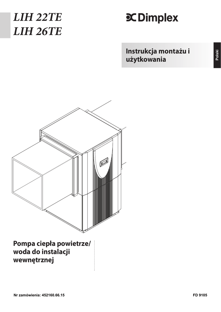 LIH 22TE LIH 26TE Polski Instrukcja montażu i użytkowania Pompa ciepła powietrze/ woda do instalacji wewnętrznej Nr zamówienia: 452160.66.15 FD 9105 Spis tresci Należy niezwłocznie zapoznać się z tekstem .......................................................................... PL-2 1.1 Ważne wskazówki ................................................................................................................................ PL-2 1.2 Użycie zgodne z przeznaczeniem ........................................................................................................ PL-2 1.3 Przepisy prawne i dyrektywy ................................................................................................................ PL-2 2 Cel zastosowania pompy ciepła ............................................................................................... PL-3 2.1 Zakres zastosowania ............................................................................................................................ PL-3 2.2 Sposób działania .................................................................................................................................. PL-3 3 Zakres dostawy .......................................................................................................................... PL-3 3.1 Urządzenie podstawowe....................................................................................................................... PL-3 3.2 Rozdzielnica (elektryczna).................................................................................................................... PL-3 3.3 Sterownik pompy ciepła........................................................................................................................ PL-3 4 Akcesoria .................................................................................................................................... PL-4 4.1 Zdalne sterowanie ................................................................................................................................ PL-4 4.2 System zarządzania budynkiem ........................................................................................................... PL-4 4.3 Licznik ilości ciepła WMZ...................................................................................................................... PL-4 5 Transport..................................................................................................................................... PL-4 6 Instalacja ..................................................................................................................................... PL-5 6.1 Informacje ogólne ................................................................................................................................. PL-5 6.2 Przewód kondensatu ............................................................................................................................ PL-5 6.3 Dźwięk .................................................................................................................................................. PL-5 7 Montaż ......................................................................................................................................... PL-5 7.1 7.2 7.3 7.4 7.5 8 Informacje ogólne ................................................................................................................................. PL-5 Dopływ powietrza.................................................................................................................................. PL-5 Przyłączenie od strony ogrzewania ...................................................................................................... PL-6 Czujnik temperatury.............................................................................................................................. PL-7 Przyłącze elektryczne ........................................................................................................................... PL-8 Rozruch ....................................................................................................................................... PL-9 8.1 Informacje ogólne ................................................................................................................................. PL-9 8.2 Przygotowanie ...................................................................................................................................... PL-9 8.3 Sposób postępowania .......................................................................................................................... PL-9 9 Czyszczenie / konserwacja........................................................................................................ PL-9 9.1 9.2 9.3 9.4 Konserwacja ......................................................................................................................................... PL-9 Czyszczenie od strony grzewczej......................................................................................................... PL-9 Czyszczenie od strony powietrza ....................................................................................................... PL-10 Konserwacja ....................................................................................................................................... PL-10 10 Usterki / wyszukiwanie błędów ............................................................................................... PL-10 11 Wyłączenie z eksploatacji / utylizacja .................................................................................... PL-10 Załącznik............................................................................................................................................... A-I www.dimplex.pl PL-1 Polski 1 1 1 Należy niezwłocznie zapoznać się z tekstem 1.1 Ważne ws