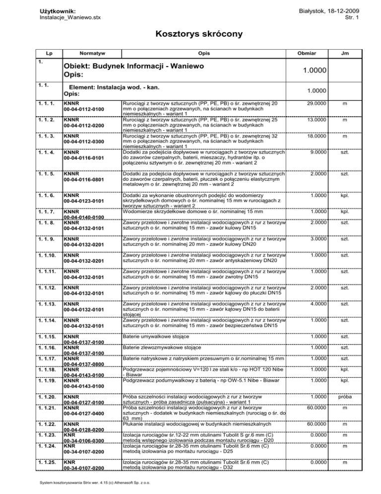 Białystok, 18-12-2009 UŜytkownik: Instalacje_Waniewo.stx Str. 1 Kosztorys skrócony Lp 1. 1. 1. Normatyw Opis Obiekt: Budynek Informacji - Waniewo Opis: Element: Instalacja wod. - kan. Opis: Obmiar Jm 1.0000 1.0000 Rurociągi z tworzyw sztucznych (PP, PE, PB) o śr. zewnętrznej 20 mm o połączeniach zgrzewanych, na ścianach w budynkach niemieszkalnych - wariant 1 Rurociągi z tworzyw sztucznych (PP, PE, PB) o śr. zewnętrznej 25 mm o połączeniach zgrzewanych, na ścianach w budynkach niemieszkalnych - wariant 1 Rurociągi z tworzyw sztucznych (PP, PE, PB) o śr. zewnętrznej 32 mm o połączeniach zgrzewanych, na ścianach w budynkach niemieszkalnych - wariant 1 Dodatki za podejścia dopływowe w rurociągach z tworzyw sztucznych do zaworów czerpalnych, baterii, mieszaczy, hydrantów itp. o połączeniu sztywnym o śr. zewnętrznej 20 mm - wariant 2 29.0000 m 13.0000 m 18.0000 m 9.0000 szt. KNNR 00-04-0116-0801 Dodatki za podejścia dopływowe w rurociągach z tworzyw sztucznych do zaworów czerpalnych, baterii, płuczek o połączeniu elastycznym metalowym o śr. zewnętrznej 20 mm - wariant 2 2.0000 szt. 1. 1. 6. KNNR 00-04-0123-0101 1.0000 kpl. 1. 1. 7. KNNR 00-04-0140-0100 KNNR 00-04-0132-0101 Dodatki za wykonanie obustronnych podejść do wodomierzy skrzydełkowych domowych o śr. nominalnej 15 mm w rurociągach z tworzyw sztucznych - wariant 2 Wodomierze skrzydełkowe domowe o śr. nominalnej 15 mm 1.0000 kpl. Zawory przelotowe i zwrotne instalacji wodociągowych z rur z tworzyw sztucznych o śr. nominalnej 15 mm - zawór kulowy DN15 2.0000 szt. 1. 1. 1. KNNR 00-04-0112-0100 1. 1. 2. KNNR 00-04-0112-0200 1. 1. 3. KNNR 00-04-0112-0300 1. 1. 4. KNNR 00-04-0116-0101 1. 1. 5. 1. 1. 8. 1. 1. 9. KNNR 00-04-0132-0201 Zawory przelotowe i zwrotne instalacji wodociągowych z rur z tworzyw sztucznych o śr. nominalnej 20 mm - zawór kulowy DN20 3.0000 szt. 1. 1.10. KNNR 00-04-0132-0201 Zawory przelotowe i zwrotne instalacji wodociągowych z rur z tworzyw sztucznych o śr. nominalnej 20 mm - zawór antyskaŜeniowy DN20 1.0000 szt. 1. 1.11. KNNR 00-04-0132-0101 Zawory przelotowe i zwrotne instalacji wodociągowych z rur z tworzyw sztucznych o śr. nominalnej 15 mm - zawór zwrotny DN15 1.0000 szt. 1. 1.12. KNNR 00-04-0132-0101 Zawory przelotowe i zwrotne instalacji wodociągowych z rur z tworzyw sztucznych o śr. nominalnej 15 mm - zawór kątowy do płuczki DN15 2.0000 szt. 1. 1.13. KNNR 00-04-0132-0101 4.0000 szt. 1. 1.14. KNNR 00-04-0132-0101 Zawory przelotowe i zwrotne instalacji wodociągowych z rur z tworzyw sztucznych o śr. nominalnej 15 mm - zawór kątowy DN15 do baterii stojącej Zawory przelotowe i zwrotne instalacji wodociągowych z rur z tworzyw sztucznych o śr. nominalnej 15 mm - zawór bezpieczeństwa DN15 1.0000 szt. 1. 1.15. KNNR 00-04-0137-0100 KNNR 00-04-0137-0100 KNNR 00-04-0137-0800 KNNR 00-04-0143-0100 KNNR 00-04-0143-0100 Baterie umywalkowe stojące 1.0000 szt. Baterie zlewozmywakowe stojące 1.0000 szt. Baterie natryskowe z natryskiem przesuwnym o śr.nominalnej 15 mm 1.0000 szt. Podgrzewacz pojemnościowy V=120 l ze stali k/o - np HOT 120 Nibe - Biawar Podgrzewacz podumywalkowy z baterią - np OW-5.1 Nibe - Biawar 1.0000 kpl. 1.0000 kpl. Próba szczelności instalacji wodociągowych z rur z tworzyw sztucznych - próba zasadnicza (pulsacyjna) - wariant 1 Próba szczelności instalacji wodociągowych z rur z tworzyw sztucznych - dodatek w budynkach niemieszkalnych (rurociąg o śr. do 63 mm) Płukanie instalacji wodociągowej w budynkach niemieszkalnych 1.0000 próba 1. 1.16. 1. 1.17. 1. 1.18. 1. 1.19. 1. 1.20. 1. 1.21. 1. 1.22. 1. 1.23. 1. 1.24. 1. 1.25. KNNR 00-04-0127-0100 KNNR 00-04-0127-0400 60.0000 m 60.0000 m KNNR 00-04-0128-0200 KNR 00-34-0106-0300 KNR 00-34-0107-0200 Izolacja rurociągów śr.12-22 mm otulinami Tubolit S gr.6 mm (C) metodą wstępnego izolowania podczas montaŜu rurociągu - D20 Izolacja rurociągów śr.28-35 mm otulinami Tubolit Sr.6 mm (C) metodą izolowania po montaŜu rurociągu - D25 0.0000 m 0.0000 m KNR 00-34-0107-0200 Izolacja rurociągów śr.28-35 mm otulinami Tubolit Sr.6 mm (C) metodą izolowania po montaŜu rurociągu - D32 0.0000 m System kosztorysowania Strix wer. 4.15 (c) Athenasoft Sp. z o.o. Białystok, 18-12-2009 UŜytkownik: Instalacje_Waniewo.stx Str. 2 Kosztorys skrócony Lp Normatyw Opis Obmiar Jm 1. 1.26. KNR 04-01-0106-0100 Wykopy nieumocnione o ścianach pionowych wykonywane wewnątrz budynku z odrzuceniem na odległość do 3 m dla instalacji kanalizacji 8.5000 m3 1. 1.27. KNR 04-01-0106-0300 KNNR 00-04-0203-0300 KNNR 00-04-0203-0400 KNNR 00-04-0208-0300 KNNR 00-04-0208-0200 KNNR 00-04-0208-0100 KNNR 00-04-0211-0100 KNNR 00-04-0211-0300 KNNR 00-04-0213-0500 KNNR 00-04-0213-0400 KNNR 00-04-0222-0100 KNNR 00-04-0222-0200 KNNR 00-04-0230-0200 KNNR 00-04-0230-0200 KNNR 00-04-0229-0400 KNNR 00-04-0233-0300 KNNR 00-04-0232-0202 KNNR 00-04-0233-0300 KNNR 03-03-0501-0000 ANALIZA WŁASNA Zasypanie wykopów ziemią z ukopów 8.5000 m3 Rurociągi z PVC kanalizacyjne o śr. 110 mm w gotowych wykopach, wewnątrz budynków o połączeniach wciskowych Rurociągi z PVC kanalizacyjne o śr. 160 mm w gotowych wykopach, wewnątrz budynków o połączeniach wciskowych Rurociągi kanalizacyjne z PVC o śr. 110 mm na ścianach w budynkach niemieszkalnych o połączeniach wciskowych Rurociągi kanalizacyjne z PVC o śr. 75 mm na ścianach w budynkach niemieszkalnych o połączeniach wciskowych Rurociągi kanalizacyjne z PVC o śr. 50 mm na ścianach w budynkach niemieszkalnych o połączeniach wciskowych Dodatki za wykonanie podejść odpływowych z PVC o śr. 50 mm o połączeniach wciskowych Dodatki za wykonanie podejść odpływowych z PVC o śr. 110 mm o połączeniach wciskowych Rury wywiewne z PVC o połączeniu wciskowym o śr. 110 mm 6.0000 m 7.0000 m 14.0000 m 7.0000 m 9.0000 m 4.0000 szt. 2.0000 szt. 1.0000 szt. Zawór napowietrzający D50 1.0000 szt. Czyszczaki z PVC kanalizacyjne o śr. 75 mm o połączeniach wciskowyc
