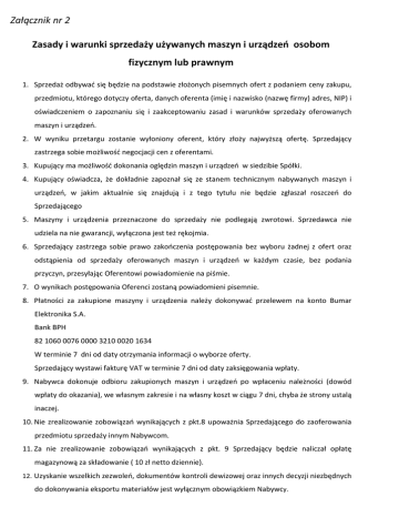 Załącznik nr 2 Zasady i warunki sprzedaży używanych maszyn i urządzeń osobom fizycznym lub prawnym 1. Sprzedaż odbywać się będzie na podstawie złożonych pisemnych ofert z podaniem ceny zakupu, przedmiotu, którego dotyczy oferta, danych oferenta (imię i nazwisko (nazwę firmy) adres, NIP) i oświadczeniem o zapoznaniu się i zaakceptowaniu zasad i warunków sprzedaży oferowanych maszyn i urządzeń. 2. W wyniku przetargu zostanie wyłoniony oferent, który złoży najwyższą ofertę. Sprzedający zastrzega sobie możliwość negocjacji cen z oferentami. 3. Kupujący ma możliwość dokonania oględzin maszyn i urządzeń w siedzibie Spółki. 4. Kupujący oświadcza, że dokładnie zapoznał się ze stanem technicznym nabywanych maszyn i urządzeń, w jakim aktualnie się znajdują i z tego tytułu nie będzie zgłaszał roszczeń do Sprzedającego 5. Maszyny i urządzenia przeznaczone do sprzedaży nie podlegają zwrotowi. Sprzedawca nie udziela na nie gwarancji, wyłączona jest też rękojmia. 6. Sprzedający zastrzega sobie prawo zakończenia postępowania bez wyboru żadnej z ofert oraz odstąpienia od sprzedaży oferowanych maszyn i urządzeń w każdym czasie, bez podania przyczyn, przesyłając Oferentowi powiadomienie na piśmie. 7. O wynikach postępowania Oferenci zostaną powiadomieni pisemnie. 8. Płatności za zakupione maszyny i urządzenia należy dokonywać przelewem na konto Bumar Elektronika S.A. Bank BPH 82 1060 0076 0000 3210 0020 1634 W terminie 7 dni od daty otrzymania informacji o wyborze oferty. Sprzedający wystawi fakturę VAT w terminie 7 dni od daty zaksięgowania wpłaty. 9. Nabywca dokonuje odbioru zakupionych maszyn i urządzeń po wpłaceniu należności (dowód wpłaty do okazania), we własnym zakresie i na własny koszt w ciągu 7 dni, chyba że strony ustalą inaczej. 10. Nie zrealizowanie zobowiązań wynikających z pkt.8 upoważnia Sprzedającego do zaoferowania przedmiotu sprzedaży innym Nabywcom. 11. Za nie zrealizowanie zobowiązań wynikających z pkt. 9 Sprzedający będzie naliczał opłatę magazynową za składowanie ( 10 zł netto dziennie). 12. Uzyskanie wszelkich zezwoleń, dokumentów kontroli dewizowej oraz innych decyzji niezbędnych do dokonywania eksportu materiałów jest wyłącznym obowiązkiem Nabywcy.