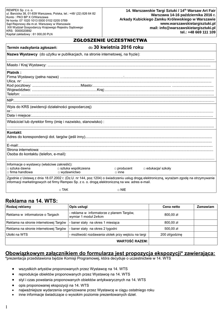 14. Warszawskie Targi Sztuki / 14th Warsaw Art Fair Warszawa 14-16 października 2016 r. Arkady Kubickiego Zamku Królewskiego w Warszawie www.warszawskietargisztuki.pl mail: [email protected] tel.: +48 669 111 109 REMPEX Sp. z o. o. ul. Barcicka 38, 01-839 Warszawa, Polska, tel.: +48/ (22) 826 64 82 Konto : PKO BP X O/Warszawa Nr konta: 07 1020 1013 0000 0102 0205 0789 Sąd Rejonowy dla m.st. Warszawy w Warszawie XIII Wydział Gospodarczy Krajowego Rejestru Sądowego KRS: 0000020892 Kapitał zakładowy : 61 000,00 PLN ZGŁOSZENIE UCZESTNICTWA do 30 Termin nadsyłania zgłoszeń: kwietnia 2016 roku Nazwa Wystawcy (do użytku w publikacjach, na stronie internetowej, na fryzie): ......................................................................................................................................................................................................... Miasto / Kraj Wystawcy: .............................................................................................................................................................. Płatnik : Firma Wystawcy (pełna nazwa) …..........................................................:....................................................................................... Ulica, nr: ....................................................................................................................................................................................... Kod pocztowy: ...............................................Miasto:............................................................................ ........................................ Województwo: ...............................................................Kraj:.......................................................................................................... Telefon: ........................................................................................................................................................................................... NIP:.................................................................................................................................................................................................. Wpis do KRS (ewidencji działalności gospodarczej) nr.:................................................................................................................................................................................................... Data i miejsce:................................................................................................................................................................................ Właściciel lub dyrektor firmy (imię i nazwisko, stanowisko) : …..................................................................................................................................................................................................... Kontakt: Adres do korespondencji dot. targów (jeśli inny)........................................................................................................................... …................................................................................................................................................................................................... E-mail:............................................................................................................................................................................................ Strona internetowa: ….................................................................................................................................................................... Osoba do kontaktu (telefon, e-mail): ......................................................................................................................................................................................................... Informacje o wystawcy (właściwe zakreślić): □ sztuka dawna □ sztuka współczesna □ firma handlowa □ wydawnictwo □ producent □ inne □ edukacja/ szkoły Zgodnie z Ustawą z dnia 18.07.2002 r. (Dz.U. nr 144, poz.1204) o świadczeniu usług drogą elektroniczną, wyrażam zgodę na otrzymywanie informacji marketingowych od firmy Rempex Sp. z o. o. drogą elektroniczną na ww. adres e-mail. □ TAK □ NIE Reklama na 14. WTS: Rodzaj reklamy Opis usługi Cena netto Reklama w informatorze o Targach - reklama w informatorze z planem Targów, wymiar 1 moduł 2x4cm 800,00 zł Reklama na stronie internetowej Targów - baner stały na okres 1 miesiąca 800,00 zł Reklama na stronie internetowej Targów - baner stały na okres 2 tygodni 500,00 zł Ulotki na WTS - możliwość rozdawania ulotek przy wejściu na targi Zamawiam 200 zł/godzinę WARTOŚĆ RAZEM: Obowiązkowym załącznikiem do formularza jest propozycja ekspozycji* zawierająca: *prezentacja przedstawiona będzie Komisji Programowej, która decyduje o uczestnictwie w 14. WTS 1 wszystkich artystów proponowanych przez Wystawcę na 14. WTS reprodukcje obiektów proponowanych przez Wystawcę na 14. WTS styl i czas powstania proponowanych obiektów antykwarycznych na 14. WTS opis proponowanej ekspozycji na 14. WTS najważniejsze wydarzenia organizowane przez Wystawcę w ciągu ostatniego roku inne informacje świadczące o wysokim poziomie prezentowanych dzieł. Zamawiam następującą powierzchnię: [Proszę zaznaczyć odpowiedni wiersz w tabeli („X” w polu zamawiam) zgodnie z proponowaną ekspozycją] WYDAWNICTWA, FIRMY HANDLOWE, EDUKACJA, INNE Rodzaj powierzchni Dostępna ilość stoisk Cena netto* 1,5x3 m - 4,5m2 2 1 700,00 zł 1,5x6 m - 9m2 1 3 500,00 zł 1,5x1,5 m – 2m2 6 (wnęki wzdłuż okien)*** 1 300,00 zł Zamawiam Uwagi SZTUKA WSPÓŁCZESNA 1,5x4 m - 6m2 2 2 500,00 zł 1,5x5 m - 7,5m2 10 3 000,00 zł 1,5x6 m - 9m2 12 3 500,00 zł 3x5 m - 15m2 4 4 500,00 zł 25m2 - Nisza 4 5 000,00 zł 10x3 m - 30m2 1 9 000,00 zł SZTUKA DAWNA 1,5x3 m - 4,5