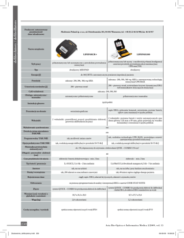 defibrylatory / defibrillators Producent / autoryzowany przedstawiciel/ dane teleadresowe Medtronic Poland sp. z o.o.; ul. Ostrobramska 101; 04-041 Warszawa; tel. +48 (0) 22 46 56 900, fax 46 56 917 Nazwa urządzenia LIFEPAKCR+ LIFEPAK1000 Tryb pracy półautomatyczny lub automatyczny z protokołem prowadzenia resuscytacji półautomatyczny lub ręczny z możliwością własnej konfiguracji ustawień protokołu prowadzenia akcji reanimacyjnej CPR max(TM) Typ dwufazowy AED/PAD dwufazowy Energia [J] do 360 J BTE z automatycznym pomiarem impedancji pacjenta Protokoły zalecany: 200, 300, 360, wg AHA zalecany: 200, 300, 360 wg AHA z zaawansowaną technologią resuscytacji CPR MAX Ustawienia nominalne [J] 200 – pierwszy strzał 200 – pierwszy strzał, wyświetlanie krzywej dynamicznej EKG lub komunikatów dotyczących resuscytacji Cykl wyładowań Obsługa: automatyczna / manualna zalecany: 200, 300, 360 automatyczna i półautomatyczna półautomatyczna i manualna język polski Instrukcje głosowe Prezentacja na ekranie ostrzeżenia graficzne zapis EKG, polecenia komend, ostrzeżenia, poziom baterii, upływ czasu reanimacji w języku polskim Wskaźniki 2 wskaźniki: prawidłowej pozycji przyklejenia elektrod, gotowości defibrylatora do pracy 2 wskaźniki: poziomu baterii i testów automatycznych oraz ekran główny 120 mm x 89 mm, gdzie pojawiają się wszelkie komunikaty i ostrzeżenia w języku polskim Wyładowanie synchroniczne nie Detekcja rytmu stymulatora TAK/NIE nie Programowalny TAK /NIE tak, możliwość zmian czasów tak, unikalna technologia CPR MAX, pozwalająca ustawić zaawansowany protokół resuscytacji Opcja pediatryczna TAK /NIE tak, z redukcją energii defibrylacji w protokole 50-75-86 J tak, z redukcją energii defibrylacji w protokole 50-75-86 J Minimalna powierzchnia elektrod [cm2] ok. 150, dopuszczony do używania z elektrodami QUIK – COMBO 150 cm2 Długość przewodów elektrod [cm] 60 Czas przydatności do użycia elektrody i bateria doładowywująca – min. 2 lata elektrody – min. 2 lata Typ baterii / gwarancja Li-SO2CL2 1,4 Ah – 2 lata zasilania Lit/MnO2 Lit/dwutlenek manganu 6,2 Ah – 5 lat zasilania Autotest tak, raz na tydzień tak, raz na dobę i przy każdym uruchomieniu Pamięć wewnętrzna tak, 200 zdarzeń ze znacznikami czasowymi tak, 40 minut zapisu ciągłego danego pacjenta. Rejestrowane dane ciągły zapis: EKG, zdarzeń krytycznych, zdarzeń i czynności, testów Odtwarzanie za pomocą oprogramowania do analizy i interpretacji EKG o nazwie CODE STAT SUITE Złącze system QUICK – COMBO do przyłączenia elektrod do defibrylacji system QUICK – COMBO do przyłączenia elektrod do defibrylacji i kabla EKG, do elektrod EKG standardowe na wcisk Wymiary [cm]: wysokość x głębokość x szerokość 10,7 x 24,1 x 20,3 8,7 x 27,7 x 23,4 Waga [kg] 2,0 z akcesoriami 3,2 z akcesoriami Cecha szczególna / wyróżnik spełnia normę odporności na pył i wodę IPX4 spełnia normę odporności na pył i wodę IP 55 250 Zestawienie_defibrylatory.indd 250 Acta Bio-Optica et Informatica Medica 3/2009, vol. 15 06-09-09 16:08:29 AED Plus Royal Philips Electronics/Philips Polska Sp. z o.o., Philips Healthcare Al. Jerozolimskie 195B, 02-222 Warszawa, tel. +48 (0) 22 57 10 512, www.philips.pl, e-mail: [email protected] AED Pro półautomatyczny półautomatyczny / manualny HeartStart FRx automatyczny dwufazowy dwufazowy maks. 200 150 typu SMART dorośli / dzieci AHA/ERC 2005 120, 150, 200 150 programowany: 1/3 20 s przerwy między wyładowaniami automatyczna, z manualnym wyzwoleniem impulsu defibrylacyjnego automatyczna, z manualnym wyzwoleniem impulsu defibrylacyjnego / manualna automatyczna zachowaj spokój, wezwij pomoc, udrożnij drogi oddechowe, sprawdź oddychanie, nie dotykaj pacjenta – analizowanie, naciśnij migający przycisk defibrylacji, rozpocznij reanimację, kontynuuj reanimację, przyciśnij mocniej, dobry ucisk język polski, prowadzenie operatora przez proces wykonywania resuscytacji zapis EKG, komunikaty tekstowe analogiczne jak komendy głosowe, graficzny wskaźnik głębokości ucisków klatki piersiowej nie dotyczy ekran LCD, wskaźnik testu gotowości do pracy stan baterii, stan gotowości urządzenia, stan analizy (wskaźnik „nie dotykać pacjenta”), przycisk informacyjny (dostępność dodatkowych informacji głosowych) nie nie nie tak tak tak tak tak 110 80 55 121,9 elektroda standardowa – 2 lata, elektroda resuscytacyjna – 5 lat 2 lata litowa (5 lat czuwania), kwasowo-ołowiowa (18 miesięcy) litowa LR 123 (5 lat czuwania) jednorazowa litowo-manganowa – 5 lat, 200 wyładowań tak tak, codzienny tak tak zapis EKG, częstość akcji serca, liczba defibrylacji, częstość i głębokość uciśnięć klatki piersiowej podczas RKO, upływ czasu zapis EKG, całe zdarzenia, decyzje analityczne w komputerze PC z oprogramowaniem ZOLL Rescue Net Code Review – Stadard Edition komputer/laptop, PDA ze złączem IrDA i zainstalowanym odpowiednim oprogramowaniem IrDA IrDA, USB IrDA 13.3 x 24.l x 29.2 7,6 x 23,5 x 23,9 18 x 22 x 6 3,1 2,9 (z elektrodą i baterią litową) 1,5 (z baterią), 1,2 (bez baterii) piktogramynaobudowieorazsystemkomunikatówgłosowych i tekstowych prowadzący ratownika przez uniwersalny protokół Podstawowych Zabiegów Resuscytacyjnych (BLS+AED), monitorowanie i kontrola prawidłowości masażu klatki piersiowej, klasa IP55, najwyższe oceny w testach Emergency Care Research Institute, złoty medal w konkursie Product Design and Developement 2003 system komunikatów głosowych i tekstowych prowadzący ratownika przez uniwersalny protokół Podstawowych Zabiegów Resuscytacyjnych (BLS+AED), montorowanie i kontrola prawidłowości masażu klatki piersiowej (wbudowany metronom częstości ucisków i czujnik głębokości ucisków), filtr See-Thru CPR, klasa IP55 wsparcie resuscytacji, funkcja treningowa, klucz pediatryczny, odporność wg normy IP55, możliwość przełączenia elektrod do defibrylatorów AL
