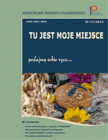 ISSN-2081-3864 P O W I AT Nr 17/2013 TU JEST MOJE MIEJSCE W numerze: ! " 2 POWIAT # Wiele materiałów o ciekawych wydarzeniach i postaciach otrzymaliśmy z gmin. Jak zwykle dużo uwagi poświęcamy edukacji i sprawom społecznym. Znajdziecie Państwo wiele informacji o osiągnięciach uczniów, działalności szkół i placówek oraz o wymianie młodzieży. Cieszymy się z materiałów nadesłanych przez młodzież. W dziale Forum młodych przeczytacie Państwo, m.in. o pielgrzymce maturzystów oraz ciekawych pomysłach uczniów „Czartorycha”. Życzymy miłej lektury! Teresa Kot, Redaktor Naczelna Roman Kochanowski „Jesienią”, 1910 r. $% Jesień Szumiał las, śpiewał las, gubił złote liście, świeciło się jasne słonko chłodno a złociście... Rano mgła w pole szła, wiatr ją rwał i ziębił; opadały ciężkie grona kalin i jarzębin... Każdy zmierzch moczył deszcz, płakał, drżał na szybkach... i tak ładnie mówił tatuś: jesień gra na skrzypkach... Józef Czechowicz Szanowni Czytelnicy, Tak przecież niedawno, pod platanem obok Młodzieżowego Domu Kultury, w pełnym słońcu upalnego lata rozbrzmiewały strofy Fredry…, a tu już jesień! Krótkie dni i coraz dłuższe wieczory. Więcej czasu na lekturę i wspomnienia letnich wydarzeń. Dlatego w kąciku dla dzieci nie zapominamy o Fredrze, w roku poświęconym jego twórczości. Minionego lata w naszym powiecie miało miejsce wiele wydarzeń i imprez. Doroczne widowisko obrzędowe – dożynki – zgromadziło wielu uczestników. Piękna pogoda i atmosfera oraz coraz ciekawsze pomysły na wystrój stoisk poszczególnych gmin uczyniły święto plonów niezwykle atrakcyjnym i barwnym. Relację i wiele zdjęć znajdziecie Państwo w naszym czasopiśmie. Bardzo ważnym wydarzeniem było rozpoczęcie roku szkolnego w Specjalnym Ośrodku Szkolno-Wychowawczym w Puławach z udziałem Prezydentowej Anny Komorowskiej. Pani Prezydentowa z niezwykłym zainteresowaniem obejrzała przedstawienie przygotowane przez uczniów i przekazała życzenia dzieciom, rodzicom i nauczycielom. Po części artystycznej wraz ze Starostą Puławskim Witoldem Popiołkiem dokonała otwarcia przedszkola dla dzieci niepełnosprawnych. Podkreśliła, że praca i zaangażowanie społeczności Ośrodka zaowocowało nominacją do nagrody Pary Prezydenckiej w konkursie „Dobry Klimat dla Rodziny”. Wstęp Temat wydania Aktualności Z gmin Kultura Historia i tradycja regionu Edukacja Sprawy społeczne Okiem specjalisty Znani i nieznani Forum młodych Kwartalnik dzieciom Sport i turystyka 2 3 4 11 20 23 27 35 40 42 44 49 53 W Kwartalniku opublikowano fotografie przekazane przez autorów tekstów Wydawca: Powiatowa Biblioteka Publiczna w Puławach ul. 6 Sierpnia 5, 24-100 Puławy, tel. 81 886 14 74 [email protected] www.pulawy.powiat.pl Redakcja: Teresa Kot, Danuta Szlendak, Agata Majcher (AM), Andrzej Wenerski Projekt kwartalnika, redakcja i przygotowanie do druku: Grażyna Hołubowicz-Kliza Redakcja nie zwraca materiałów niezamówionych i zastrzega sobie prawo zmiany tytułów, skracania, adiustacji i korekty redakcyjnej tekstów. " & POWIAT 3 Temat wydania '&"&()*+,()*. Tegoroczna inauguracja roku szkolnego w Specjalnym Ośrodku Szkolno-Wychowawczym w Puławach miała niezwykły charakter. Stało się to za sprawą niecodziennych gości – małżonki Prezydenta Rzeczpospolitej Polskiej Anny Komorowskiej, a także towarzyszących jej osób, m.in. Podsekretarz Stanu w Kancelarii Prezydenta Ireny Wóycickiej oraz władz powiatu puławskiego i miasta. Inauguracja odbyła się 2 września 2013 r. Wydarzenie to było ściśle związane z niedawnym wyróżnieniem ośrodka i powiatu w konkursie Pary Prezydenckiej „Dobry Klimat dla Rodziny”. Kontynuacją tych działań było otwarcie przez Annę Komorowską oddziałów przedszkolnych dla dzieci ze sprzężoną niepełnosprawnością z terenu powiatu puławskiego. Od chwili otwarcia do przedszkola będzie uczęszczało dziewięcioro dzieci. Stworzone warunki docelowo umożliwiają objęcie specjalistyczną edukacją 12 dzieci. Otwarcie przedszkola było możliwe dzięki porozumieniu zawartemu pomiędzy Powiatem Puławskim a Gminą Miasto Puławy. „Dobry klimat” nie rozpoczął się w placówce wraz z ogłoszeniem konkursu, ani nie przeminął wraz z nim. Osoby uczestniczące w inauguracji roku szkolnego miały okazję poczuć atmosferę tego miejsca. Mówiono o dzieciach, ale one też miały okazję powiedzieć coś o sobie. Nie słowami, bo to nie one wyrażają najwięcej; mówiły gestami i emocjami. Poprzez program artystyczny, śpiew i taniec. Szczerze i spontanicznie. Zaprosiły też Panią Prezydentową do wspólnej zabawy, a tekst śpiewanej piosenki „podajmy sobie ręce” nabrał tym samym symbolicznego znaczenia. Niezwykły był kontakt Anny Komorowskiej z wychowankami naszego ośrodka. Bez dystansu i obaw. Z wielką otwartością, wrażliwością i naturalnością. Obdarowywała i była obdarowywana – uśmiechem, zaufaniem, serdecznością. Padło też wiele serdecznych słów ze strony Pani Prezydentowej pod adresem władz samorządowych, dyrekcji, pedagogów. Anna Komorowska życzyła uczniom kolejnego udanego roku szkolnego. Doskonałym podsumowaniem tego dnia, które wyraziło emocje zarówno gości, jak i gospodarzy, były przekazujące nadzieję słowa prowadzącej uroczystość Agaty Majcher, że „wszyscy wyjdziemy stąd lepsi”. Choć wydarzenie miało charakter oficjalny, zostało utrzymane w kameralnej atmosferze. Po wystąpieniach Pierwszej Damy Anny Komorowskiej, Starosty Puław- Honorowy gość inauguracji A. Komorowska z W. Popiołkiem, E. Wójcik i przedstawicielami społeczności SOSW skiego Witolda Popiołka oraz dyrektora SOSW Andrzeja Czarneckiego wychowankowie wraz ze swoimi opiekunami zaprezentowali program artystyczny przygotowany specjalnie na okoliczność spotkania z Panią Prezydentową. Anna Komorowska obejrzała Ośrodek i zatrzymała się n