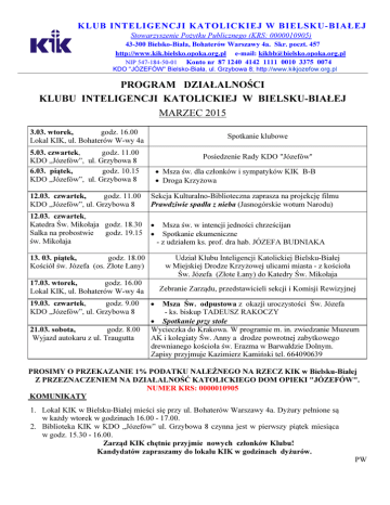 KLUB INTELIGENCJI KATOLICKIEJ W BIELSKU-BIAŁEJ Stowarzyszenie Pożytku Publicznego (KRS: 0000010905) 43-300 Bielsko-Biała, Bohaterów Warszawy 4a. Skr. poczt. 457 http://www.kik.bielsko.opoka.org.pl e-mail: [email protected] NIP 547-184-50-01 Konto nr 87 1240 4142 1111 0010 3375 0074 KDO "JÓZEFÓW" Bielsko-Biała, ul. Grzybowa 8; http://www.kikjozefow.org.pl PROGRAM DZIAŁALNOŚCI KLUBU INTELIGENCJI KATOLICKIEJ W BIELSKU-BIAŁEJ MARZEC 2015 3.03. wtorek, godz. 16.00 Lokal KIK, ul. Bohaterów W-wy 4a Spotkanie klubowe 5.03. czwartek, godz. 11.00 KDO „Józefów”, ul. Grzybowa 8 6.03. piątek, godz. 10.15 KDO „Józefów”, ul. Grzybowa 8 Posiedzenie Rady KDO "Józefów" • Msza św. dla członków i sympatyków KIK B-B • Droga Krzyżowa 12.03. czwartek, godz. 11.00 KDO „Józefów”, ul. Grzybowa 8 Sekcja Kulturalno-Biblioteczna zaprasza na projekcję filmu Prawdziwie spadła z nieba (Jasnogórskie wotum Narodu) 12.03. czwartek, Katedra Św. Mikołaja godz. 18.30 Salka na probostwie godz. 19.15 św. Mikołaja • • 13. 03. piątek, godz. 18.00 Kościół św. Józefa (os. Złote Łany) Udział Klubu Inteligencji Katolickiej Bielsku-Białej w Miejskiej Drodze Krzyżowej ulicami miasta - z kościoła Św. Józefa (Złote Łany) do Katedry Św. Mikołaja 17.03. wtorek, godz. 16.00 Lokal KIK, ul. Bohaterów W-wy 4a 19.03. czwartek, godz. 9.00 KDO „Józefów”, ul. Grzybowa 8 21.03. sobota, godz. 8.00 Wyjazd autokaru z ul. Traugutta Msza św. w intencji jedności chrześcijan Spotkanie ekumeniczne - z udziałem ks. prof. dra hab. JÓZEFA BUDNIAKA Zebranie Zarządu, przedstawicieli sekcji i Komisji Rewizyjnej Msza Św. odpustowa z okazji uroczystości Św. Józefa - ks. biskup TADEUSZ RAKOCZY • Spotkanie przy stole Wycieczka do Krakowa. W programie m. in. zwiedzanie Muzeum AK i kolegiaty Św. Anny a drodze powrotnej zabytkowego drewnianego kościoła św. Erazma w Barwałdzie Dolnym. Zapisy przyjmuje Kazimierz Kamiński tel. 664090639 • PROSIMY O PRZEKAZANIE 1% PODATKU NALEŻNEGO NA RZECZ KIK w Bielsku-Białej Z PRZEZNACZENIEM NA DZIAŁALNOŚĆ KATOLICKIEGO DOM OPIEKI "JÓZEFÓW". NUMER KRS: 0000010905 KOMUNIKATY 1. Lokal KIK w Bielsku-Białej mieści się przy ul. Bohaterów Warszawy 4a. Dyżury pełnione są w każdy wtorek w godzinach 16.00 - 17.00. 2. Biblioteka KIK w KDO „Józefów” ul. Grzybowa 8 czynna jest w pierwszy piątek miesiąca w godz. 15.30 - 16.00. Zarząd KIK chętnie przyjmie nowych członków Klubu! Kandydatów zapraszamy do lokalu KIK w godzinach dyżurów. PW
