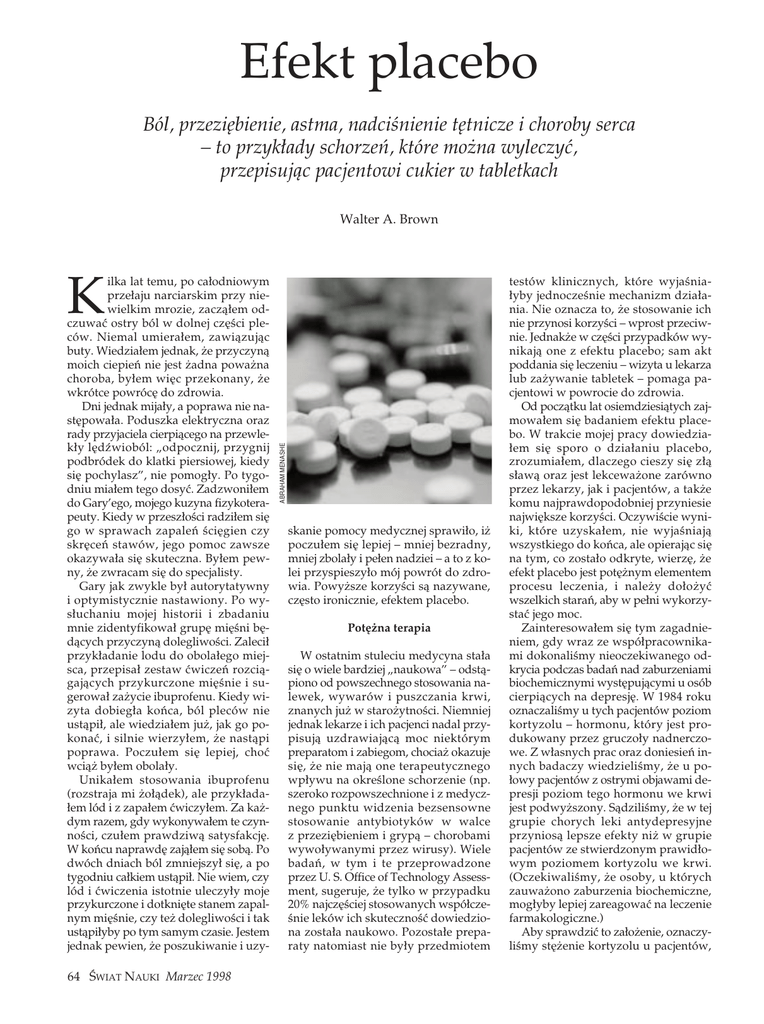 Efekt placebo Ból, przezi´bienie, astma, nadciÊnienie t´tnicze i choroby serca – to przyk∏ady schorzeƒ, które mo˝na wyleczyç, przepisujàc pacjentowi cukier w tabletkach Walter A. Brown 64 ÂWIAT NAUKI Marzec 1998 ABRAHAM MENASHE K ilka lat temu, po ca∏odniowym prze∏aju narciarskim przy niewielkim mrozie, zaczà∏em odczuwaç ostry ból w dolnej cz´Êci pleców. Niemal umiera∏em, zawiàzujàc buty. Wiedzia∏em jednak, ˝e przyczynà moich ciepieƒ nie jest ˝adna powa˝na choroba, by∏em wi´c przekonany, ˝e wkrótce powróc´ do zdrowia. Dni jednak mija∏y, a poprawa nie nast´powa∏a. Poduszka elektryczna oraz rady przyjaciela cierpiàcego na przewlek∏y l´dêwioból: „odpocznij, przygnij podbródek do klatki piersiowej, kiedy si´ pochylasz”, nie pomog∏y. Po tygodniu mia∏em tego dosyç. Zadzwoni∏em do Gary’ego, mojego kuzyna fizykoterapeuty. Kiedy w przesz∏oÊci radzi∏em si´ go w sprawach zapaleƒ Êci´gien czy skr´ceƒ stawów, jego pomoc zawsze okazywa∏a si´ skuteczna. By∏em pewny, ˝e zwracam si´ do specjalisty. Gary jak zwykle by∏ autorytatywny i optymistycznie nastawiony. Po wys∏uchaniu mojej historii i zbadaniu mnie zidentyfikowa∏ grup´ mi´Êni b´dàcych przyczynà dolegliwoÊci. Zaleci∏ przyk∏adanie lodu do obola∏ego miejsca, przepisa∏ zestaw çwiczeƒ rozciàgajàcych przykurczone mi´Ênie i sugerowa∏ za˝ycie ibuprofenu. Kiedy wizyta dobieg∏a koƒca, ból pleców nie ustàpi∏, ale wiedzia∏em ju˝, jak go pokonaç, i silnie wierzy∏em, ˝e nastàpi poprawa. Poczu∏em si´ lepiej, choç wcià˝ by∏em obola∏y. Unika∏em stosowania ibuprofenu (rozstraja mi ˝o∏àdek), ale przyk∏ada∏em lód i z zapa∏em çwiczy∏em. Za ka˝dym razem, gdy wykonywa∏em te czynnoÊci, czu∏em prawdziwà satysfakcj´. W koƒcu naprawd´ zajà∏em si´ sobà. Po dwóch dniach ból zmniejszy∏ si´, a po tygodniu ca∏kiem ustàpi∏. Nie wiem, czy lód i çwiczenia istotnie uleczy∏y moje przykurczone i dotkni´te stanem zapalnym mi´Ênie, czy te˝ dolegliwoÊci i tak ustàpi∏yby po tym samym czasie. Jestem jednak pewien, ˝e poszukiwanie i uzy- skanie pomocy medycznej sprawi∏o, i˝ poczu∏em si´ lepiej – mniej bezradny, mniej zbola∏y i pe∏en nadziei – a to z kolei przyspieszy∏o mój powrót do zdrowia. Powy˝sze korzyÊci sà nazywane, cz´sto ironicznie, efektem placebo. Pot´˝na terapia W ostatnim stuleciu medycyna sta∏a si´ o wiele bardziej „naukowa” – odstàpiono od powszechnego stosowania nalewek, wywarów i puszczania krwi, znanych ju˝ w staro˝ytnoÊci. Niemniej jednak lekarze i ich pacjenci nadal przypisujà uzdrawiajàcà moc niektórym preparatom i zabiegom, chocia˝ okazuje si´, ˝e nie majà one terapeutycznego wp∏ywu na okreÊlone schorzenie (np. szeroko rozpowszechnione i z medycznego punktu widzenia bezsensowne stosowanie antybiotyków w walce z przezi´bieniem i grypà – chorobami wywo∏ywanymi przez wirusy). Wiele badaƒ, w tym i te przeprowadzone przez U. S. Office of Technology Assessment, sugeruje, ˝e tylko w przypadku 20% najcz´Êciej stosowanych wspó∏czeÊnie leków ich skutecznoÊç dowiedziona zosta∏a naukowo. Pozosta∏e preparaty natomiast nie by∏y przedmiotem testów klinicznych, które wyjaÊnia∏yby jednoczeÊnie mechanizm dzia∏ania. Nie oznacza to, ˝e stosowanie ich nie przynosi korzyÊci – wprost przeciwnie. Jednak˝e w cz´Êci przypadków wynikajà one z efektu placebo; sam akt poddania si´ leczeniu – wizyta u lekarza lub za˝ywanie tabletek – pomaga pacjentowi w powrocie do zdrowia. Od poczàtku lat osiemdziesiàtych zajmowa∏em si´ badaniem efektu placebo. W trakcie mojej pracy dowiedzia∏em si´ sporo o dzia∏aniu placebo, zrozumia∏em, dlaczego cieszy si´ z∏à s∏awà oraz jest lekcewa˝one zarówno przez lekarzy, jak i pacjentów, a tak˝e komu najprawdopodobniej przyniesie najwi´ksze korzyÊci. OczywiÊcie wyniki, które uzyska∏em, nie wyjaÊniajà wszystkiego do koƒca, ale opierajàc si´ na tym, co zosta∏o odkryte, wierz´, ˝e efekt placebo jest pot´˝nym elementem procesu leczenia, i nale˝y do∏o˝yç wszelkich staraƒ, aby w pe∏ni wykorzystaç jego moc. Zainteresowa∏em si´ tym zagadnieniem, gdy wraz ze wspó∏pracownikami dokonaliÊmy nieoczekiwanego odkrycia podczas badaƒ nad zaburzeniami biochemicznymi wyst´pujàcymi u osób cierpiàcych na depresj´. W 1984 roku oznaczaliÊmy u tych pacjentów poziom kortyzolu – hormonu, który jest produkowany przez gruczo∏y nadnerczowe. Z w∏asnych prac oraz doniesieƒ innych badaczy wiedzieliÊmy, ˝e u po∏owy pacjentów z ostrymi objawami depresji poziom tego hormonu we krwi jest podwy˝szony. SàdziliÊmy, ˝e w tej grupie chorych leki antydepresyjne przyniosà lepsze efekty ni˝ w grupie pacjentów ze stwierdzonym prawid∏owym poziomem kortyzolu we krwi. (OczekiwaliÊmy, ˝e osoby, u których zauwa˝ono zaburzenia biochemiczne, mog∏yby lepiej zareagowaç na leczenie farmakologiczne.) Aby sprawdziç to za∏o˝enie, oznaczyliÊmy st´˝enie kortyzolu u pacjentów, placebo, by∏y one zaskakujàce. Zwykle 30–40% pacjentów majàcych objawy depresji odczuwa popraw´ po przyj´ciu placebo. Jednak w tym badaniu blisko po∏owa spoÊród 22 pacjentów, u których stwierdzono normalny poziom kortyzolu, czu∏a si´ lepiej w wyniku otrzymania placebo. Z kolei spoÊród dziewi´ciu chorych z podwy˝szonym poziomem tego hormonu ˝aden nie odczu∏ poprawy. Powy˝sze dane, potwierdzone zarówno w naszym laboratorium, jak i przez innych naukowców, wskazujà, ˝e pacjenci chorzy na depresj´, którzy reagowali na leczenie placebo, mieli ró˝ne wyniki testów biochemicznych od tych, którzy nie odczuli takiej poprawy. Ciekawi∏o mnie, czy ró˝nili si´ równie˝ pod innymi wzgl´dami. Okaza∏o si´, ˝e tak. Osoby z ostrymi objawami depresji trwajàcymi krócej ni˝ trzy miesiàce prawdopodobnie odniosà najwi´k- sze korzyÊci z leczenia