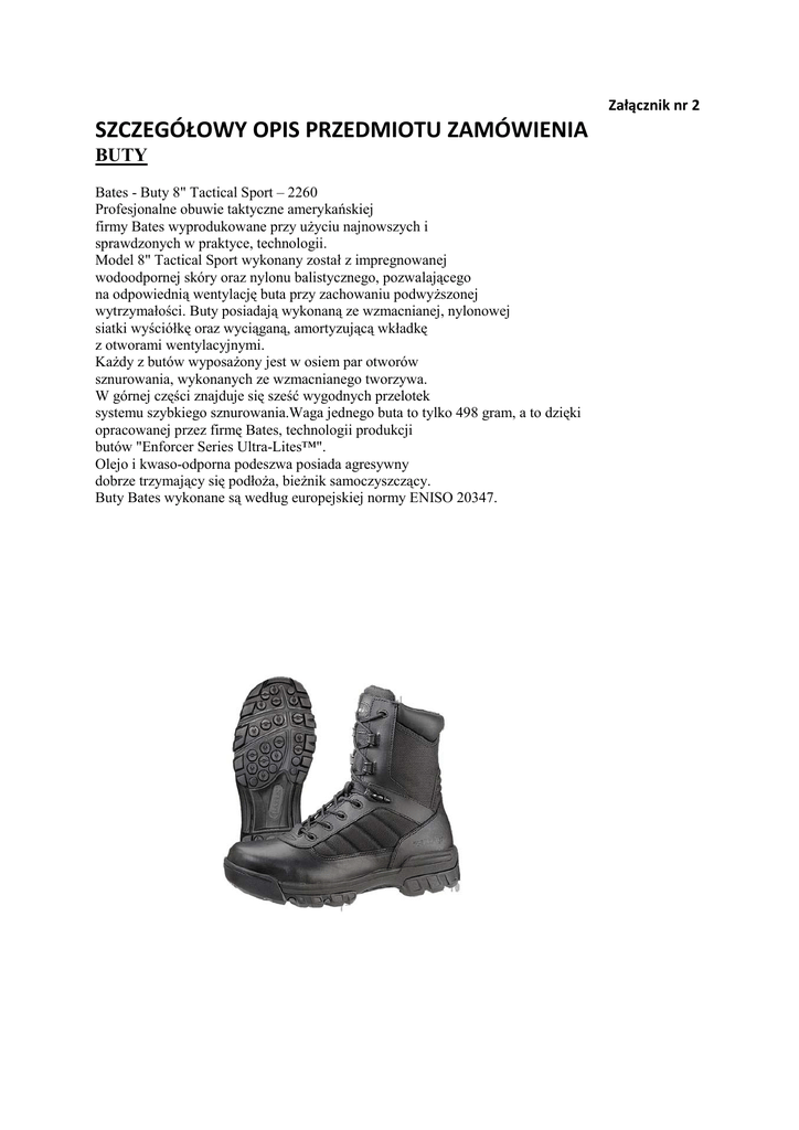 Załącznik nr 2 SZCZEGÓŁOWY OPIS PRZEDMIOTU ZAMÓWIENIA BUTY Bates - Buty 8" Tactical Sport – 2260 Profesjonalne obuwie taktyczne amerykańskiej firmy Bates wyprodukowane przy użyciu najnowszych i sprawdzonych w praktyce, technologii. Model 8" Tactical Sport wykonany został z impregnowanej wodoodpornej skóry oraz nylonu balistycznego, pozwalającego na odpowiednią wentylację buta przy zachowaniu podwyższonej wytrzymałości. Buty posiadają wykonaną ze wzmacnianej, nylonowej siatki wyściółkę oraz wyciąganą, amortyzującą wkładkę z otworami wentylacyjnymi. Każdy z butów wyposażony jest w osiem par otworów sznurowania, wykonanych ze wzmacnianego tworzywa. W górnej części znajduje się sześć wygodnych przelotek systemu szybkiego sznurowania.Waga jednego buta to tylko 498 gram, a to dzięki opracowanej przez firmę Bates, technologii produkcji butów "Enforcer Series Ultra-Lites™". Olejo i kwaso-odporna podeszwa posiada agresywny dobrze trzymający się podłoża, bieżnik samoczyszczący. Buty Bates wykonane są według europejskiej normy ENISO 20347. KURTKI Helikon - Kurtka Cougar® Jacket - Czarny - KU-CGR-SM-01 Przeznaczona dla służb mundurowych oraz agencji ochrony lekka kurtka Cougar® z serii Urban Tactical Line®. Ta dostosowana do użytku w warunkach miejskich kurta wykonana jest z tkaniny 4-way elastic Shark Skin z membraną Windblocker oraz ochronną warstwą Teflonu®. Wykorzystany materiał chroni użytkownika przed wiatrem oraz lekkim deszczem. Agresywny, anatomiczny krój współpracuje z ruchem taktycznym. Ukryty w kołnierzu kaptur może być łatwo dopasowany przez ściągacze ukryte w kieszeniach piersiowych. Konstrukcja Cougar® zawiera trzy panele identyfikacyjne, które zależnie od sytuacji mogą być odsłonięte lub pozostać ukryte. Do kurtki dołączone są dwa puste panele, przez co użytkownik ma możliwość personalizacji poprzez wyszycie lub nadruk odpowiedniej nazwy. Kurtka jest wyposażona w system Quick Side Access™ gwarantujący szybki, nieskrępowany dostęp do broni oraz akcesoriów taktycznych zamontowanych przy pasie. Dzięki ergonomicznym rozwiązaniom zastosowanych w QSA™ użytkownik jednym płynnym ruchem ma możliwość sięgnięcia po broń, paralizator, czy inne akcesoria, co znacząco wpływa na czas reakcji w warunkach zagrożenia. Cywilny wygląd i odpowiednie ułożenie systemu QSA™ sprawdza się w działaniach służb w warunkach miejskich. Cechy: - Wysoka wytrzymałość - Oddychalność: 8000g/m2/24h - Zapinana na dwukierunkowy zamek błyskawiczny YKK® z osłoną podbródka - Regulowany kaptur chowany w kołnierzu - Suwaki wentylacyjne pod pachami - Dwa ukryte panele identyfikacyjne do personalizacji (Przód: 12 x 7,5 cm NAPIS : CBŚP, Tył: 26 x 10 cm NAPIS POLICJA) - Ukryty panel na legitymację - Kieszenie na ramionach z przepustami na okablowanie - Kieszeń wewnętrzna - Tylna kieszeń przepustowa - Boczne kieszenie piersiowe z przepustami na okablowanie, D-Ringami i przegródkami na urządzenia elektroniczne - Kieszeń na lewym przedramieniu - System Quick Side Access™ - Wzmocnione, profilowane łokcie - Regulowane mankiety - Elastyczna regulacja dołu kurtki - Klamry WooJin® - Zamki YKK® Materiał główny: 4-way elastic Shark Skin (100% poliester) Pokrycie DuPont™ Teflon® Membrana Helikon-Tex® Windblocker Kolor: czarny EUROPEAN PATENT No. 002184036-0001 Zdjęcie przedstawia przykładową opcję samodzielnej konfiguracji kurtki (nadruk na panelu przednim powinien zawierać napis CBŚP na panelu tylnym napis POLICJA )