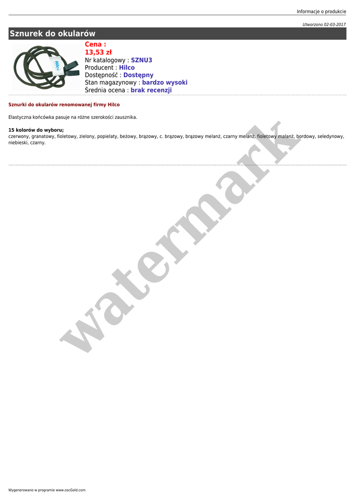 Informacje o produkcie Utworzono 02-03-2017 Sznurek do okularów Cena : 13,53 zł Nr katalogowy : SZNU3 Producent : Hilco Dostępność : Dostępny Stan magazynowy : bardzo wysoki Średnia ocena : brak recenzji Sznurki do okularów renomowanej firmy Hilco Elastyczna końcówka pasuje na różne szerokości zausznika. w at er m ar k 15 kolorów do wyboru; czerwony, granatowy, fioletowy, zielony, popielaty, beżowy, brązowy, c. brązowy, brązowy melanż, czarny melanż, fioletowy malanż, bordowy, seledynowy, niebieski, czarny. Wygenerowano w programie www.oscGold.com