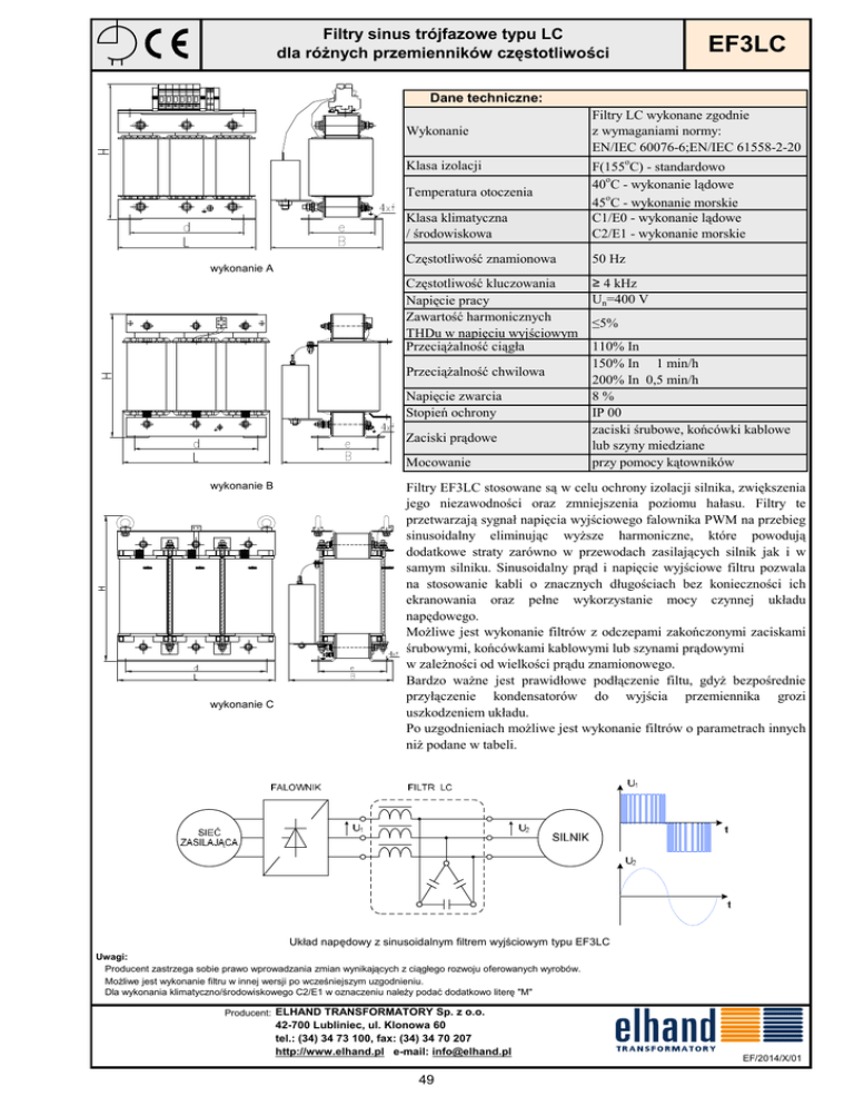 Filtry sinus trójfazowe typu LC dla różnych przemienników częstotliwości EF3LC Dane techniczne: Wykonanie Klasa klimatyczna / środowiskowa F(155oC) - standardowo o 40 C - wykonanie lądowe o 45 C - wykonanie morskie C1/E0 - wykonanie lądowe C2/E1 - wykonanie morskie Częstotliwość znamionowa 50 Hz Częstotliwość kluczowania Napięcie pracy Zawartość harmonicznych THDu w napięciu wyjściowym Przeciążalność ciągła ≥ 4 kHz Un=400 V Klasa izolacji Temperatura otoczenia wykonanie A Przeciążalność chwilowa Napięcie zwarcia Stopień ochrony Zaciski prądowe Mocowanie wykonanie B wykonanie C Filtry LC wykonane zgodnie z wymaganiami normy: EN/IEC 60076-6;EN/IEC 61558-2-20 ≤5% 110% In 150% In 1 min/h 200% In 0,5 min/h 8% IP 00 zaciski śrubowe, końcówki kablowe lub szyny miedziane przy pomocy kątowników Filtry EF3LC stosowane są w celu ochrony izolacji silnika, zwiększenia jego niezawodności oraz zmniejszenia poziomu hałasu. Filtry te przetwarzają sygnał napięcia wyjściowego falownika PWM na przebieg sinusoidalny eliminując wyższe harmoniczne, które powodują dodatkowe straty zarówno w przewodach zasilających silnik jak i w samym silniku. Sinusoidalny prąd i napięcie wyjściowe filtru pozwala na stosowanie kabli o znacznych długościach bez konieczności ich ekranowania oraz pełne wykorzystanie mocy czynnej układu napędowego. Możliwe jest wykonanie filtrów z odczepami zakończonymi zaciskami śrubowymi, końcówkami kablowymi lub szynami prądowymi w zależności od wielkości prądu znamionowego. Bardzo ważne jest prawidłowe podłączenie filtu, gdyż bezpośrednie przyłączenie kondensatorów do wyjścia przemiennika grozi uszkodzeniem układu. Po uzgodnieniach możliwe jest wykonanie filtrów o parametrach innych niż podane w tabeli. Układ napędowy z sinusoidalnym filtrem wyjściowym typu EF3LC Uwagi: Producent zastrzega sobie prawo wprowadzania zmian wynikających z ciągłego rozwoju oferowanych wyrobów. Możliwe jest wykonanie filtru w innej wersji po wcześniejszym uzgodnieniu. Dla wykonania klimatyczno/środowiskowego C2/E1 w oznaczeniu należy podać dodatkowo literę "M" Producent: ELHAND TRANSFORMATORY Sp. z o.o. 42-700 Lubliniec, ul. Klonowa 60 tel.: (34) 34 73 100, fax: (34) 34 70 207 http://www.elhand.pl e-mail: [email protected] 49 EF/2014/X/01 Filtry sinus trójfazowe typu LC dla różnych przemienników częstotliwości EF3LC Parametry techniczne filtrów trójfazowych EF3LC Poz. 1. 2. 3. 4. 5. 6. 7. 8. 9. 10. 11. 12. 13. 14. 15. 16. 17. 18. 19. 20. 21. 22. 23. Typ filtru Indukcyjność Prąd L B H d [mH] 17 12,5 8,5 6,5 5,5 4,0 3,0 2,1 1,75 1,5 1,1 0,9 0,75 0,6 0,55 0,45 0,40 0,32 0,27 0,22 0,18 0,14 0,12 [A] 3 4 6 8 10 15 20 28 34 40 54 66 80 100 110 140 160 200 240 290 360 450 570 [mm] 155 155 155 155 195 195 208 240 240 240 240 261 300 300 300 340 340 420 480 480 480 540 540 [mm] 135 135 125 140 125 160 160 180 200 210 220 240 240 270 280 270 300 315 310 320 345 400 410 [mm] 160 185 185 185 220 220 240 275 275 275 275 300 340 255 355 315 315 420 495 520 520 545 605 [mm] 100 130 130 130 173 173 173 198 198 198 198 198 240 240 240 300 300 370 430 430 430 490 490 EF3LC-17/3 EF3LC-12,5/4 EF3LC-8,5/6 EF3LC-6,5/8 EF3LC-5,5/10 EF3LC-4,0/15 EF3LC-3,0/20 EF3LC-2,1/28 EF3LC-1,75/34 EF3LC-1,5/40 EF3LC-1,1/54 EF3LC-0,9/66 EF3LC-0,75/80 EF3LC-0,6/100 EF3LC-0,55/110 EF3LC-0,45/140 EF3LC-0,4/160 EF3LC-0,32/200 EF3LC-0,27/240 EF3LC-0,22/290 EF3LC-0,18/360 EF3LC-0,14/450 EF3LC-0,12/570 e [mm] 55 57 57 72 72 92 85 95 115 120 129 126 133 160 171 146 161 186 198 208 218 248 248 Uwagi: Producent zastrzega sobie prawo wprowadzania zmian wynikających z ciągłego rozwoju oferowanych wyrobów. Możliwe jest wykonanie filtru w innej wersji po wcześniejszym uzgodnieniu. Dla wykonania klimatyczno/środowiskowego C2/E1 w oznaczeniu należy podać dodatkowo literę "M" Producent: ELHAND TRANSFORMATORY Sp. z o.o. EF/2014/VIII/02 42-700 Lubliniec, ul. Klonowa 60 tel.: (34) 34 73 100, fax: (34) 34 70 207 http://www.elhand.pl e-mail: [email protected] 50 f Masa [mm] 5x8 8x11 8x11 8x11 8x11 8x11 8x11 11x29 11x29 11x29 11x29 11x29 11x15 11x15 11x15 11x21 11x21 11x15 13x18 13x18 13x18 13x18 13x18 [kg] 2,5 3 3,5 5 6 10 13 15 22 25 27 32 38 54 59 64 73 110 122 146 162 210 235 Wyk. A A A A A A A A A A A A A A A B B C C C C C C