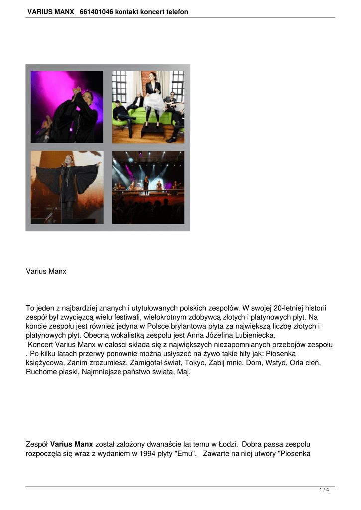 VARIUS MANX 661401046 kontakt koncert telefon Varius Manx To jeden z najbardziej znanych i utytułowanych polskich zespołów. W swojej 20-letniej historii zespół był zwycięzcą wielu festiwali, wielokrotnym zdobywcą złotych i platynowych płyt. Na koncie zespołu jest również jedyna w Polsce brylantowa płyta za największą liczbę złotych i platynowych płyt. Obecną wokalistką zespołu jest Anna Józefina Lubieniecka. Koncert Varius Manx w całości składa się z największych niezapomnianych przebojów zespołu . Po kilku latach przerwy ponownie można usłyszeć na żywo takie hity jak: Piosenka księżycowa, Zanim zrozumiesz, Zamigotał świat, Tokyo, Zabij mnie, Dom, Wstyd, Orła cień, Ruchome piaski, Najmniejsze państwo świata, Maj. Zespół Varius Manx został założony dwanaście lat temu w Łodzi. Dobra passa zespołu rozpoczęła się wraz z wydaniem w 1994 płyty "Emu". Zawarte na niej utwory "Piosenka 1/4 VARIUS MANX 661401046 kontakt koncert telefon księżycowa" oraz "Zanim zrozumiesz" stały się wielkimi przebojami zapewniającymi grupie popularność. Następny krążek - "Elf" - powtórzył sukces poprzednika, zdobywając kolejną platynową płytę oraz trzy Fryderyki.W 1995 roku Anita Lipnicka zdecydowała się rozpocząć karierę solową. Jej miejsce zajęła Kasia Stankiewicz, sympatyczna blondynka wyłoniona z programu "Szansa na sukces". Przeboje "Orła cień" czy "Ten sen" śpiewała cała Polska... Kolejny album "End - koniec niewinności". W marcu 2000 roku, na dziesięciolecie działalności, Varius Manx wydał album "Najlepsze z dobrych" podsumowujący ich dotychczasową karierę. Rok później, miejsce Kasi zajęła Monika Kuszyńska. Pierwsza płyta nagrana wspólnie z nową wokalistką przynosi nowe przeboje: "Maj" i "Jestem tobą". SPAV, w maju 2002 roku, przyznał także zespołowi Varius Manx "Brylantowš Płytę" za największą liczbę złotych i platynowych, które zespół osiagnął w latach 1991-2001. Płytę tę Varius Manx odebrał podczas święta ulicy Piotrkowskiej w Łodzi. Ósma produkcja tejże grupy, albumu "Eno" zawiera hit "Moje Eldorado". Zespół wyśpiewał nim sobie Grand Prix Festiwalu Piosenki Krajów Nadbałtyckich w Karlshamn. Na 15-lecie istnienia zespół przygotował nową płytę, której tytuł zgodnie z tradycją będzie trzyliterowy i rozpoczynający się na literę "E"- tym razem "EMI". Materiał powstawał w studiu S4 w Warszawie oraz w łódzkim studiu Aurolac. Do pracy nad nim zaproszono m.in. aranżera Wojtka Lemańskiego (twórcę muzyki do filmu "Edi" w reżyserii P. Trzaskalskiego) i znanego rapera Reda. Na krążku usłyszymy orkiestrę symfoniczną pod kierownictwem Mirosława Błaszczyka, a oprócz śpiewającej Moniki Kuszyńskiej (która zadebiutowała w roli autorki tekstów) swoje umiejętności wokalne zaprezentował Robert Janson. Dzięki tym wszystkim zabiegom krążek zyskał bardzo bogatą i różnorodną aranżację. Premiera płyty, zawierającej 12 utworów (również w języku angielskim i francuskim) odbyła się 28 maja 2004 roku podczas Festiwalu Piosenki Polskiej w Opolu. Piosenka "Pamiętaj mnie" to tyłu pierwszego singla promującego album. Drugim singlem jest "Stay in my heart". W utworze oprócz wokalistki Moniki Kuszyńskiej, śpiewającej po angielsku możemy usłyszeć rap francuski w wykonaniu Reda. 2005 rok, to premiera piosenki BEZIMIENNA. Jay Baumgardner, znany amerykański producent - twórca sukcesu m.in. zespołu Evanescence, po wysłuchaniu utworu "Bezimienna", wyraził zainteresowanie piosenką i przystał na propozycję mixu utworu. Piosenka została zgrana w jego studio NRG Hollywood California. Mastering został zrobiony w Nowym Jorku przez Gene Paul w DB PLUS. Na odpowiedź z Los Angeles Varius Manx czekał bardzo długo, właściwie już stracił nadzieję, ale w ostatnim momencie przyszła zgoda od Jay Baumgardnera, że można przyjeżdżać do Hollywood do jego studia, gdyż piosenka bardzo mu się podoba. W NRG nagrywały największe amerykańskie gwiazdy m.in. Linkin Park, No Doubt, Avril Lavigne, Offspring, Limp Bizkit, Ice Cube, Tracy Chapman. Przy sesji obecny był również producent światowego koncernu muzycznego, któremu bardzo spodobała się muzyka Varius Manx i głos Moniki Kuszyńskiej. Paweł Marciniak, który realizował nagranie piosenki w Polsce (Aurolac Studio), był również obecny podczas mixu w NRG (więcej zdjęć w galerii). Varius Manx z piosenką "Bezimienna" został wyróżniony w konkursie Premier przez festiwalowe jury podczas 42. KFPP w Opolu. Utwór przez wiele miesięcy gościł na listach przebojów w całym kraju. Kolejny rok zapowiadał się bardzo pracowicie. Od początku 2006 roku trwały przygotowania do projektu Varius Manx Symfonicznie. 8. kwietnia w Studio im. Agnieszki Osieckiej w Warszawie, Varius Manx wystąpił z koncertem akustycznym z największymi przebojami. Zespołowi towarzyszyła Orkiestra Smyczkowa muzyków Filharmonii Łódzkiej. Aranżację na smyki przygotował Wojciech Lemański - twórca muzyki m.in. do filmu "EDI". W koncercie tym udział wzięło aż 32. muzyków. Największe przeboje Varius Manx w wersji akustycznej z 2/4 VARIUS MANX 661401046 kontakt koncert telefon towarzyszeniem orkiestry smyczkowej: Jestem Twoją Afryką, Wstyd, Jestem Tobą, Piosenka księżycowa, Pamiętaj mnie, Bezimienna, Pocałuj noc, Mówią mi, Happy People, Ten sen, Moje Eldorado, Orła cień, Zanim zrozumiesz. Zupełnie inna formuła koncertu bardzo spodobała się Zespołowi. Koncert został zarejestrowany i wkrótce miał się ukazać na płycie. Jednocześnie zbierany był materiał na płytę DVD, która miała ukazać dorobek Varius Manx od początku zespołu aż po ostatnie wydarzenia z udziałem Moniki Kuszyńskiej. Prowadzone były także rozmowy na temat reedycji pierwszych albumów Varius Manx, które od kilku lat były niedostępne w sprzedaży: THE BEGINNING, THE NEW SHAPE. Nic nie zapowiadało, iż 