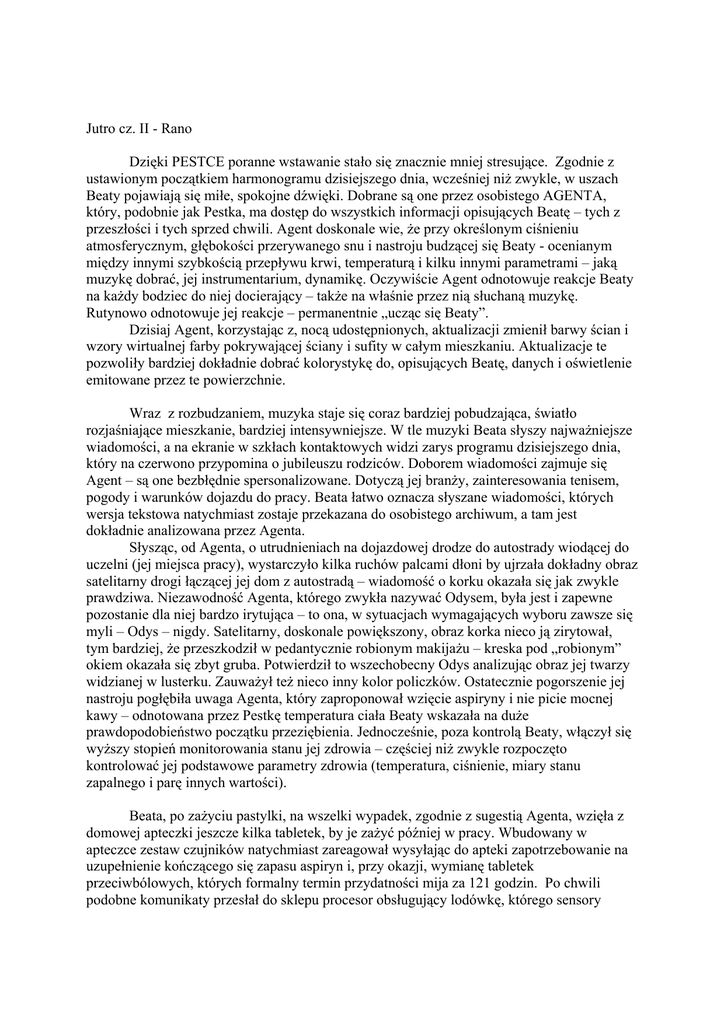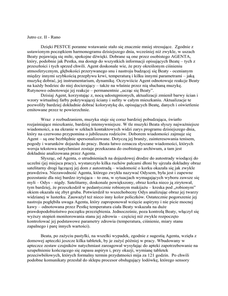 Jutro cz. II - Rano Dzięki PESTCE poranne wstawanie stało się znacznie mniej stresujące. Zgodnie z ustawionym początkiem harmonogramu dzisiejszego dnia, wcześniej niż zwykle, w uszach Beaty pojawiają się miłe, spokojne dźwięki. Dobrane są one przez osobistego AGENTA, który, podobnie jak Pestka, ma dostęp do wszystkich informacji opisujących Beatę – tych z przeszłości i tych sprzed chwili. Agent doskonale wie, że przy określonym ciśnieniu atmosferycznym, głębokości przerywanego snu i nastroju budzącej się Beaty - ocenianym między innymi szybkością przepływu krwi, temperaturą i kilku innymi parametrami – jaką muzykę dobrać, jej instrumentarium, dynamikę. Oczywiście Agent odnotowuje reakcje Beaty na każdy bodziec do niej docierający – także na właśnie przez nią słuchaną muzykę. Rutynowo odnotowuje jej reakcje – permanentnie „ucząc się Beaty”. Dzisiaj Agent, korzystając z, nocą udostępnionych, aktualizacji zmienił barwy ścian i wzory wirtualnej farby pokrywającej ściany i sufity w całym mieszkaniu. Aktualizacje te pozwoliły bardziej dokładnie dobrać kolorystykę do, opisujących Beatę, danych i oświetlenie emitowane przez te powierzchnie. Wraz z rozbudzaniem, muzyka staje się coraz bardziej pobudzająca, światło rozjaśniające mieszkanie, bardziej intensywniejsze. W tle muzyki Beata słyszy najważniejsze wiadomości, a na ekranie w szkłach kontaktowych widzi zarys programu dzisiejszego dnia, który na czerwono przypomina o jubileuszu rodziców. Doborem wiadomości zajmuje się Agent – są one bezbłędnie spersonalizowane. Dotyczą jej branży, zainteresowania tenisem, pogody i warunków dojazdu do pracy. Beata łatwo oznacza słyszane wiadomości, których wersja tekstowa natychmiast zostaje przekazana do osobistego archiwum, a tam jest dokładnie analizowana przez Agenta. Słysząc, od Agenta, o utrudnieniach na dojazdowej drodze do autostrady wiodącej do uczelni (jej miejsca pracy), wystarczyło kilka ruchów palcami dłoni by ujrzała dokładny obraz satelitarny drogi łączącej jej dom z autostradą – wiadomość o korku okazała się jak zwykle prawdziwa. Niezawodność Agenta, którego zwykła nazywać Odysem, była jest i zapewne pozostanie dla niej bardzo irytująca – to ona, w sytuacjach wymagających wyboru zawsze się myli – Odys – nigdy. Satelitarny, doskonale powiększony, obraz korka nieco ją zirytował, tym bardziej, że przeszkodził w pedantycznie robionym makijażu – kreska pod „robionym” okiem okazała się zbyt gruba. Potwierdził to wszechobecny Odys analizując obraz jej twarzy widzianej w lusterku. Zauważył też nieco inny kolor policzków. Ostatecznie pogorszenie jej nastroju pogłębiła uwaga Agenta, który zaproponował wzięcie aspiryny i nie picie mocnej kawy – odnotowana przez Pestkę temperatura ciała Beaty wskazała na duże prawdopodobieństwo początku przeziębienia. Jednocześnie, poza kontrolą Beaty, włączył się wyższy stopień monitorowania stanu jej zdrowia – częściej niż zwykle rozpoczęto kontrolować jej podstawowe parametry zdrowia (temperatura, ciśnienie, miary stanu zapalnego i parę innych wartości). Beata, po zażyciu pastylki, na wszelki wypadek, zgodnie z sugestią Agenta, wzięła z domowej apteczki jeszcze kilka tabletek, by je zażyć później w pracy. Wbudowany w apteczce zestaw czujników natychmiast zareagował wysyłając do apteki zapotrzebowanie na uzupełnienie kończącego się zapasu aspiryn i, przy okazji, wymianę tabletek przeciwbólowych, których formalny termin przydatności mija za 121 godzin. Po chwili podobne komunikaty przesłał do sklepu procesor obsługujący lodówkę, którego sensory odnotowały kończące się zapasy jajek i musztardy oraz czujniki pojemnika z kończącą się wodą do picia. Po śniadaniu Agent zaproponował zmianę poziomów priorytetów odbieranych przez Beatę telefonów, by od tej chwili poza rodzicami, siostrą i Zenkiem mogli dodzwonić się do niej także wybrani znajomi i niektóre osoby z pracy. Po zgodzie na zmianę tych poziomów, natychmiast w rogu widzianego obrazu pojawiły się identyfikatory (zdjęcia i imiona) trzech nadawców wiadomości, które Agent sugerował odsłuchać, zwracając uwagę, że czas ich odtwarzania będzie trwał 190 sekund. Wiadomości okazały się mało istotne i nie wymagające odpowiedzi. Odys dostał zgodę na potwierdzenie nadawcom odebrania ich wiadomości. Beata opuszczając mieszkanie delikatnie pchnęła za sobą drzwi, które domknęły się automatycznie. Gdy domowe sensory wyczuły brak obecności Beaty, spowodowały rozpoczęcie standardowej procedury zamykania i zabezpieczania mieszkania, wyłączania urządzeń pobierających energię elektryczną, ograniczenia poboru mocy przez klimatyzację i uruchamiania systemu zabezpieczeń oraz sprzątania mieszkania. Niewielki samobieżny automat, na długich teleskopowych odnóżach, bez pośpiechu, dokładnie, systematycznie rozpoczął odkurzanie mieszkania i mycie pokrytych kafelkami podług oraz urządzeń sanitarnych. Warszawa 28 października 2007. Włodzimierz Gogołek