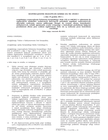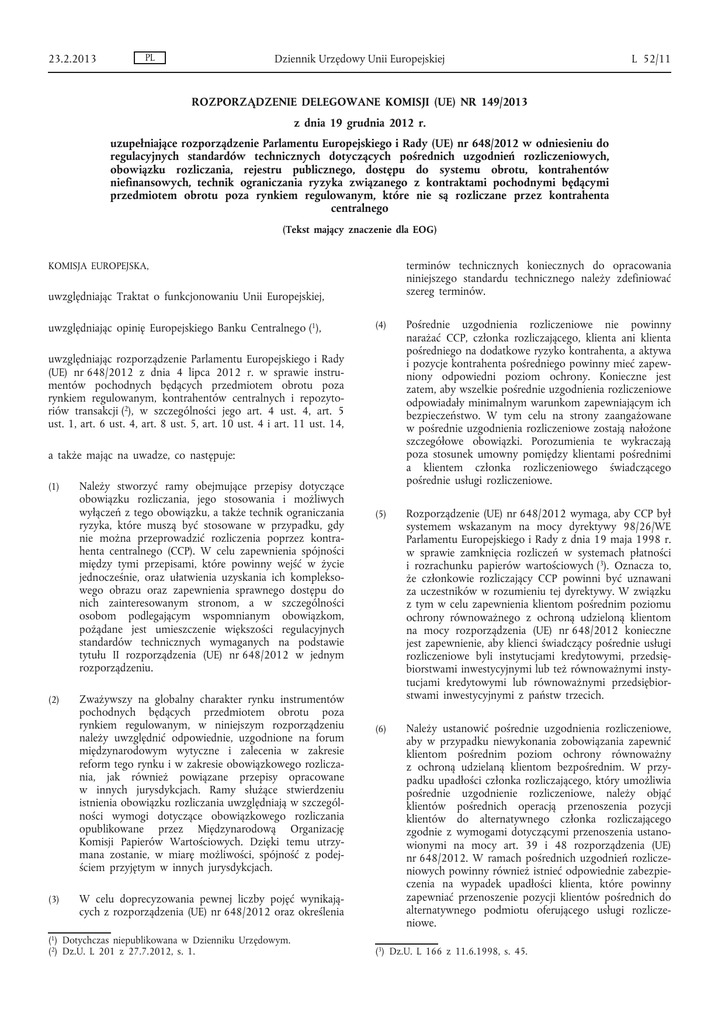 23.2.2013 PL Dziennik Urzędowy Unii Europejskiej L 52/11 ROZPORZĄDZENIE DELEGOWANE KOMISJI (UE) NR 149/2013 z dnia 19 grudnia 2012 r. uzupełniające rozporządzenie Parlamentu Europejskiego i Rady (UE) nr 648/2012 w odniesieniu do regulacyjnych standardów technicznych dotyczących pośrednich uzgodnień rozliczeniowych, obowiązku rozliczania, rejestru publicznego, dostępu do systemu obrotu, kontrahentów niefinansowych, technik ograniczania ryzyka związanego z kontraktami pochodnymi będącymi przedmiotem obrotu poza rynkiem regulowanym, które nie są rozliczane przez kontrahenta centralnego (Tekst mający znaczenie dla EOG) terminów technicznych koniecznych do opracowania niniejszego standardu technicznego należy zdefiniować szereg terminów. KOMISJA EUROPEJSKA, uwzględniając Traktat o funkcjonowaniu Unii Europejskiej, uwzględniając opinię Europejskiego Banku Centralnego (1), (4) Pośrednie uzgodnienia rozliczeniowe nie powinny narażać CCP, członka rozliczającego, klienta ani klienta pośredniego na dodatkowe ryzyko kontrahenta, a aktywa i pozycje kontrahenta pośredniego powinny mieć zapew niony odpowiedni poziom ochrony. Konieczne jest zatem, aby wszelkie pośrednie uzgodnienia rozliczeniowe odpowiadały minimalnym warunkom zapewniającym ich bezpieczeństwo. W tym celu na strony zaangażowane w pośrednie uzgodnienia rozliczeniowe zostają nałożone szczegółowe obowiązki. Porozumienia te wykraczają poza stosunek umowny pomiędzy klientami pośrednimi a klientem członka rozliczeniowego świadczącego pośrednie usługi rozliczeniowe. (5) Rozporządzenie (UE) nr 648/2012 wymaga, aby CCP był systemem wskazanym na mocy dyrektywy 98/26/WE Parlamentu Europejskiego i Rady z dnia 19 maja 1998 r. w sprawie zamknięcia rozliczeń w systemach płatności i rozrachunku papierów wartościowych (3). Oznacza to, że członkowie rozliczający CCP powinni być uznawani za uczestników w rozumieniu tej dyrektywy. W związku z tym w celu zapewnienia klientom pośrednim poziomu ochrony równoważnego z ochroną udzieloną klientom na mocy rozporządzenia (UE) nr 648/2012 konieczne jest zapewnienie, aby klienci świadczący pośrednie usługi rozliczeniowe byli instytucjami kredytowymi, przedsię biorstwami inwestycyjnymi lub też równoważnymi insty tucjami kredytowymi lub równoważnymi przedsiębior stwami inwestycyjnymi z państw trzecich. (6) Należy ustanowić pośrednie uzgodnienia rozliczeniowe, aby w przypadku niewykonania zobowiązania zapewnić klientom pośrednim poziom ochrony równoważny z ochroną udzielaną klientom bezpośrednim. W przy padku upadłości członka rozliczającego, który umożliwia pośrednie uzgodnienie rozliczeniowe, należy objąć klientów pośrednich operacją przenoszenia pozycji klientów do alternatywnego członka rozliczającego zgodnie z wymogami dotyczącymi przenoszenia ustano wionymi na mocy art. 39 i 48 rozporządzenia (UE) nr 648/2012. W ramach pośrednich uzgodnień rozlicze niowych powinny również istnieć odpowiednie zabezpie czenia na wypadek upadłości klienta, które powinny zapewniać przenoszenie pozycji klientów pośrednich do alternatywnego podmiotu oferującego usługi rozlicze niowe. uwzględniając rozporządzenie Parlamentu Europejskiego i Rady (UE) nr 648/2012 z dnia 4 lipca 2012 r. w sprawie instru mentów pochodnych będących przedmiotem obrotu poza rynkiem regulowanym, kontrahentów centralnych i repozyto riów transakcji (2), w szczególności jego art. 4 ust. 4, art. 5 ust. 1, art. 6 ust. 4, art. 8 ust. 5, art. 10 ust. 4 i art. 11 ust. 14, a także mając na uwadze, co następuje: (1) (2) (3) Należy stworzyć ramy obejmujące przepisy dotyczące obowiązku rozliczania, jego stosowania i możliwych wyłączeń z tego obowiązku, a także technik ograniczania ryzyka, które muszą być stosowane w przypadku, gdy nie można przeprowadzić rozliczenia poprzez kontra henta centralnego (CCP). W celu zapewnienia spójności między tymi przepisami, które powinny wejść w życie jednocześnie, oraz ułatwienia uzyskania ich komplekso wego obrazu oraz zapewnienia sprawnego dostępu do nich zainteresowanym stronom, a w szczególności osobom podlegającym wspomnianym obowiązkom, pożądane jest umieszczenie większości regulacyjnych standardów technicznych wymaganych na podstawie tytułu II rozporządzenia (UE) nr 648/2012 w jednym rozporządzeniu. Zważywszy na globalny charakter rynku instrumentów pochodnych będących przedmiotem obrotu poza rynkiem regulowanym, w niniejszym rozporządzeniu należy uwzględnić odpowiednie, uzgodnione na forum międzynarodowym wytyczne i zalecenia w zakresie reform tego rynku i w zakresie obowiązkowego rozlicza nia, jak również powiązane przepisy opracowane w innych jurysdykcjach. Ramy służące stwierdzeniu istnienia obowiązku rozliczania uwzględniają w szczegól ności wymogi dotyczące obowiązkowego rozliczania opublikowane przez Międzynarodową Organizację Komisji Papierów Wartościowych. Dzięki temu utrzy mana zostanie, w miarę możliwości, spójność z podej ściem przyjętym w innych jurysdykcjach. W celu doprecyzowania pewnej liczby pojęć wynikają cych z rozporządzenia (UE) nr 648/2012 oraz określenia (1) Dotychczas niepublikowana w Dzienniku Urzędowym. (2) Dz.U. L 201 z 27.7.2012, s. 1. (3) Dz.U. L 166 z 11.6.1998, s. 45. L 52/12 (7) (8) (9) (10) PL Dziennik Urzędowy Unii Europejskiej Ponieważ pośrednie uzgodnienia rozliczeniowe mogą być źródłem szczególnych ryzyk, wszystkie strony pośred niego uzgodnienia rozliczeniowego, w tym członkowie rozliczeniowi i CCP, powinni stale identyfikować i moni torować istotne ryzyka wynikające z tego uzgodnienia oraz zarządzać tymi ryzykami. Szczególnie ważna w tym kontekście jest odpowiednia wymiana informacji pomiędzy klientami świadczącymi pośrednie usługi rozliczeniowe a członkami rozliczającymi umożliwiają cymi te usługi. Członkowie rozliczający powinni wyko rzystywa