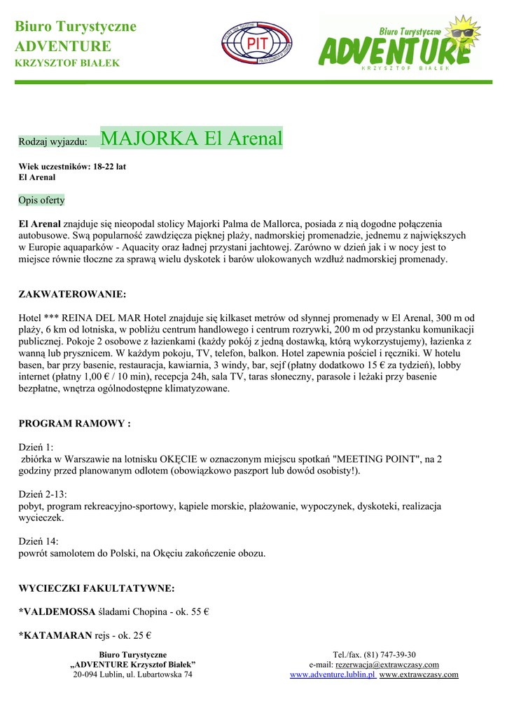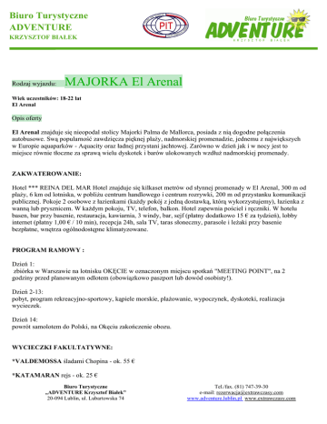 Biuro Turystyczne ADVENTURE KRZYSZTOF BIAŁEK Rodzaj wyjazdu: MAJORKA El Arenal Wiek uczestników: 18-22 lat El Arenal Opis oferty El Arenal znajduje się nieopodal stolicy Majorki Palma de Mallorca, posiada z nią dogodne połączenia autobusowe. Swą popularność zawdzięcza pięknej plaży, nadmorskiej promenadzie, jednemu z największych w Europie aquaparków - Aquacity oraz ładnej przystani jachtowej. Zarówno w dzień jak i w nocy jest to miejsce równie tłoczne za sprawą wielu dyskotek i barów ulokowanych wzdłuż nadmorskiej promenady. ZAKWATEROWANIE: Hotel *** REINA DEL MAR Hotel znajduje się kilkaset metrów od słynnej promenady w El Arenal, 300 m od plaży, 6 km od lotniska, w pobliżu centrum handlowego i centrum rozrywki, 200 m od przystanku komunikacji publicznej. Pokoje 2 osobowe z łazienkami (każdy pokój z jedną dostawką, którą wykorzystujemy), łazienka z wanną lub prysznicem. W każdym pokoju, TV, telefon, balkon. Hotel zapewnia pościel i ręczniki. W hotelu basen, bar przy basenie, restauracja, kawiarnia, 3 windy, bar, sejf (płatny dodatkowo 15 € za tydzień), lobby internet (płatny 1,00 € / 10 min), recepcja 24h, sala TV, taras słoneczny, parasole i leżaki przy basenie bezpłatne, wnętrza ogólnodostępne klimatyzowane. PROGRAM RAMOWY : Dzień 1: zbiórka w Warszawie na lotnisku OKĘCIE w oznaczonym miejscu spotkań "MEETING POINT", na 2 godziny przed planowanym odlotem (obowiązkowo paszport lub dowód osobisty!). Dzień 2-13: pobyt, program rekreacyjno-sportowy, kąpiele morskie, plażowanie, wypoczynek, dyskoteki, realizacja wycieczek. Dzień 14: powrót samolotem do Polski, na Okęciu zakończenie obozu. WYCIECZKI FAKULTATYWNE: *VALDEMOSSA śladami Chopina - ok. 55 € *KATAMARAN rejs - ok. 25 € Biuro Turystyczne „ADVENTURE Krzysztof Białek” 20-094 Lublin, ul. Lubartowska 74 Tel./fax. (81) 747-39-30 e-mail: [email protected] www.adventure.lublin.pl www.extrawczasy.com Biuro Turystyczne ADVENTURE KRZYSZTOF BIAŁEK *JASKINIA SMOKA - ok. 40 € *DYSKOTEKA - ok. 10-40 € Sugerowane kieszonkowe na drobne wydatki ok. 100 € KAUCJA ZWROTNA: w wysokości 25 € obejmuje ewentualne szkody wyrządzone przez uczestników. Uwaga: pieniądze na wycieczki oraz kaucję zwrotną - opiekunowie zbierają pierwszego dnia, a kaucję oddają w ostatni dzień pobytu po wykwaterowaniu i sprawdzeniu pokoi. Zakwaterowanie 14 noclegów w hotelu ***REINA DEL MAR Wyżywienie 2 x dziennie - śniadania i obiadokolacje w formie bufetu Dojazd przelot samolotem Warszawa - Palma - Warszawa Terminy i ceny 01ELAR/11 02ELAR/11 3245.00 PLN 3245.00 PLN 2011-07-30 - 2011-08-13 2011-08-13 - 2011-08-27 rezerwuję rezerwuję Cena zawiera * przelot samolotem Warszawa - Palma - Warszawa * transfery lotnisko - hotel - lotnisko * 14 noclegów w hotelu ***REINA DEL MAR * wyżywienie 2 x dziennie - śniadania i obiadokolacje w formie bufetu *ubezpieczenie KL, NNW i bagażu *wszystkie opłaty lotniskowe Programy i koszty dodatkowe *kosztów wody i innych napojów do obiadokolacji Biuro Turystyczne „ADVENTURE Krzysztof Białek” 20-094 Lublin, ul. Lubartowska 74 Tel./fax. (81) 747-39-30 e-mail: [email protected] www.adventure.lublin.pl www.extrawczasy.com