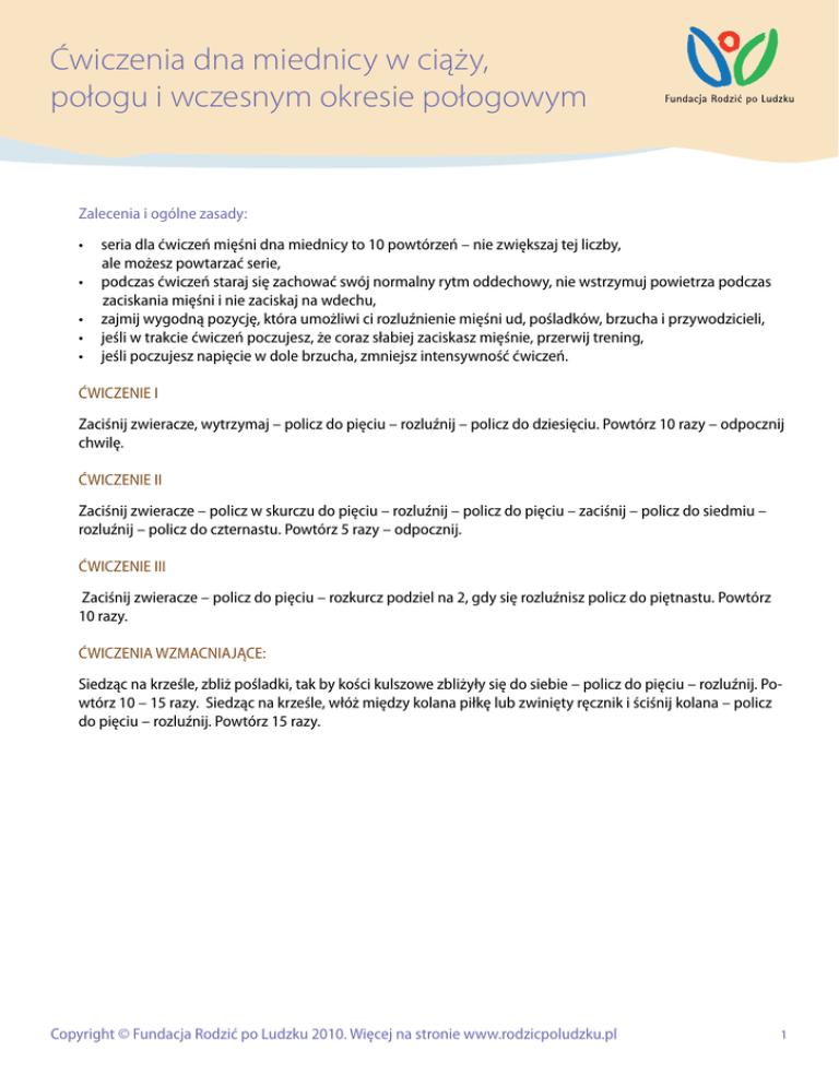Ćwiczenia dna miednicy w ciąży, połogu i wczesnym okresie połogowym Zalecenia i ogólne zasady: • seria dla ćwiczeń mięśni dna miednicy to 10 powtórzeń – nie zwiększaj tej liczby, ale możesz powtarzać serie, • podczas ćwiczeń staraj się zachować swój normalny rytm oddechowy, nie wstrzymuj powietrza podczas zaciskania mięśni i nie zaciskaj na wdechu, • zajmij wygodną pozycję, która umożliwi ci rozluźnienie mięśni ud, pośladków, brzucha i przywodzicieli, • jeśli w trakcie ćwiczeń poczujesz, że coraz słabiej zaciskasz mięśnie, przerwij trening, • jeśli poczujesz napięcie w dole brzucha, zmniejsz intensywność ćwiczeń. ĆWICZENIE I Zaciśnij zwieracze, wytrzymaj – policz do pięciu – rozluźnij – policz do dziesięciu. Powtórz 10 razy – odpocznij chwilę. ĆWICZENIE II Zaciśnij zwieracze – policz w skurczu do pięciu – rozluźnij – policz do pięciu – zaciśnij – policz do siedmiu – rozluźnij – policz do czternastu. Powtórz 5 razy – odpocznij. ĆWICZENIE III Zaciśnij zwieracze – policz do pięciu – rozkurcz podziel na 2, gdy się rozluźnisz policz do piętnastu. Powtórz 10 razy. ĆWICZENIA WZMACNIAJĄCE: Siedząc na krześle, zbliż pośladki, tak by kości kulszowe zbliżyły się do siebie – policz do pięciu – rozluźnij. Powtórz 10 – 15 razy. Siedząc na krześle, włóż między kolana piłkę lub zwinięty ręcznik i ściśnij kolana – policz do pięciu – rozluźnij. Powtórz 15 razy. Copyright © Fundacja Rodzić po Ludzku 2010. Więcej na stronie www.rodzicpoludzku.pl 1