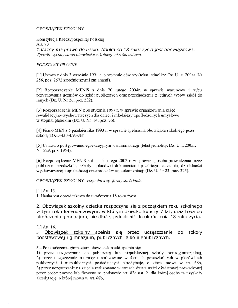 OBOWIĄZEK SZKOLNY Konstytucja Rzeczypospolitej Polskiej Art. 70 1.Każdy ma prawo do nauki. Nauka do 18 roku życia jest obowiązkowa. Sposób wykonywania obowiązku szkolnego określa ustawa. PODSTAWY PRAWNE [1] Ustawa z dnia 7 września 1991 r. o systemie oświaty (tekst jednolity: Dz. U. z 2004r. Nr 256, poz. 2572 z późniejszymi zmianami). [2] Rozporządzenie MENiS z dnia 20 lutego 2004r. w sprawie warunków i trybu przyjmowania uczniów do szkół publicznych oraz przechodzenia z jednych typów szkół do innych (Dz. U. Nr 26, poz. 232). [3] Rozporządzenie MEN z 30 stycznia 1997 r. w sprawie organizowania zajęć rewalidacyjno-wychowawczych dla dzieci i młodzieży upośledzonych umysłowo w stopniu głębokim (Dz. U. Nr 14, poz. 76). [4] Pismo MEN z 6 października 1993 r. w sprawie spełniania obowiązku szkolnego poza szkołą (DKO-430-4/93/JB). [5] Ustawa o postępowaniu egzekucyjnym w administracji (tekst jednolity: Dz. U. z 2005r. Nr 229, poz. 1954). [6] Rozporządzenie MENiS z dnia 19 lutego 2002 r. w sprawie sposobu prowadzenia przez publiczne przedszkola, szkoły i placówki dokumentacji przebiegu nauczania, działalności wychowawczej i opiekuńczej oraz rodzajów tej dokumentacji (Dz. U. Nr 23, poz. 225). OBOWIĄZEK SZKOLNY- kogo dotyczy, formy spełniania [1] Art. 15. 1. Nauka jest obowiązkowa do ukończenia 18 roku życia. 2. Obowiązek szkolny dziecka rozpoczyna się z początkiem roku szkolnego w tym roku kalendarzowym, w którym dziecko kończy 7 lat, oraz trwa do ukończenia gimnazjum, nie dłużej jednak niż do ukończenia 18 roku życia. [1] Art. 16. 5. Obowiązek szkolny spełnia się przez uczęszczanie podstawowej i gimnazjum, publicznych albo niepublicznych. do szkoły 5a. Po ukończeniu gimnazjum obowiązek nauki spełnia się: 1) przez uczęszczanie do publicznej lub niepublicznej szkoły ponadgimnazjalnej, 2) przez uczęszczanie na zajęcia realizowane w formach pozaszkolnych w placówkach publicznych i niepublicznych posiadających akredytację, o której mowa w art. 68b, 3) przez uczęszczanie na zajęcia realizowane w ramach działalności oświatowej prowadzonej przez osoby prawne lub fizyczne na podstawie art. 83a ust. 2, dla której osoby te uzyskały akredytację, o której mowa w art. 68b, 4) przez realizowanie, zgodnie z odrębnymi przepisami, przygotowania zawodowego u pracodawcy. 7. Za spełnianie obowiązku, o którym mowa w art. 14 ust. 3, obowiązku szkolnego i obowiązku nauki uznaje się również udział dzieci i młodzieży upośledzonych umysłowo w stopniu głębokim w zajęciach rewalidacyjno- wychowawczych, organizowanych zgodnie z odrębnymi przepisami [3]. 8. Na wniosek rodziców dyrektor publicznej szkoły podstawowej lub gimnazjum, w obwodzie w których dziecko mieszka, lub dyrektor szkoły ponadgimnazjalnej, do której dziecko uczęszcza, może zezwolić na spełnianie przez dziecko odpowiednio obowiązku szkolnego lub obowiązku nauki poza szkołą oraz określa warunki jego spełniania. Dziecko spełniając odpowiednio obowiązek szkolny lub obowiązek nauki w tej formie może otrzymać świadectwo ukończenia poszczególnych klas danej szkoły lub ukończenia tej szkoły na podstawie egzaminów klasyfikacyjnych przeprowadzonych przez szkołę, której dyrektor zezwolił na taką formę spełniania obowiązku szkolnego lub nauki. OBOWIĄZKI ORGANU PROWADZĄCEGO SZKOŁY [1] Art. 14. 1. Wychowanie przedszkolne obejmuje dzieci w wieku 3-6 lat. 1a. W przypadku dzieci posiadających orzeczenie o potrzebie kształcenia specjalnego wychowaniem przedszkolnym może być objęte dziecko w wieku powyżej 6 lat, nie dłużej jednak niż do końca roku szkolnego w tym roku kalendarzowym, w którym dziecko kończy 10 lat. Obowiązek szkolny tych dzieci może być odroczony do końca roku szkolnego w tym roku kalendarzowym, w którym dziecko kończy 10 lat. 1b. W szczególnie uzasadnionych przypadkach dyrektor przedszkola może przyjąć do przedszkola dziecko, które ukończyło 2,5 roku. 2. Przedszkole realizuje podstawę programową wychowania przedszkolnego określoną przez ministra właściwego do spraw oświaty i wychowania. 3. Dziecko w wieku 6 lat jest obowiązane odbyć roczne przygotowanie przedszkolne w przedszkolu albo w oddziale przedszkolnym zorganizowanym w szkole podstawowej. 3a. Obowiązek, o którym mowa w ust. 3, rozpoczyna się z początkiem roku szkolnego w tym roku kalendarzowym, w którym dziecko kończy 6 lat. W przypadku dziecka, o którym mowa w ust. 1a, obowiązek ten rozpoczyna się z początkiem roku szkolnego poprzedzającego rok szkolny, w którym dziecko rozpocznie spełnianie obowiązku szkolnego. 4. Zapewnienie warunków do spełniania obowiązku, o którym mowa w ust. 3, jest zadaniem własnym gminy. 5. Opłaty za świadczenia prowadzonych przez gminę przedszkoli publicznych ustala rada gminy, a w przypadku innych przedszkoli publicznych - organy prowadzące te przedszkola, z uwzględnieniem art. 6 pkt 1. [1] Art. 17. 1. Sieć publicznych szkół powinna być zorganizowana w sposób umożliwiający wszystkim dzieciom spełnianie obowiązku szkolnego, z uwzględnieniem ust.2. 2. Droga dziecka z domu do szkoły nie może przekraczać: 1) 3 km – w przypadku uczniów klas I- IV szkół podstawowych, 2) 4 km – w przypadku uczniów klas V- VI szkół podstawowych oraz uczniów gimnazjów. 3. Jeżeli droga dziecka z domu do szkoły, w obwodzie w której dziecko mieszka, przekracza odległości wymienione w ust.2, obowiązkiem gminy jest zapewnienie bezpłatnego transportu i opieki w czasie przewozu lub zwrot kosztów przejazdu, środkami komunikacji publicznej. 3a. Obowiązkiem gminy jest zapewnienie uczniom niepełnosprawnym, których kształcenie i wychowanie odbywa się na podstawie art. 71b, bezpłatnego transportu i opieki w czasie przewozu do najbliższej szkoły podstawowej, gimnazjum lub ośrodka umożliwiającego realizację obowiązku szkolnego i obowiązku nauki dzieciom i młodzieży, o który