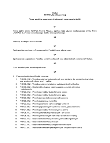 Statut TORPOL Spółki Akcyjnej Firma, siedziba, przedmiot działalności, czas trwania Spółki §1 Firma Spółki brzmi: TORPOL Spółka Akcyjna. Spółka może używać następującego skrótu firmy: „TORPOL S.A.” oraz wyróżniającego Spółkę znaku graficznego. §2 Siedzibą Spółki jest miasto Poznań. §3 Spółka działa na obszarze Rzeczpospolitej Polskiej i poza jej granicami. §4 Spółka działa na podstawie Kodeksu spółek handlowych oraz odpowiednich postanowień Statutu. §5 Czas trwania Spółki jest nieograniczony. §6 I. Przedmiot działalności Spółki obejmuje: 1. PKD 08.11.Z – Wydobywanie kamieni ozdobnych oraz kamienia dla potrzeb budownictwa, skał wapiennych, gipsu, kredy i łupków 2. PKD 08.12.Z – Wydobywanie żwiru i piasku; wydobywanie gliny i kaolinu 3. PKD 09.90.Z – Działalność usługowa wspomagająca pozostałe górnictwo i wydobywanie 4. PKD 23.61.Z – Produkcja wyrobów budowlanych z betonu 5. PKD 23.62.Z – Produkcja wyrobów budowlanych z gipsu 6. PKD 23.63.Z – Produkcja masy betonowej prefabrykatowej 7. PKD 23.64.Z – Produkcja zaprawy murarskiej 8. PKD 23.65.Z – Produkcja cementu wzmocnionego włóknem 9. PKD 23.69.Z – Produkcja pozostałych wyrobów z betonu, gipsu i cementu 10. PKD 24.33.Z – Produkcja wyrobów formowanych na zimno 11. PKD 25.11.Z – Produkcja konstrukcji metalowych i ich części 12. PKD 25.12.Z – Produkcja metalowych elementów stolarki budowlanej 13. PKD 33.11.Z – Naprawa i konserwacja metalowych wyrobów gotowych 14. PKD 33.12.Z – Naprawa i konserwacja maszyn 15. PKD 33.14.Z – Naprawa i konserwacja urządzeń elektrycznych 16. PKD 33.20.Z – Instalowanie maszyn przemysłowych, sprzętu i wyposażenia 17. PKD 37.00.Z – Odprowadzanie i oczyszczanie ścieków 18. PKD 38.11.Z – Zbieranie odpadów innych niż niebezpieczne 19. PKD 38.12.Z – Zbieranie odpadów niebezpiecznych 20. PKD 38.21.Z – Obróbka i usuwanie odpadów innych niż niebezpieczne 21. PKD 38.22.Z – Przetwarzanie i unieszkodliwianie odpadów niebezpiecznych 22. PKD 38.32.Z – Odzysk surowców z materiałów segregowanych 23. PKD 39.00.Z – Działalność związana z rekultywacją i pozostała działalność usługowa związana z gospodarką odpadami 24. PKD 41.10.Z – Realizacja projektów budowlanych związanych ze wznoszeniem budynków 25. PKD 41.20.Z – Roboty budowlane związane ze wznoszeniem budynków mieszkalnych i niemieszkalnych 26. PKD 42.11.Z – Roboty związane z budową dróg i autostrad 27. PKD 42.12.Z – Roboty związane z budową dróg szynowych i kolei podziemnej 28. PKD 42.13.Z – Roboty związane z budową mostów i tuneli 29. PKD 42.21.Z – Roboty związane z budową rurociągów przesyłowych i sieci rozdzielczych 30. PKD 42.22.Z – Roboty związane z budową linii telekomunikacyjnych i elektroenergetycznych 31. PKD 42.91.Z – Roboty związane z budową obiektów inżynierii wodnej 32. PKD 42.99.Z – Roboty związane z budową pozostałych obiektów inżynierii lądowej i wodnej, gdzie indziej niesklasyfikowane 33. PKD 43.11.Z – Rozbiórka i burzenie obiektów budowlanych 34. PKD 43.12.Z – Przygotowanie terenu pod budowę 35. PKD 43.13.Z – Wykonywanie wykopów i wierceń geologiczno-inżynierskich 36. PKD 43.21.Z – Wykonywanie instalacji elektrycznych 37. PKD 43.22.Z – Wykonywanie instalacji wodno-kanalizacyjnych, cieplnych, gazowych i klimatyzacyjnych 38. PKD 43.29.Z – Wykonywanie pozostałych instalacji budowlanych 39. PKD 43.31.Z – Tynkowanie 40. PKD 43.32.Z – Zakładanie stolarki budowlanej 41. PKD 43.33.Z – Posadzkarstwo; tapetowanie i oblicowywanie ścian 42. PKD 43.34.Z – Malowanie i szklenie 43. PKD 43.39.Z – Wykonywanie pozostałych robót budowlanych wykończeniowych 44. PKD 43.91.Z – Wykonywanie konstrukcji i pokryć dachowych 45. PKD 43.99.Z – Pozostałe specjalistyczne roboty budowlane, gdzie indziej niesklasyfikowane 46. PKD 45.11.Z – Sprzedaż hurtowa i detaliczna samochodów osobowych i furgonetek 47. PKD 45.19.Z – Sprzedaż hurtowa i detaliczna pozostałych pojazdów samochodowych, z wyłączeniem motocykli 48. PKD 45.20.Z – Konserwacja i naprawa pojazdów samochodowych, z wyłączeniem motocykli 49. PKD 45.31.Z – Sprzedaż hurtowa części i akcesoriów do pojazdów samochodowych, z wyłączeniem motocykli 50. PKD 45.32.Z – Sprzedaż detaliczna części i akcesoriów do pojazdów samochodowych, z wyłączeniem motocykli 51. PKD 46.51.Z – Sprzedaż hurtowa komputerów, urządzeń peryferyjnych i oprogramowania 52. PKD 46.63.Z – Sprzedaż hurtowa maszyn wykorzystywanych w górnictwie, budownictwie oraz inżynierii lądowej i wodnej 53. PKD 46.65.Z – Sprzedaż hurtowa mebli biurowych 54. PKD 46.66.Z – Sprzedaż hurtowa pozostałych maszyn i urządzeń biurowych 55. PKD 46.69.Z – Sprzedaż hurtowa pozostałych maszyn i urządzeń 56. PKD 46.71.Z – Sprzedaż hurtowa paliw i produktów pochodnych 57. PKD 46.73.Z – Sprzedaż hurtowa drewna, materiałów budowlanych i wyposażenia sanitarnego 58. PKD 46.74.Z – Sprzedaż hurtowa wyrobów metalowych oraz sprzętu i dodatkowego wyposażenia hydraulicznego i grzejnego 59. PKD 46.75.Z – Sprzedaż hurtowa wyrobów chemicznych 60. PKD 46.76.Z – Sprzedaż hurtowa pozostałych półproduktów 61. PKD 46.77.Z – Sprzedaż hurtowa odpadów i złomu 62. PKD 46.90.Z – Sprzedaż hurtowa niewyspecjalizowana 63. PKD 47.79.Z – Sprzedaż detaliczna artykułów używanych prowadzona w wyspecjalizowanych sklepach 64. PKD 47.91.Z – Sprzedaż detaliczna prowadzona przez domy sprzedaży wysyłkowej lub Internet 65. PKD 47.99.Z – Pozostała sprzedaż detaliczna prowadzona poza siecią sklepową, straganami i targowiskami 66. PKD 49.10.Z – Transport kolejowy pasażerski międzymiastowy 67. PKD 49.20.Z – Transport kolejowy towarów 68. PKD 49.39.Z – Pozostały transport lądowy pasażerski, gdzie indziej niesklasyfikowany 69. PKD 49.41.Z – Transport drogowy towarów 70. PKD 49.42.Z 