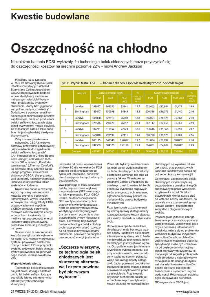 Kwestie budowlane Oszczędność na chłodno Niezależne badania EDSL wykazały, że technologia belek chłodzących może przyczyniać się do oszczędności kosztów na średnim poziomie 22% - mówi Andrew Jackson Pisaliśmy już w tym roku w RAC, że Stowarzyszenie Belek i Sufitów Chłodzących (Chilled Beams and Ceiling Association – CBCA) przeprowadziło badania w celu identyfikacji zachowań nabywczych właścicieli budynków i projektantów systemów chłodzenia, którzy bazują przede wszystkim „na tym, co wiedzą”. Dodatkowo z powodu recesji konieczna jest minimalizacja kosztów kapitałowych, przez co producenci belek i sufitów chłodzących stoją przed wyzwaniem: muszą dowieść, że w dłuższym okresie takie podejście nie jest najbardziej efektywne ekonomicznie. Żeby zmienić przekonania nabywców, CBCA stworzyło darmowy przewodnik zatytułowany „Wprowadzenie do zagadnienia belek i sufitów chłodzących” („An Introduction to Chilled Beams and Ceilings”) oraz Arkusz Techniczny 001 w ramach „Komfortu termicznego” („Thermal Comfort”). To pierwsze etapy szeroko zakrojonego programu zwiększenia aktywności CBCA, aby prezentować standardy najlepszych praktyk i korzyści z użytkowania takich systemów chłodzenia. Najnowsze badania zawierają krytyczną ocenę oszczędności kosztów energii w budynkach komercyjnych. Wyniki uzyskane w nowym Tas Energy Study EDSL przeprowadzonym wspólnie z CBCA dotyczyły porównania rocznych kosztów zużycia energii w budynkach i wykazały, że możliwa jest oszczędność energii i kosztów dzięki zastosowaniu produktów, które są już dostępne na rynku. Szacunkowo te oszczędności kosztów energii zostały wyliczone na około 17% rocznie w przypadku systemu pasywnych belek chłodzących i około 22% w przypadku systemu aktywnych belek chłodzących w porównaniu do generycznego modelu klimakonwektorów VAV. Współdzielenie wiedzy Technologia belek chłodzących nie jest nowa. W ciągu ostatnich ośmiu lat belki i sufity chłodzące pozyskały istotny segment rynku alternatywnych technologii klimatyzacji. Ryc. 1: Wyniki testu EDSL Miejsce – badanie dla cen 13p/kWh za elektryczność i 5p/kWh za gaz Zużycie energii (kWh) FCU 1 2 3 4 FCUACB Koszty eksploatacji (£) % OSZCZĘDNOŚCI RE FCU FCU % ACB FCU- ACB OSZCZĘDNOŚCI RE FCU Londyn 198897 163756 35141 17.7 £22,463 £17,984 £4,479 19.9 Birmingham 185447 150598 34849 18.8 £20,516 £16,076 £4,440 21.6 Londyn 404008 327919 76089 18.8 £46,093 £36,425 £9,668 21.0 Birmingham 375536 299479 76057 20.3 £42,117 £32,456 £9,661 22.9 Londyn 392231 319457 72774 18.6 £44,616 £35,366 £9,250 20.7 Birmingham 365010 292599 72411 19.8 £40,778 £31,575 £9,203 22.6 Londyn 800175 642348 157827 19.7 £91,894 £71,892 £20,002 21.8 Birmingham 742509 584320 158189 21.3 £84,051 £64,004 £20,047 23.9 432977 347560 85417 19.7 £49,066 £38,222 £10,844 22.1 Średnio Jednakże od czasu wprowadzenia silników EC dla konwektorów FCU dotarcie belek chłodzących do rynku jest utrudnione, ponieważ nie używają one żadnych wtórnych bezpieczników. Uwzględniając te fakty, korzystne byłoby dopuszczenie większej mocy właściwej (SFP) wentylatora, jak w przypadku FCU. CBCA uważa, że dalsze zwiększanie SFP wentylatorów wtórnych w przeciwieństwie do dopuszczalnych dla centralnych systemów wentylacyjno-klimatyzacyjnych (na tym samym poziomie w obu przypadkach) byłoby niesprawiedliwe, ale według najnowszych badań technologia belek chłodzących nadal powinna być rozważana na równi z innymi systemami chłodzenia, ponieważ potencjalna oszczędność energii jest istotna. „Szczerze wierzymy, że technologia belek chłodzących jest skuteczną alternatywą i często powinna być pierwszym wyborem”. 24WRZESIEŃ 2013 | Chłód i klimatyzacja ACB Przez lata byliśmy świadkami niejasności wokół wydajności belek i sufitów chłodzących i chcieliśmy ostatecznie zamknąć ten etap za pomocą faktów. W związku ze zmianami Części L Przepisów Budowlanych, jest to ważne także dla projektów wykonania rządowych celów energetycznych: niedawno ogłoszono docelowy poziom 9% dla budynków oprócz budynków mieszkalnych. Poza tym koszty zużycia energii są ważną sprawą, dlatego należy rozważyć zarówno koszty bieżące, jak i koszty produktu w całym cyklu życia. Rozwiązania oparte na belkach chłodzących mają być może wyższe koszty kapitałowe niż niektóre alternatywne systemy, ale to badanie dowodzi, że technologia belek chłodzących jest wyjątkowo wydajna. Oczywiście, cena jest istotnym czynnikiem wyboru produktu, ale przy ocenie stosunku wartości do ceny trzeba na samym początku wziąć pod uwagę koszty całego cyklu życia, ponieważ produkty instalowane obecnie muszą spełniać oczekiwania użytkowników przez dziesięciolecia. Przy niewielu częściach ruchomych, takich jak w mechanicznych wentylatorach, koszty bieżącej konserwacji belek chłodzących są wyraźnie niższe. Jak często przy początkowych kosztach kapitałowych ocenia się potrzebę i koszty konserwacji? Co ciekawe, zastosowanie belek chłodzących zwykle wiąże się bezpośrednio z projektami współfinansowanymi przez właściciela-użytkownika i rząd. W takich przypadkach klienta zwykle stać na wstępne koszty kapitałowe, co pozwala mu z czasem maksymalizować zasoby i bezpośrednio korzystać z długoterminowych zysków. Poszczególne jednostki zaangażowane w proces wyboru powinny współpracować. Wątpliwości, jakie często podnoszą interesariusze projektów, różnią się od problemów właścicieli budynków, inżynierów-konsultantów albo architektów. Jeśli chodzi o właściciela budynku, specyfikacja może być uzależniona od dostępu do informacji na temat oferowanych systemów klimatyzacji i od sugestii profesjonalnych doradców o najwłaściwszym rozwiązaniu dla danego budynku, zaś dla inżynierów-konsultantów będzie się liczy