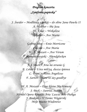 Program koncertu „Symfonia papieska” J. Świder – Modlitwa o pokój – do słów Jana Pawła II A. Webber – Pie Jesu W. Kilar – Wokaliza Schuber – Ave Maria Gabriel oboe – Enio Morricone Caccini – Ave Maria W. A. Mozart – Ave Verum Romans rosyjski - Abendglocken J. S. Bach – Aria na strunie G F. Lehar – Usta milczą, dusza śpiewa C. Franc – Panis Angelicus F. Sartori – Time to say goodbye W. A. Mozart – Eine kleine Nachtmusic J. Bock – Sunrise, Sunset Händel Opera Rinaldo Aria 'Lascia ch'io Pianga J. Brahms – V Taniec Węgierski Moje miasto Wadowice