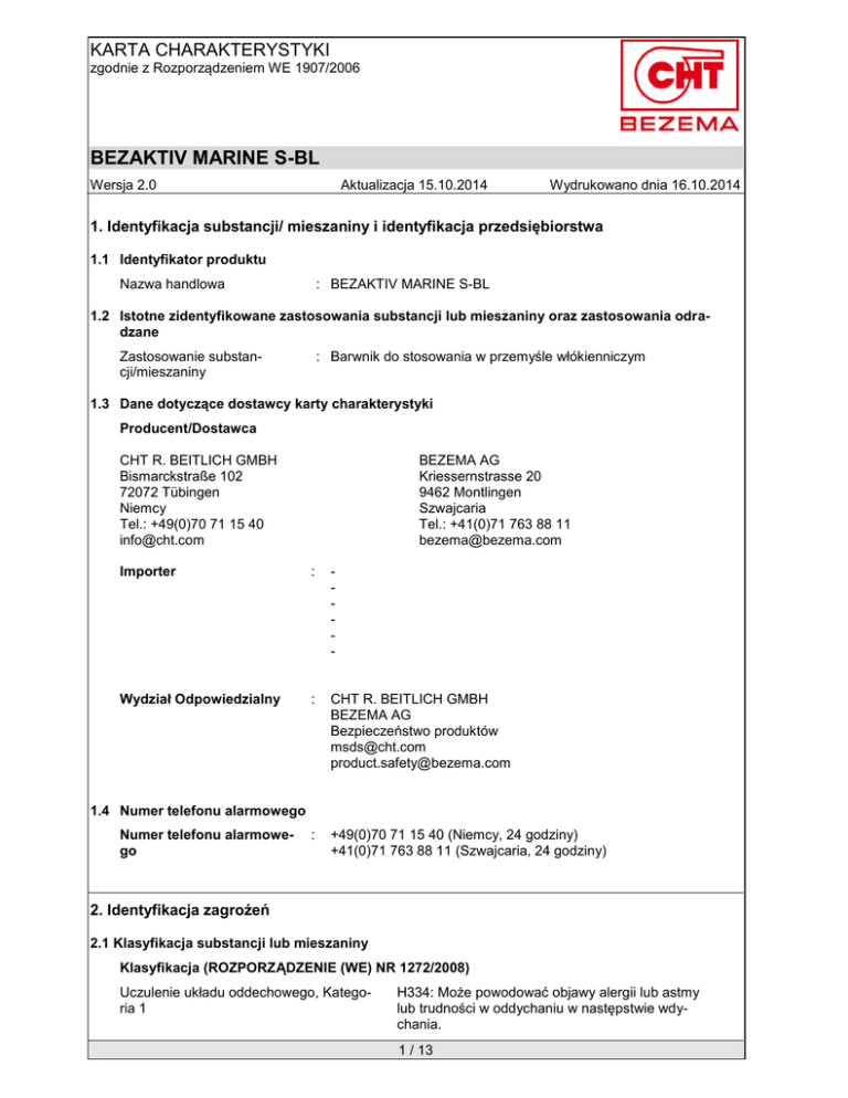 KARTA CHARAKTERYSTYKI zgodnie z Rozporządzeniem WE 1907/2006 BEZAKTIV MARINE S-BL Wersja 2.0 Aktualizacja 15.10.2014 Wydrukowano dnia 16.10.2014 1. Identyfikacja substancji/ mieszaniny i identyfikacja przedsiębiorstwa 1.1 Identyfikator produktu Nazwa handlowa : BEZAKTIV MARINE S-BL 1.2 Istotne zidentyfikowane zastosowania substancji lub mieszaniny oraz zastosowania odradzane : Barwnik do stosowania w przemyśle włókienniczym Zastosowanie substancji/mieszaniny 1.3 Dane dotyczące dostawcy karty charakterystyki Producent/Dostawca CHT R. BEITLICH GMBH Bismarckstraße 102 72072 Tübingen Niemcy Tel.: +49(0)70 71 15 40 [email protected] BEZEMA AG Kriessernstrasse 20 9462 Montlingen Szwajcaria Tel.: +41(0)71 763 88 11 [email protected] Importer : - Wydział Odpowiedzialny : CHT R. BEITLICH GMBH BEZEMA AG Bezpieczeństwo produktów [email protected] [email protected] : +49(0)70 71 15 40 (Niemcy, 24 godziny) +41(0)71 763 88 11 (Szwajcaria, 24 godziny) 1.4 Numer telefonu alarmowego Numer telefonu alarmowego 2. Identyfikacja zagrożeń 2.1 Klasyfikacja substancji lub mieszaniny Klasyfikacja (ROZPORZĄDZENIE (WE) NR 1272/2008) Uczulenie układu oddechowego, Kategoria 1 H334: Może powodować objawy alergii lub astmy lub trudności w oddychaniu w następstwie wdychania. 1 / 13 KARTA CHARAKTERYSTYKI zgodnie z Rozporządzeniem WE 1907/2006 BEZAKTIV MARINE S-BL Wersja 2.0 Aktualizacja 15.10.2014 Działanie uczulające na skórę, Kategoria 1 Wydrukowano dnia 16.10.2014 H317: Może powodować reakcję alergiczną skóry. Klasyfikacja (67/548/EWG, 1999/45/WE) R42/43: Może powodować uczulenie w następstwie narażenia drogą oddechową i w kontakcie ze skórą. Produkt szkodliwy 2.2 Elementy oznakowania Oznakowanie (ROZPORZĄDZENIE (WE) NR 1272/2008) Piktogramy określające rodzaj zagrożenia : Hasło ostrzegawcze : Niebezpieczeństwo Zwroty wskazujące rodzaj zagrożenia : H317 H334 Zwroty wskazujące środki ostrożności : Zapobieganie: P260 Może powodować reakcję alergiczną skóry. Może powodować objawy alergii lub astmy lub trudności w oddychaniu w następstwie wdychania. P272 P280 P285 Reagowanie: P302 + P352 P304 + P341 P333 + P313 P342 + P311 Usuwanie: P501 Nie wdychać pyłu/ dymu/ gazu/ mgły/ par/ rozpylonej cieczy. Zanieczyszczonej odzieży ochronnej nie wynosić poza miejsce pracy. Stosować rękawice ochronne. W przypadku niedostatecznej wentylacji stosować indywidualne środki ochrony dróg oddechowych. W PRZYPADKU KONTAKTU ZE SKÓRĄ: Umyć dużą ilością wody z mydłem. W PRZYPADKU DOSTANIA SIĘ DO DRÓG ODDECHOWYCH: W przypadku trudności z oddychaniem, wyprowadzić lub wynieść poszkodowanego na świeże powietrze i zapewnić warunki do odpoczynku w pozycji umożliwiającej swobodne oddychanie. W przypadku wystąpienia podrażnienia skóry lub wysypki: Zasięgnąć porady/ zgłosić się pod opiekę lekarza. W przypadku wystąpienia objawów ze strony układu oddechowego: Skontaktować się z OŚRODKIEM ZATRUĆ lub z lekarzem. Zawartość/ pojemnik usuwać do autoryzo- 2 / 13 KARTA CHARAKTERYSTYKI zgodnie z Rozporządzeniem WE 1907/2006 BEZAKTIV MARINE S-BL Wersja 2.0 Aktualizacja 15.10.2014 Wydrukowano dnia 16.10.2014 wanego zakładu utylizacji odpadów. Niebezpieczne składniki muszą być wymienione na etykiecie: tetrasodium 4-amino-5-hydroxy-3,6-bis[[4-[[2 17095-24-8 (sulphonatooxy)ethyl]sulphonyl]phenyl]azo]naphthalene-2,7disulphonate 2.3 Inne zagrożenia Zgodnie z naszym aktualnym stanem wiedzy produkt nie zawiera – zgodnie z załącznikiem XIII zarządzenia (WE) nr 1907/2006 (REACH) - substancji odpornych na rozkład biologiczny, bioakumulacyjnych albo toksycznych dla środowiska (substancje PBT) względnie bardzo odpornych na rozkład biologiczny albo bioakumulacyjnych substancji (substancje vPvB). 3. Skład/ informacja o składnikach 3.2 Mieszaniny Typ związku : Barwnik reaktywny produkt odpylony Składniki niebezpieczne Nazwa Chemiczna Nr CAS Klasyfikacja Klasyfikacja Stężenie [%] Nr WE (67/548/EWG) (ROZPORZĄDZEN Numer rejeIE (WE) NR stracji 1272/2008) tetrasodium 4-amino-5- 17095-24-8 Xn; R42/43 Resp. Sens. 1; >= 55 - <= 70 hydroxy-3,6-bis[[4-[[2241-164-5 H334 (sulphona01Skin Sens. 1; H317 tooxy)ethyl]sulphonyl]p 2119471334henyl]azo]naphthalene- 41-XXX 2,7-disulphonate Pełen tekst zwrotów R zawartych w tej sekcji umieszczono w sekcji 16. Pełny tekst zwrotów H przytoczonych w tej Sekcji znajduje się w Sekcji 16. 4. Środki pierwszej pomocy 4.1 Opis środków pierwszej pomocy Porady ogólne : Natychmiast zdjąć skażone obuwie i ubranie. W przypadku wdychania : Wyprowadzić poszkodowanego na świeże powietrze. Jeśli objawy utrzymują się, wezwać lekarza. W przypadku kontaktu ze skórą W przypadku kontaktu z oczami : Natychmiast zmyć mydłem z dużą ilością wody. : Spłukać niezwłocznie dużą ilością wody, również pod powiekami, przez co najmniej 10 minut. Jeśli objawy utrzymują się, wezwać lekarza. 3 / 13 KARTA CHARAKTERYSTYKI zgodnie z Rozporządzeniem WE 1907/2006 BEZAKTIV MARINE S-BL Wersja 2.0 W przypadku połknięcia Aktualizacja 15.10.2014 Wydrukowano dnia 16.10.2014 : Wypłukać usta wodą. Natychmiast podać dużą ilość wody (jeśli to możliwe zawiesinę węgla drzewnego). Jeżeli objawy się utrzymują, niezwłocznie wezwać lekarza lub porozumieć się z Centrum Zatruć. 4.2 Najważniejsze ostre i opóźnione objawy oraz skutki narażenia Zagrożenia : działanie drażniące 4.3 Wskazania dotyczące wszelkiej natychmiastowej pomocy lekarskiej i szczególnego postępowania z poszkodowanym Leczenie : Leczenie objawowe. 5. Postępowanie w przypadku pożaru 5.1 Środki gaśnicze Odpowiednie środki gaśnicze : Strumień rozpylonej wody Suchy proszek Piana Niewłaściwe środki gaśnicze : Dwutlenek węgla (CO2) 5.2 Szczególne zagrożenia związane z substancją lub mieszaniną Specyficzne zagrożenia w czasie zwalczania pożaru : Narażenie na działanie produktów rozkładu może zagrażać zdrowiu. 5.3 Informacje dl