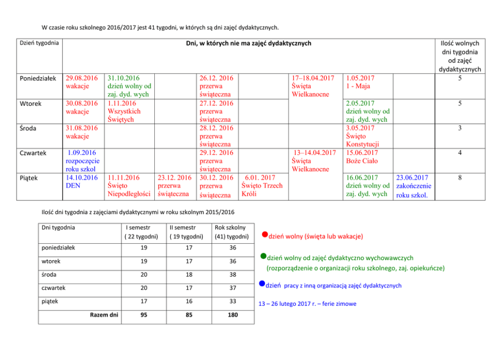 W czasie roku szkolnego 2016/2017 jest 41 tygodni, w których są dni zajęć dydaktycznych. Dzieo tygodnia Dni, w których nie ma zajęć dydaktycznych Poniedziałek 29.08.2016 wakacje Wtorek 30.08.2016 wakacje Środa 31.08.2016 wakacje Czwartek 1.09.2016 rozpoczęcie roku szkol 14.10.2016 DEN Piątek 31.10.2016 dzień wolny od zaj. dyd. wych 1.11.2016 Wszystkich Świętych 11.11.2016 Święto Niepodległości 23.12. 2016 przerwa świąteczna 26.12. 2016 przerwa świąteczna 27.12. 2016 przerwa świąteczna 28.12. 2016 przerwa świąteczna 29.12. 2016 przerwa świąteczna 30.12. 2016 przerwa świąteczna 17–18.04.2017 Święta Wielkanocne 13–14.04.2017 Święta Wielkanocne 6.01. 2017 Święto Trzech Króli 1.05.2017 1 - Maja Ilość wolnych dni tygodnia od zajęć dydaktycznych 5 2.05.2017 dzień wolny od zaj. dyd. wych 3.05.2017 Święto Konstytucji 15.06.2017 Boże Ciało 5 16.06.2017 23.06.2017 dzień wolny od zakończenie zaj. dyd. wych roku szkol. 8 Ilość dni tygodnia z zajęciami dydaktycznymi w roku szkolnym 2015/2016 I semestr ( 22 tygodni) Dni tygodnia II semestr ( 19 tygodni) Rok szkolny (41) tygodni) dzieo wolny (święta lub wakacje) dzieo wolny od zajęć dydaktyczno wychowawczych poniedziałek 19 17 36 wtorek 19 17 36 środa 20 18 38 czwartek 20 17 37 dzieo pracy z inną organizacją zajęć dydaktycznych piątek 17 16 33 13 – 26 lutego 2017 r. – ferie zimowe 95 85 180 Razem dni (rozporządzenie o organizacji roku szkolnego, zaj. opiekuocze) 3 4