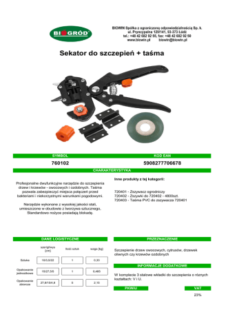 Sekator do szczepień + taśma SYMBOL KOD EAN 760102 5908277706678 CHARAKTERYSTYKA Inne produkty z tej kategorii: Profesjonalne dwufunkcyjne narzędzie do szczepienia drzew i krzewów - owocowych i ozdobnych. Taśma pozwala zabezpieczyć miejsca połączeń przed bakteriami i niekorzystnymi warunkami pogodowymi. 720401 - Zszywacz ogrodniczy 720402 - Zszywki do 720402 - 4800szt. 720403 - Taśma PVC do zszywacza 720401 Narzędzie wykonane z wysokiej jakości stali, umieszczone w obudowie z tworzywa sztucznego, Standardowo nożyce posiadają blokadę. DANE LOGISTYCZNE PRZEZNACZENIE szer/gł/wys [cm] Ilość sztuk waga [kg] Sztuka 10/3,5/22 1 0,33 Opakowanie jednostkowe 15/27,5/5 1 0,485 Opakowanie zbiorcze 27,8/15/4,8 5 2,15 Szczepienie drzew owocowych, cytrusów, drzewek oliwnych czy krzewów ozdobnych INFORMACJE DODATKOWE W komplecie 3 stalowe wkładki do szczepienia o róznych kształtach: V i U. PKWiU VAT 23%