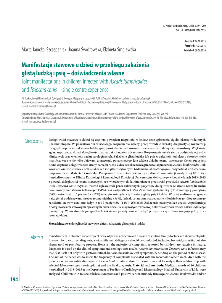 © Pediatr Med Rodz 2016, 12 (2), p. 194–200 DOI: 10.15557/PiMR.2016.0019 Marta Janicka-Szczepaniak, Joanna Świdrowska, Elżbieta Smolewska Received: 06.10.2015 Accepted: 14.01.2016 Published: 30.06.2016 Manifestacje stawowe u dzieci w przebiegu zakażenia glistą ludzką i psią – doświadczenia własne Joint manifestations in children infected with Ascaris lumbricoides and Toxocara canis – single centre experience Klinika Kardiologii i Reumatologii Dziecięcej, Uniwersytet Medyczny w Łodzi, Łódź, Polska. Kierownik Kliniki: prof. dr hab. n. med. Jerzy Stańczyk Adres do korespondencji: Marta Janicka-Szczepaniak, Klinika Kardiologii i Reumatologii Dziecięcej Uniwersytetu Medycznego w Łodzi, ul. Sporna 36/50, 91-738 Łódź, tel.: +48 605 515 180, e-mail: [email protected] Department of Paediatric Cardiology and Rheumatology of the Medical University of Lodz, Łódź, Poland. Head of the Department: Professor Jerzy Stańczyk, MD, PhD Correspondence: Marta Janicka-Szczepaniak, Department of Paediatric Cardiology and Rheumatology of the Medical University of Lodz, Sporna 36/50, 91-738 Łódź, Poland, tel.: +48 605 515 180, e-mail: [email protected] Streszczenie Dolegliwości stawowe u dzieci są częstym powodem niepokoju rodziców oraz zgłaszania się do lekarzy rodzinnych i reumatologów. W poszukiwaniu właściwego rozpoznania należy przeprowadzić szeroką diagnostykę różnicową, uwzględniając m.in. zakażenia bakteryjne, pasożytnicze, ale również proces reumatoidalny czy rozrostowy. Większość zgłaszanych przez dzieci dolegliwości ma jednak charakter odczynowy. Rozpoznanie ustala się na podstawie objawów klinicznych oraz wyników badań serologicznych. Zakażenie glistą ludzką lub psią w zależności od okresu choroby może manifestować się nie tylko objawami z przewodu pokarmowego, lecz także z układu kostno-stawowego. Celem pracy jest ocena częstości dolegliwości ze strony narządu ruchu u dzieci z obecnością przeciwciał przeciwko Ascaris lumbricoides i/lub Toxocara canis w surowicy oraz analiza ich związku z wybranymi badaniami laboratoryjnymi (eozynofilia) i ostatecznym rozpoznaniem. Materiał i metody: Przeprowadzono retrospektywną analizę dokumentacji medycznej 86 dzieci hospitalizowanych w Klinice Kardiologii i Reumatologii Dziecięcej Uniwersytetu Medycznego w Łodzi w latach 2013–2015 z powodu dolegliwości kostno-stawowych, ze stwierdzonym dodatnim mianem przeciwciał przeciwko Ascaris lumbricoides i/lub Toxocara canis. Wyniki: Wśród zgłaszanych przez zakażonych pacjentów dolegliwości ze strony narządu ruchu dominowały bóle stawów kolanowych (51%) oraz nadgarstków (19%). Zakażenie glistą ludzką było dominującą parazytozą (66%), natomiast u 15 pacjentów (17%) wykryto koincydencję infestacji glistą psią i ludzką. W całej analizowanej grupie najczęściej podejrzewano proces reumatoidalny (36%), jednak ostateczne rozpoznanie młodzieńczego idiopatycznego zapalenia stawów ustalono jedynie u 12 pacjentów (14%). Wnioski: Zakażenia pasożytnicze często współistnieją z dolegliwościami stawowymi zgłaszanymi przez dzieci. W diagnostyce różnicowej bólów stawowych zawsze należy wykluczyć parazytozy. W niektórych przypadkach zakażenie pasożytami może być jednym z czynników inicjujących proces reumatoidalny. Słowa kluczowe: dolegliwości stawowe, dzieci, zakażenie glistą psią i ludzką Abstract 194 Joint disorders in children are a frequent cause of parents’ concern and a reason of visiting family doctors and rheumatologists. In search for the correct diagnosis, a wide differential diagnosis should be conducted, including bacterial, parasitic, but also rheumatoid or proliferative process. However, the majority of complaints reported by children are reactive in nature. Diagnosis is based on the clinical symptoms and serology tests results. Ascaris lumbricoides or Toxocara canis infection may manifest itself not only with gastrointestinal, but also musculoskeletal symptoms, depending on the period of the disease. The aim of the paper was to assess the frequency of complaints associated with the locomotor system in children with the presence of serum antibodies against Ascaris lumbricoides and/or Toxocara canis and to analyse their relationship with selected laboratory tests (eosinophilia) and the final diagnosis. Material and methods: Medical records of 86 children hospitalised in 2013–2015 at the Department of Paediatric Cardiology and Rheumatology, Medical University of Łódź, were analysed. Children with musculoskeletal symptoms and positive serum antibody titres against Ascaris lumbricoides and/or © Medical Communications Sp. z o.o. This is an open-access article distributed under the terms of the Creative Commons Attribution-NonCommercial-NoDerivatives License (CC BY-NC-ND). Reproduction is permitted for personal, educational, non-commercial use, provided that the original article is in whole, unmodified, and properly cited. Manifestacje stawowe u dzieci w przebiegu zakażenia glistą ludzką i psią – doświadczenia własne Joint manifestations in children infected with Ascaris lumbricoides and Toxocara canis – single centre experience Toxocara canis were included in the study. Results: Among the infected patients, the most frequently reported complaint from the locomotor system was knee (51%) and wrist (19%) pain. Ascaris lumbricoides infection was the dominant human parasitosis (66%), while in 15 patients (17%) Toxocara canis co-infestation was detected. Rheumatoid process was the most common suspicion (36%), but the final diagnosis of juvenile idiopathic arthritis was determined in only 12 patients (14%). Conclusions: Parasitic infections often coexist with articular symptoms reported by children and should always be excluded in the differential diagnosis. In some cases, a parasitic infection may be one of the factors that initiate the rheumatoid process. Key words: joint co