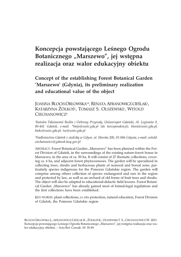 Koncepcja powstaj¹cego Leœnego Ogrodu Botanicznego „Marszewo”, jej wstêpna realizacja oraz walor edukacyjny obiektu Concept of the establishing Forest Botanical Garden ‘Marszewo’ (Gdynia), its preliminary realization and educational value of the object JOANNA BLOCH-OR£OWSKA1*, RENATA AFRANOWICZ-CIEŒLAK1, KATARZYNA ¯Ó£KOŒ1, TOMASZ S. OLSZEWSKI1, WITOLD CIECHANOWICZ2 Katedra Taksonomii Roœlin i Ochrony Przyrody, Uniwersytet Gdañski, Al. Legionów 9, 80-441 Gdañsk, e-mail: *[email protected] (do korespondencji), [email protected], [email protected], [email protected] ! Nadleœnictwo Gdañsk z siedzib¹ w Gdyni, ul. Morska 200, 81-006 Gdynia, e-mail: witold. [email protected] ABSTRACT: Forest Botanical Garden „Marszewo” has been planned within the Forest Division of Gdañsk, in the surroundings of the existing nature-forest house in Marszewo, in the area of ca. 50 ha. It will consist of 27 thematic collections, covering ca. 6 ha, and adjacent forest phytocoenoses. The garden will be specialized in collecting trees, shrubs and herbaceous plants of nemoral and boreal zone, particularly species indigenous for the Pomorze Gdañskie region. The garden will comprise among others collection of species endangered and rare in the region and protected by law, as well as an orchard of old forms of fruit trees and shrubs. The object will also be adapted to educational-didactic field lessons. Forest Botanical Garden „Marszewo” has already gained most of formal-legal regulations and the first collections have been established. KEY WORDS: plant collections, ex situ protection, natural education, Forest Division of Gdañsk, the Pomorze Gdañskie region BLOCH-OR£OWSKA J., AFRANOWICZ-CIEŒLAK R., ¯Ó£KOŒ K., OLSZEWSKI T. S., CIECHANOWICZ W. 2011. Koncepcja powstaj¹cego Leœnego Ogrodu Botanicznego „Marszewo”, jej wstêpna realizacja oraz walor edukacyjny obiektu. – Acta Bot. Cassub. 10: 35-49. 36 J. Bloch-Or³owska, R. Afranowicz-Cieœlak, K. ¯ó³koœ, T. S. Olszewski, W. Ciechanowicz Wprowadzenie Ogrody botaniczne i arboreta pe³ni¹ istotn¹ funkcjê dydaktyczn¹, rekreacyjn¹ oraz upowszechniania wiedzy o przyrodzie. Jednoczeœnie wykorzystywane s¹ w celach naukowo-badawczych oraz ochrony ex situ rzadkich i zagro¿onych gatunków i odmian, szczególnie krajowych (Werblan-Jakubiec i in. 2003; Symonides 2008). W Polsce istniej¹ obecnie 32 tego typu obiekty, zarejestrowane i zrzeszone w Polskim Towarzystwie Ogrodów Botanicznych (http://www.ptob. org.pl/ogrody.htm). Nale¿y do nich m.in. 8 arboretów i ogrodów dendrologicznych nale¿¹cych do Lasów Pañstwowych. W Lasach Pañstwowych arboreta lub ogrody dendrologiczne zak³adane s¹ zwykle w bezpoœrednim s¹siedztwie budynków nale¿¹cych do Nadleœnictw. Pe³ni¹ funkcje dydaktyczne, a jednoczeœnie wzbogacaj¹ i upiêkszaj¹ lokalny krajobraz. Innymi obiektami tworzonymi na terenach Lasów Pañstwowych s¹ izby przyrodniczo-leœne. Jednym z g³ównych ich zadañ jest edukacja dzieci i m³odzie¿y w zakresie wiedzy o lesie i ochronie przyrody, a szerzej o œrodowisku przyrodniczym, realizowana poprzez bezpoœredni, ukierunkowany kontakt z przyrod¹. Wi¹¿e siê z tym tak¿e kszta³towanie postaw i œwiadomoœci ekologicznej lokalnych spo³ecznoœci. W 2008 r. stworzono koncepcjê uniwersalnego obiektu, który ³¹czy³by wielostronn¹ funkcjê obiektu przyrodniczo-dydaktycznego oraz ogrodu botanicznego. Jego utworzenie zaplanowano wokó³ istniej¹cej izby przyrodniczo-leœnej w Marszewie, na terenie Nadleœnictwa Gdañsk. Oœrodek ten, pod nazw¹ – Leœny Ogród Botaniczny „Marszewo”, zak³adany jest przez Nadleœnictwo, we wspó³pracy z Katedr¹ Taksonomii Roœlin i Ochrony Przyrody Uniwersytetu Gdañskiego. Planowane jest równie¿ wspó³dzia³anie z innymi jednostkami – m.in. Urzêdem Miasta Gdyni oraz organizacjami pozarz¹dowymi. Niniejsza praca powsta³a na podstawie opracowania „Leœny Ogród Botaniczny w Marszewie – projekt zagospodarowania terenu w pobli¿u oœrodka edukacji przyrodniczo-leœnej „Marszewo” (¯ó³koœ i in. 2008), przygotowanego na zlecenie Nadleœnictwa Gdañsk. 1. Lokalizacja obiektu Tworzony Leœny Ogród Botaniczny znajduje siê na terenie Nadleœnictwa Gdañsk, leœnictwa Cisowa, w oddz. 195 i 210, oko³o 4 km na po³udniowy zachód od Gdyni-Chylonii, przy szosie Gdynia – Koleczkowo (ryc. 1), w obrêbie Trójmiejskiego Parku Krajobrazowego oraz Leœnego Kompleksu Promocyjnego „Lasy Oliwsko-Dar¿lubskie”. Zajmowaæ on bêdzie powierzchniê blisko 50 ha, przy czym tworzone kolekcje, wraz z infrastruktur¹ istniej¹cej izby przyrodniczo-leœnej, zajm¹ powierzchniê nieco ponad 6 ha, resztê zaœ stanowiæ bêd¹ s¹siaduj¹ce z nimi fitocenozy leœne. W bezpoœrednim s¹siedztwie ogrodu prze- Koncepcja powstaj¹cego Leœnego Ogrodu Botanicznego „Marszewo”... 37 biega œcie¿ka przyrodniczo-leœna „Lasy Chyloñskie” (Markowski, Kowalewski 1999). 2. Charakterystyka terenu i podstawowe elementy szaty roœlinnej Teren planowanego obiektu le¿y w krawêdziowej strefie Wysoczyzny Kaszubskiej i obejmuje fragment doliny niewielkiego cieku – Marszewskiej Strugi. Ta niewielka, sucha czêœæ doliny o stromych zboczach otoczona jest ze wszystkich stron wyniesieniami morenowymi, na których wystêpuj¹ ró¿ne typy lasów. Jej centralna czêœæ zajêta jest natomiast przez fitocenozy nieleœne. Znaczne zró¿nicowanie wysokoœciowe, rozmaita ekspozycja zboczy i zmienne stosunki wodne stworzy³y dogodne warunki do powstania tu wielu siedlisk i zwi¹zanych z nimi zbiorowisk roœlinnych. Dodatkowym czynnikiem wp³ywaj¹cym na ich rozmaitoœæ jest dzia³alnoœæ cz³owieka, zarówno przesz³a, jak i teraŸniejsza. Obszar, na którym ma powstaæ wiêkszoœæ kolekcji, by³ w przesz³oœci u¿ytkowany rolniczo i stanowi³ czêœæ osady leœnej Marszewo. Lasy otaczaj¹ce „Marszewo” równie¿ podlega³y przemianom w wyniku dzia³alnoœci cz³owieka, przejawiaj
